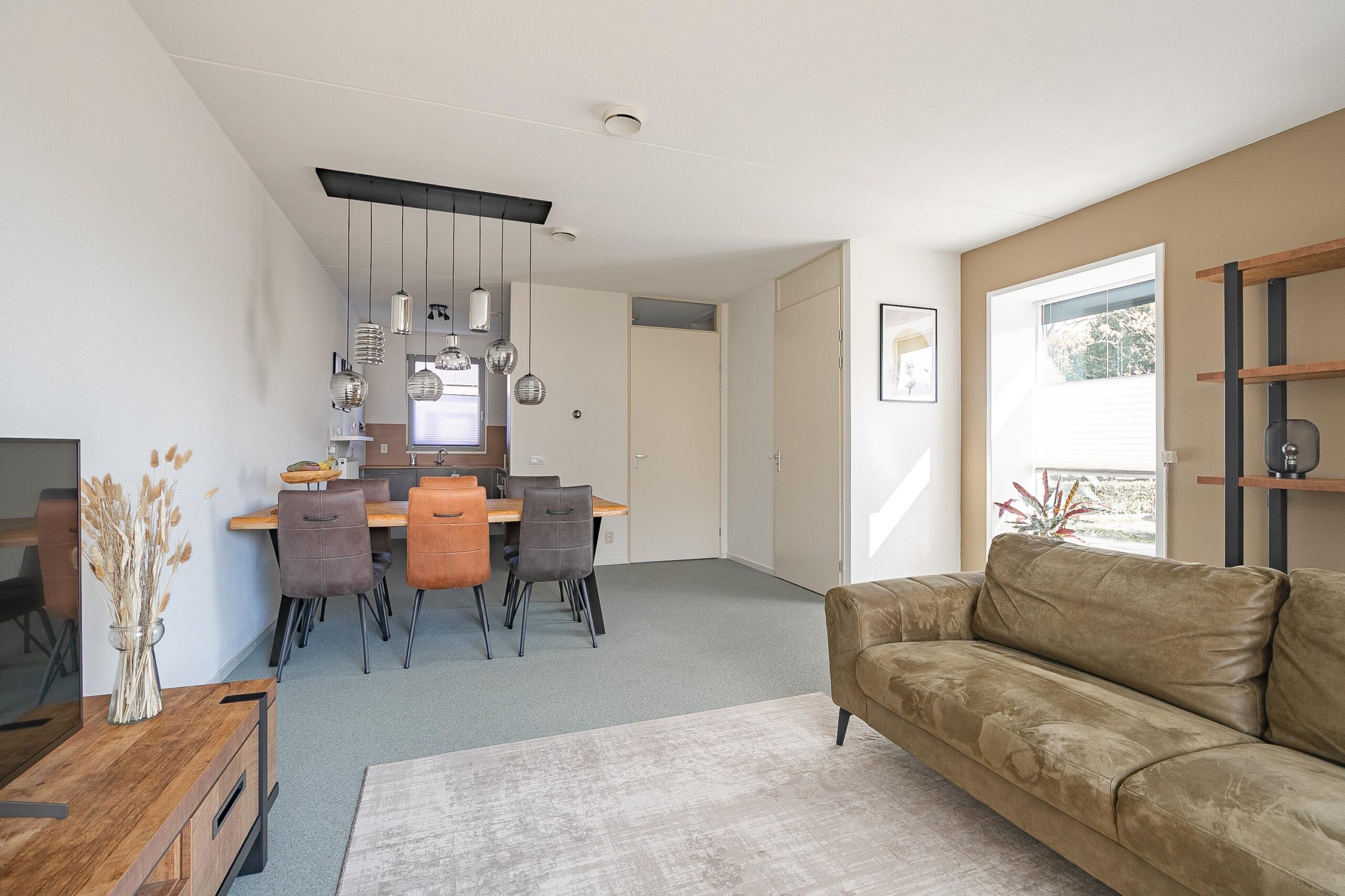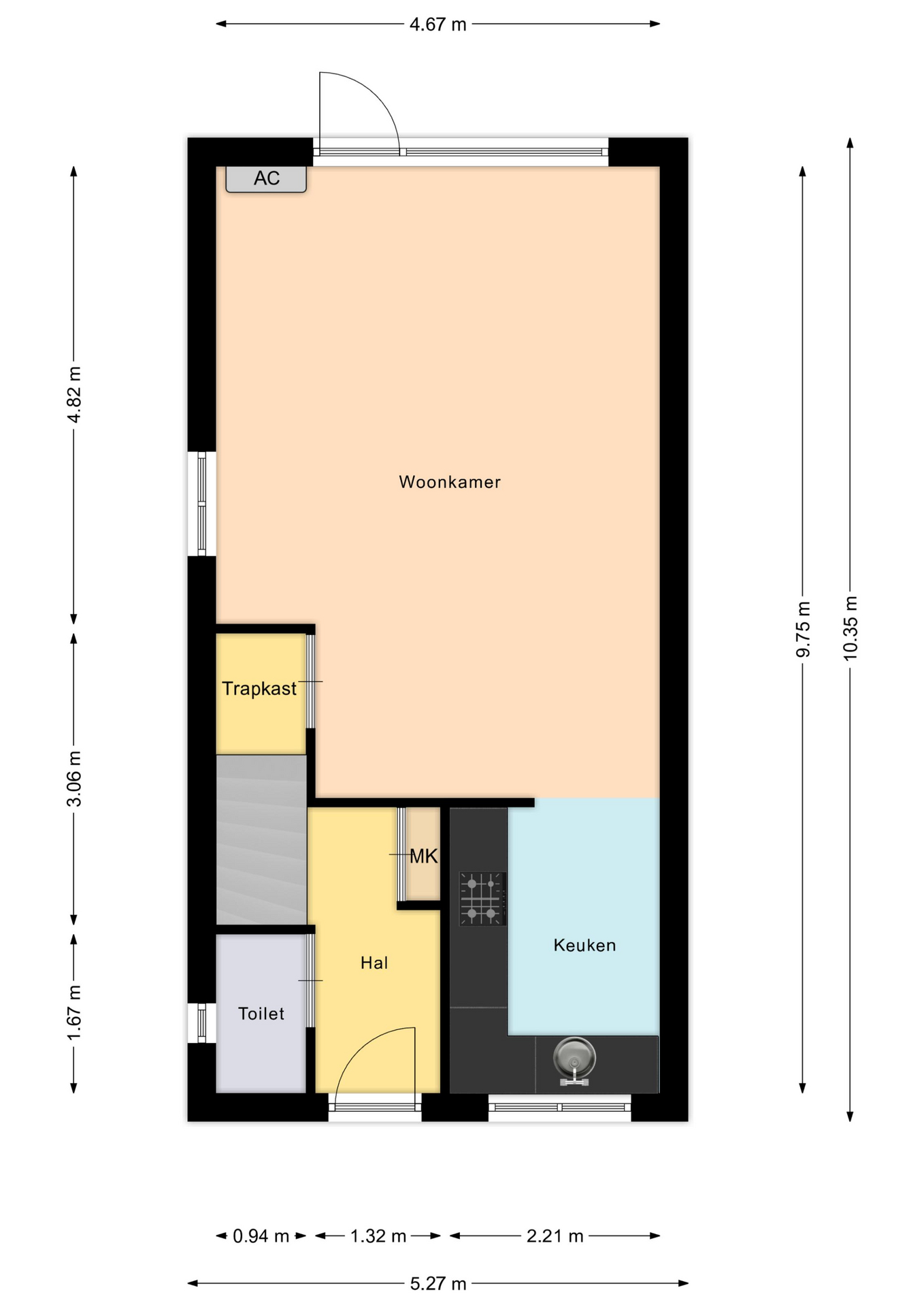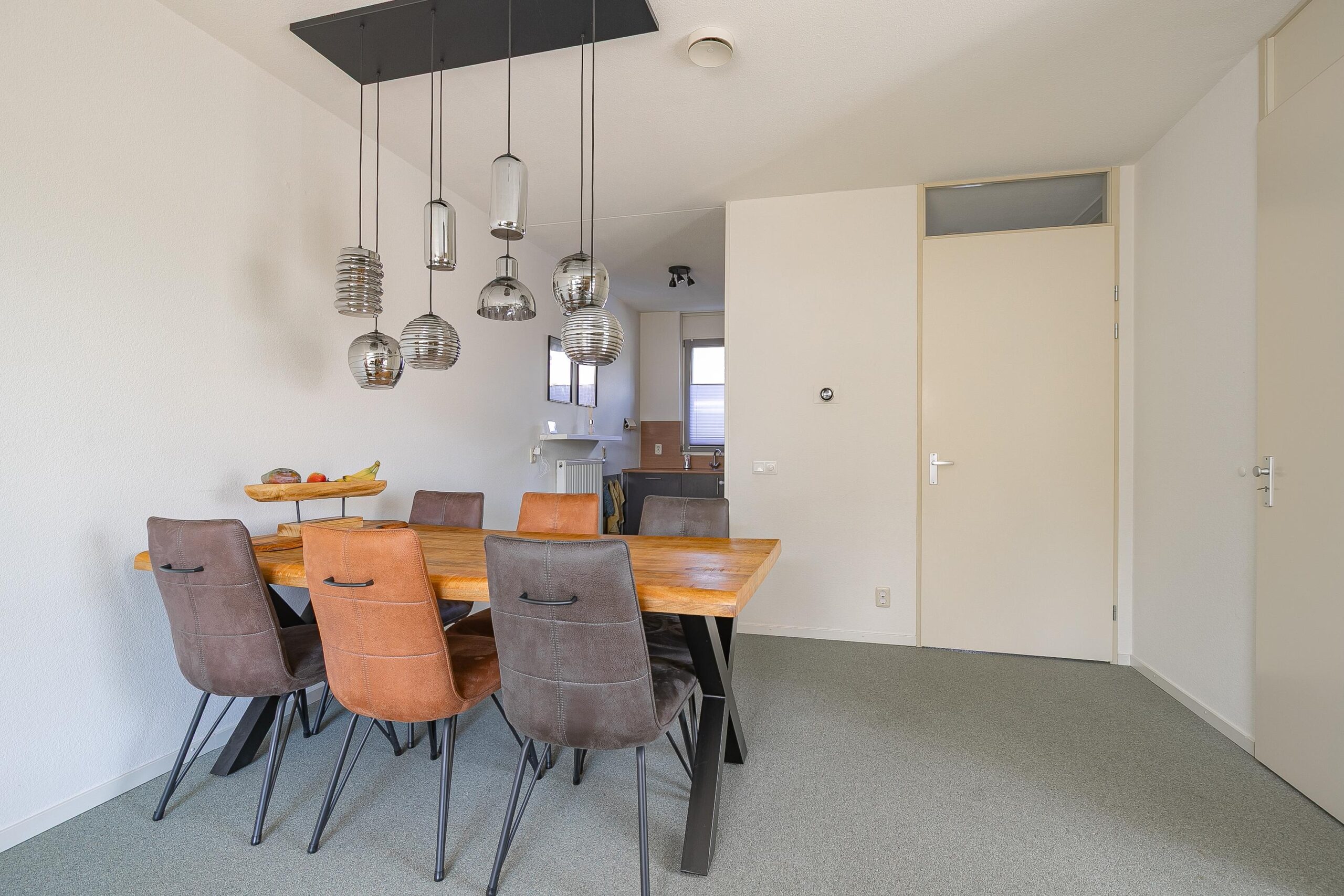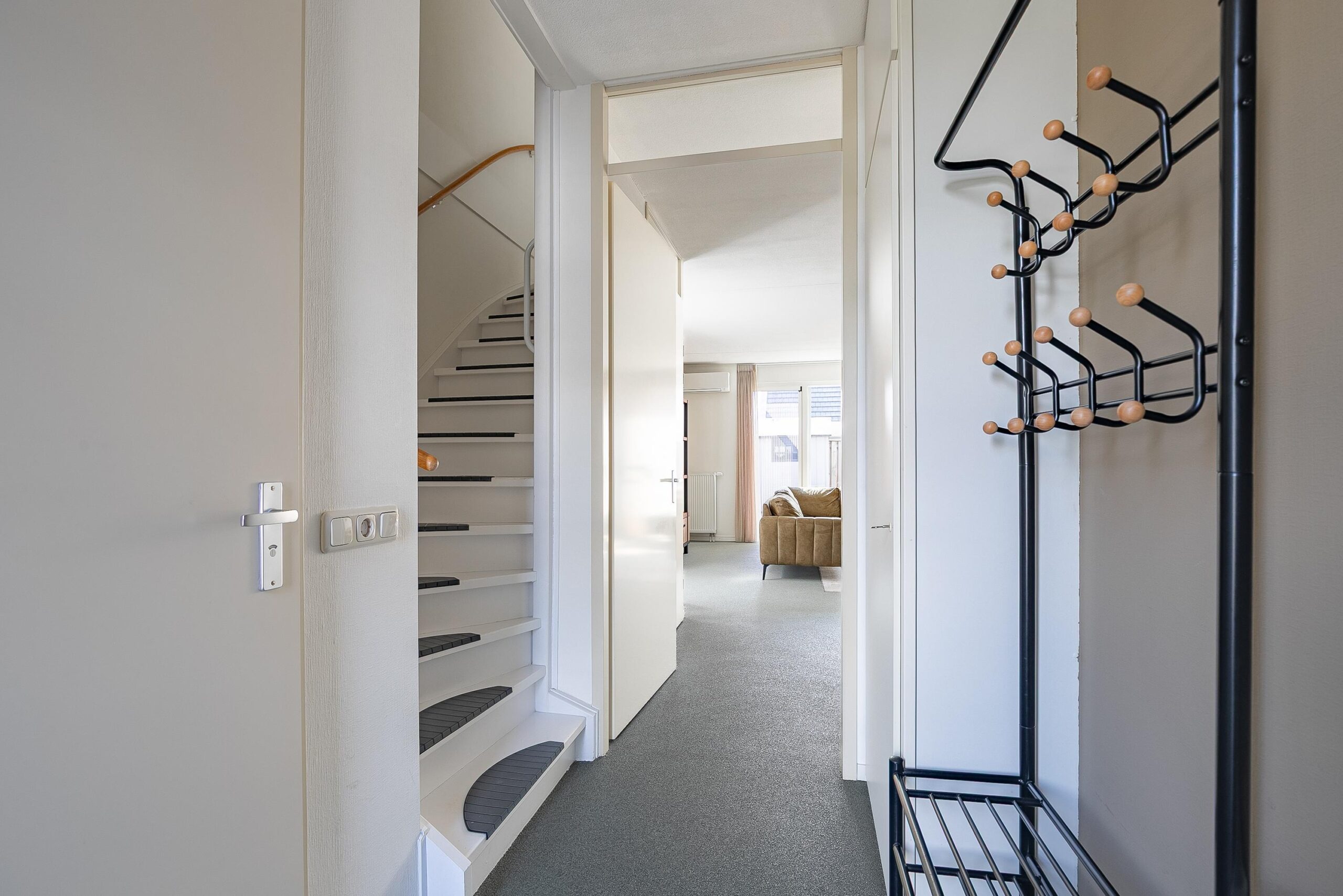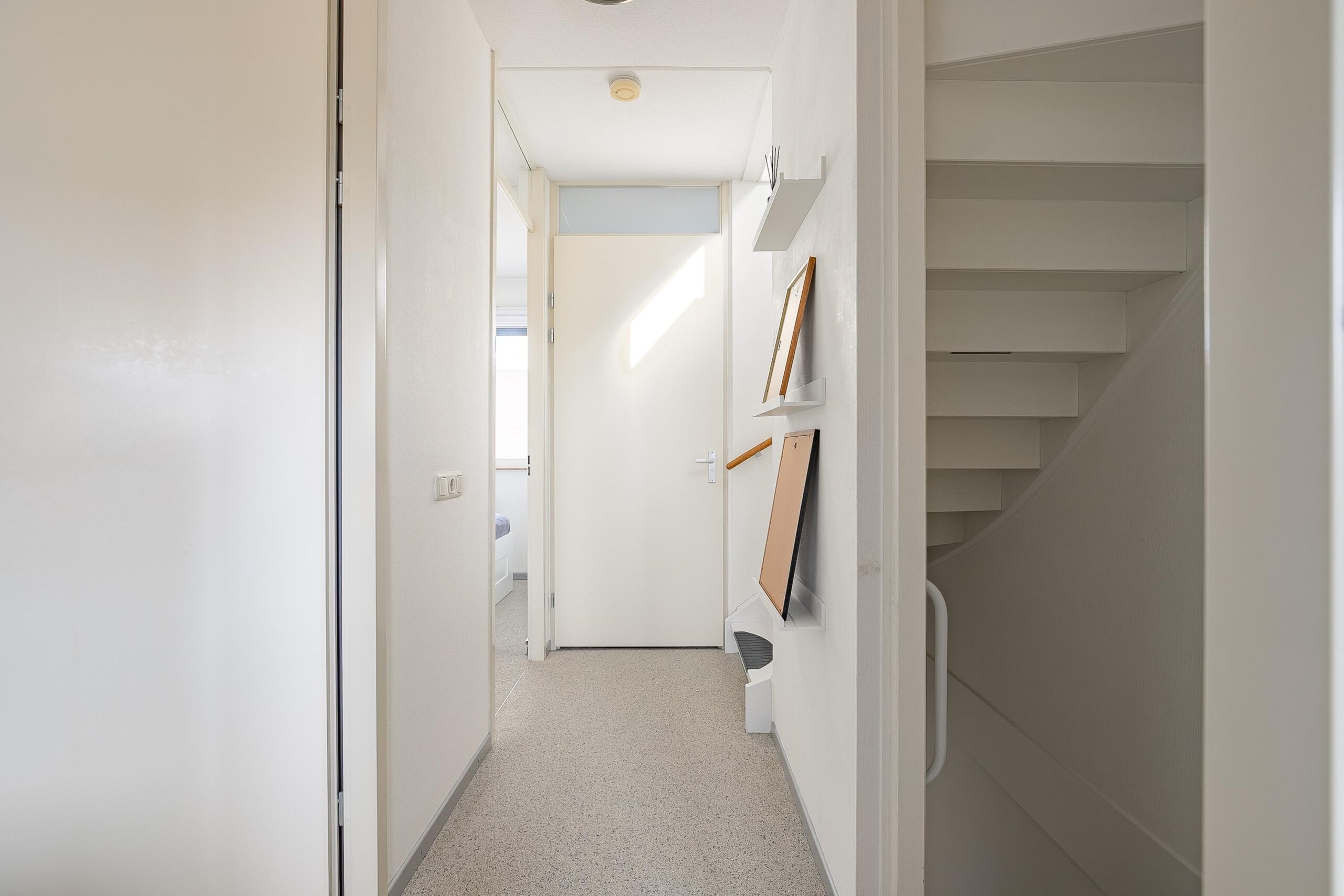 Entree/hal voorzien van een grindvloer, meterkast, trapopgang, toilet en toegang tot de leefruimte. Het toilet is volledig betegeld en voorzien van een staand closet en fonteintje. De royale leefruimte met open keuken is eveneens voorzien van een grindvloer, airco en van veel lichtinval. De keuken aan de voorzijde beschikt over een hoekopstelling met diverse inbouwapparatuur: gaskookplaat, afzuigkap, koelkast, oven-magnetron van Etna (2024), gootsteen en een nieuwe Bosch vaatwasser (2025). Vanuit de woonkamer is er toegang tot de achtertuin en extra bergruimte onder de trap.
