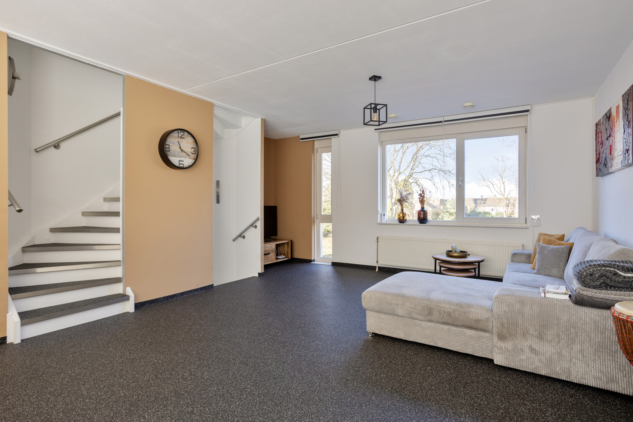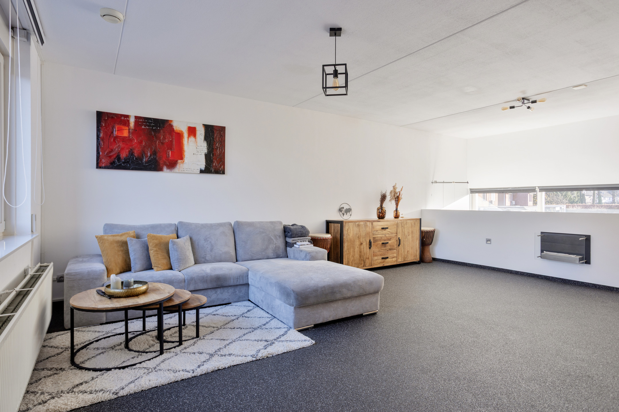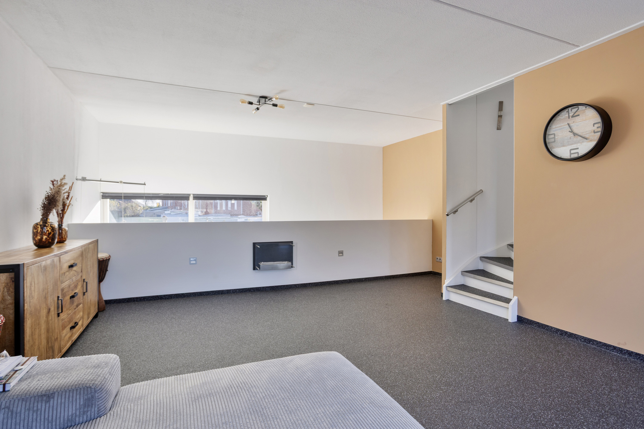 Via vaste trap bereikt u de eerste verdieping. De ruime woonkamer is voorzien van een grindvloer. De vide maakt het geheel open en speels tegelijk.