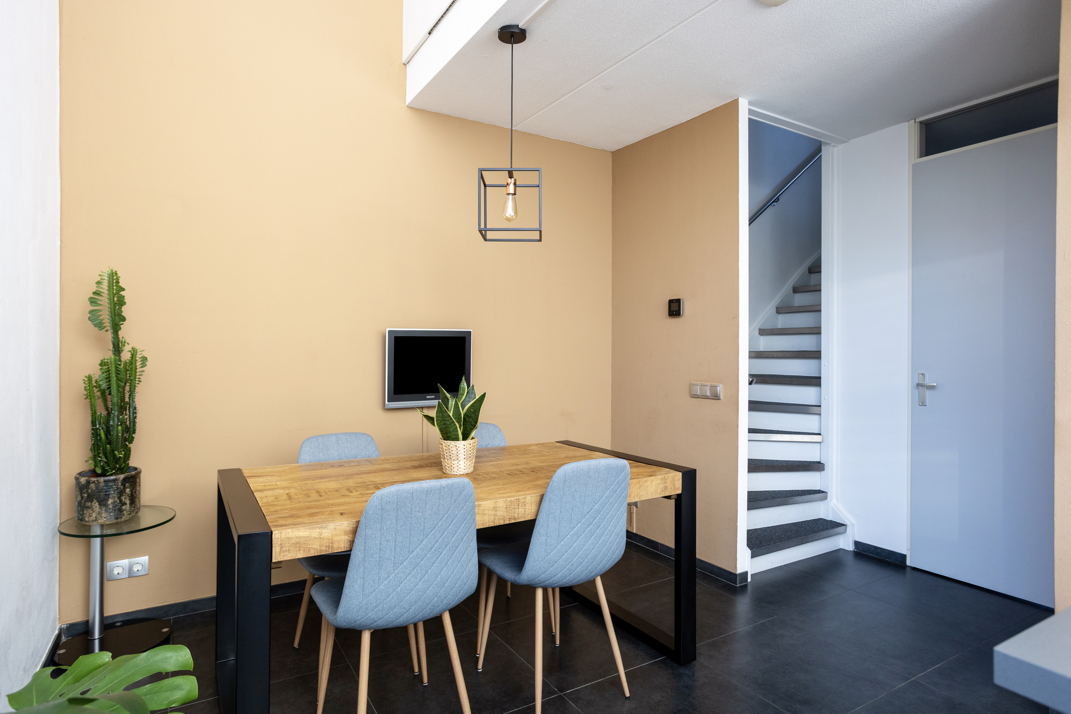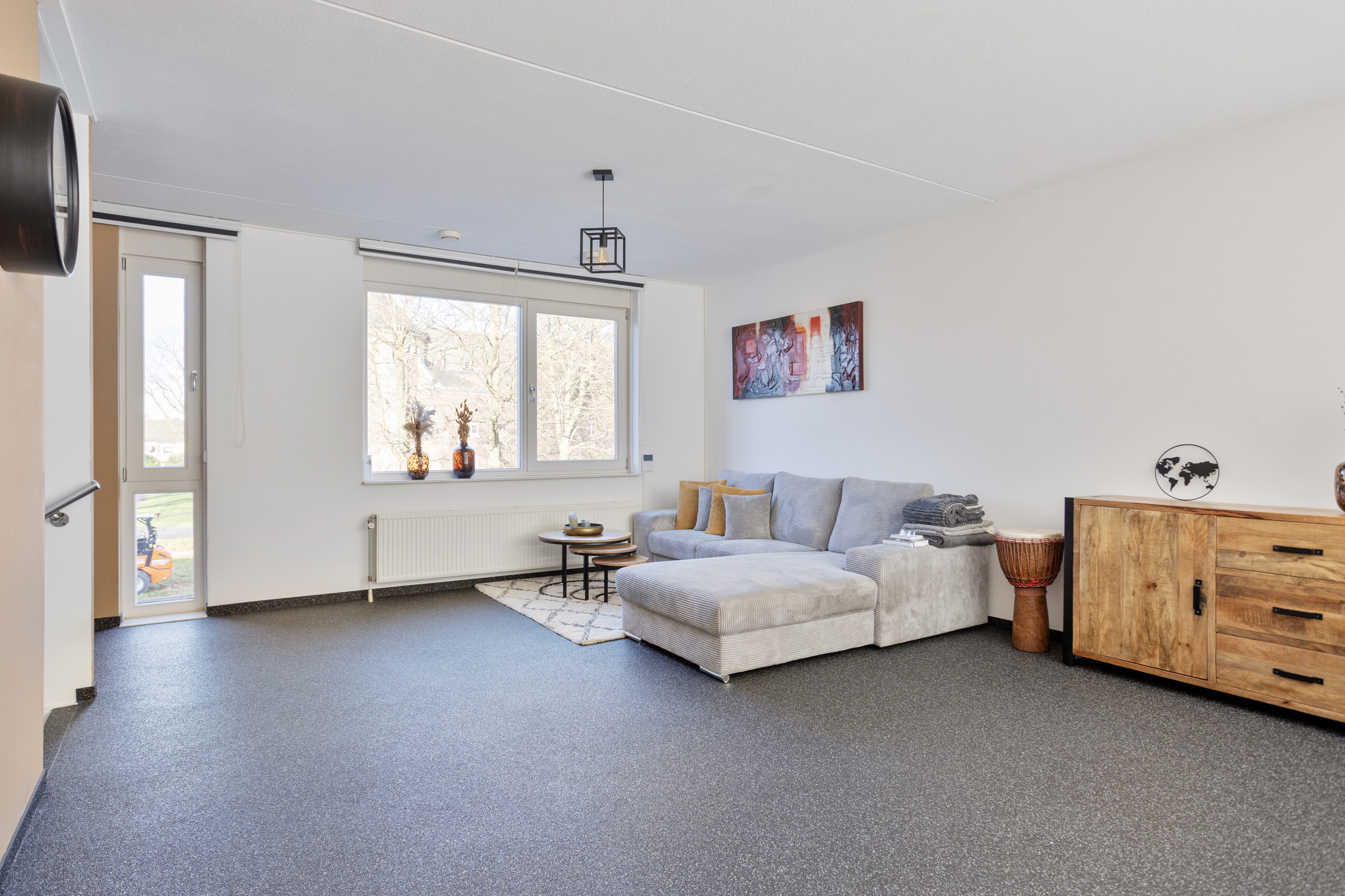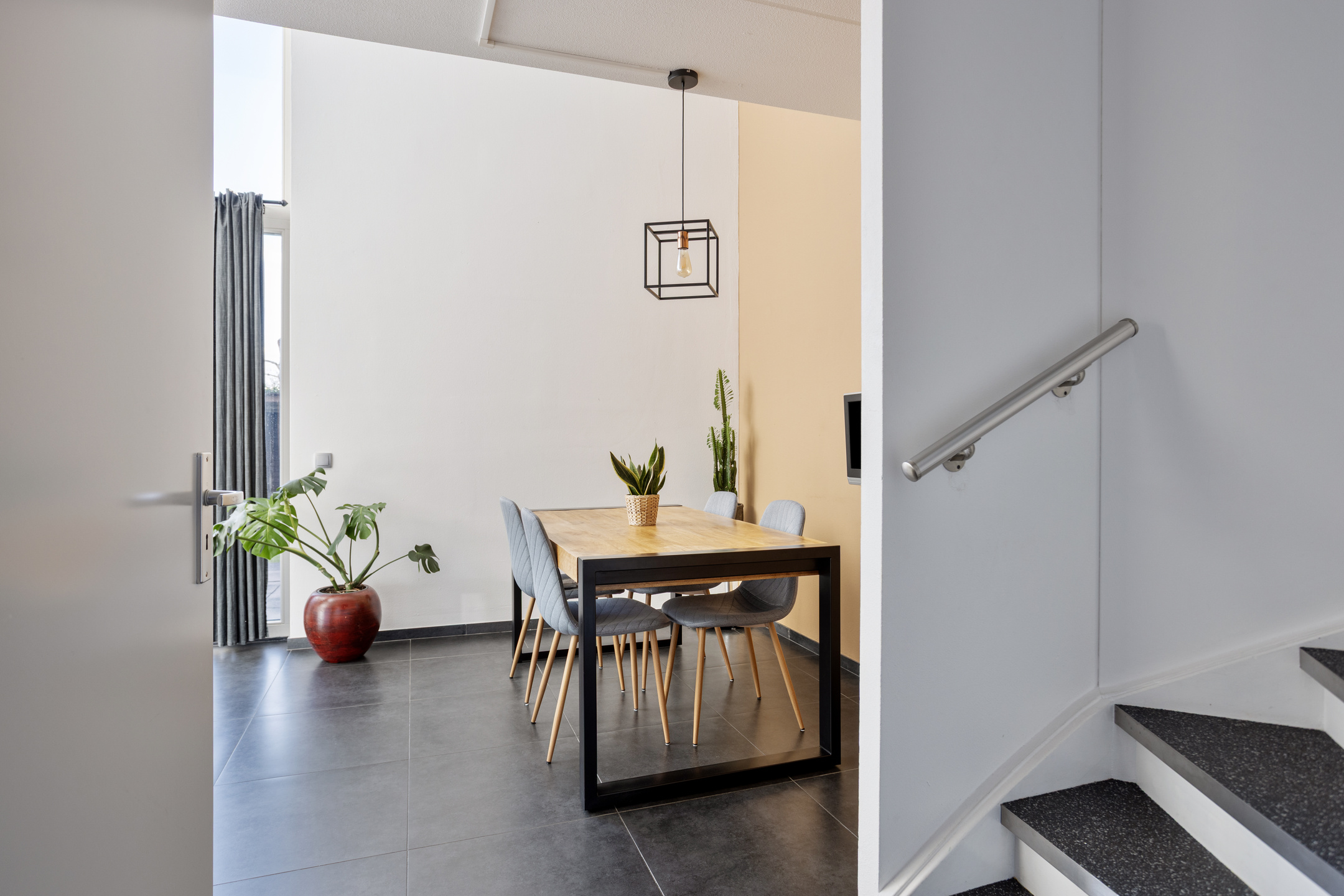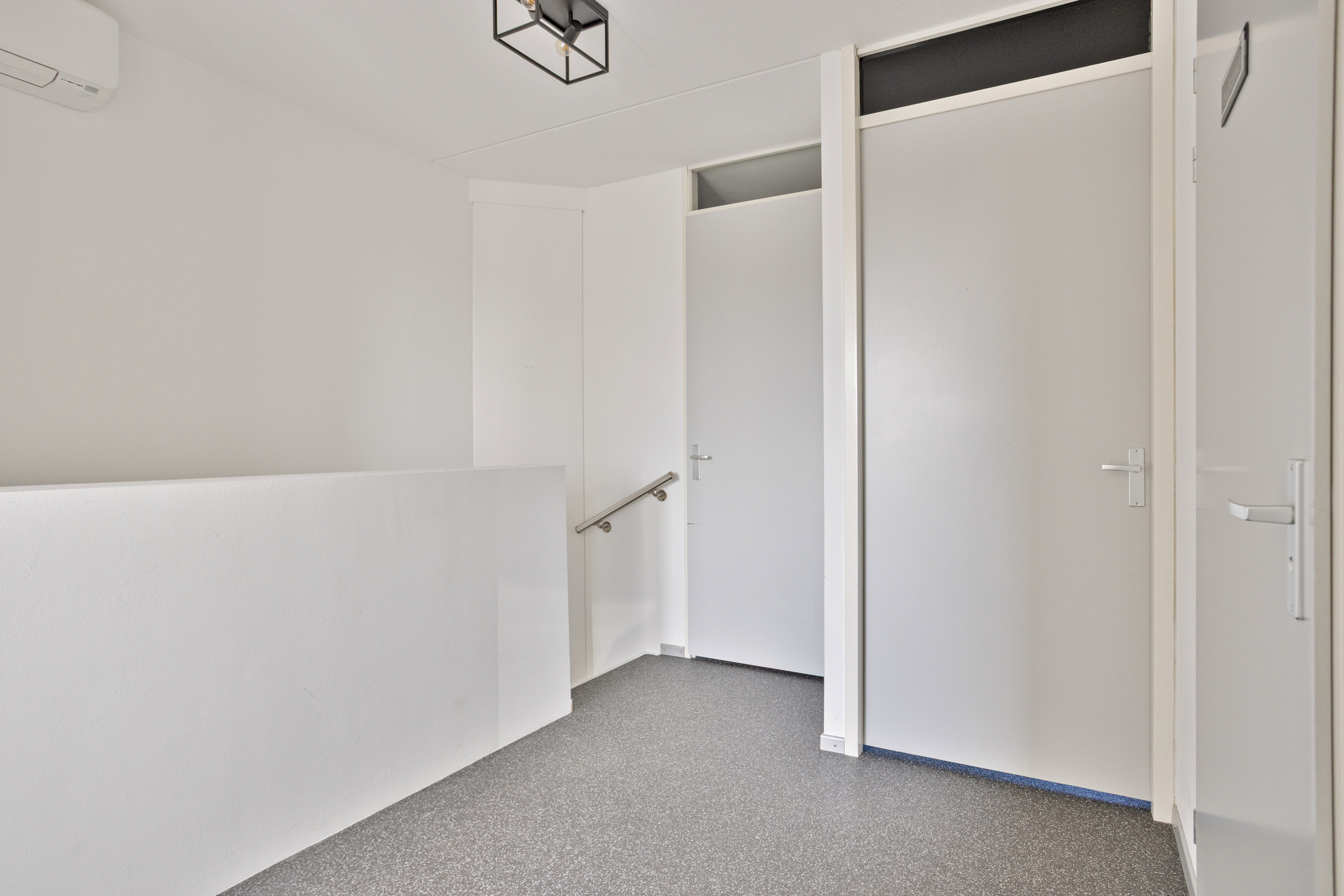Via vaste trap bereikt u de eerste verdieping. De ruime woonkamer is voorzien van een grindvloer. De vide maakt het geheel open en speels tegelijk.