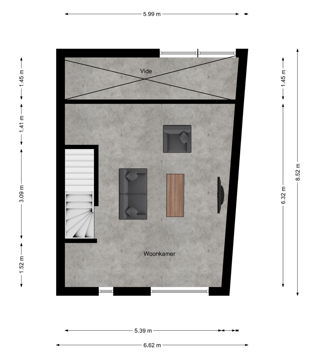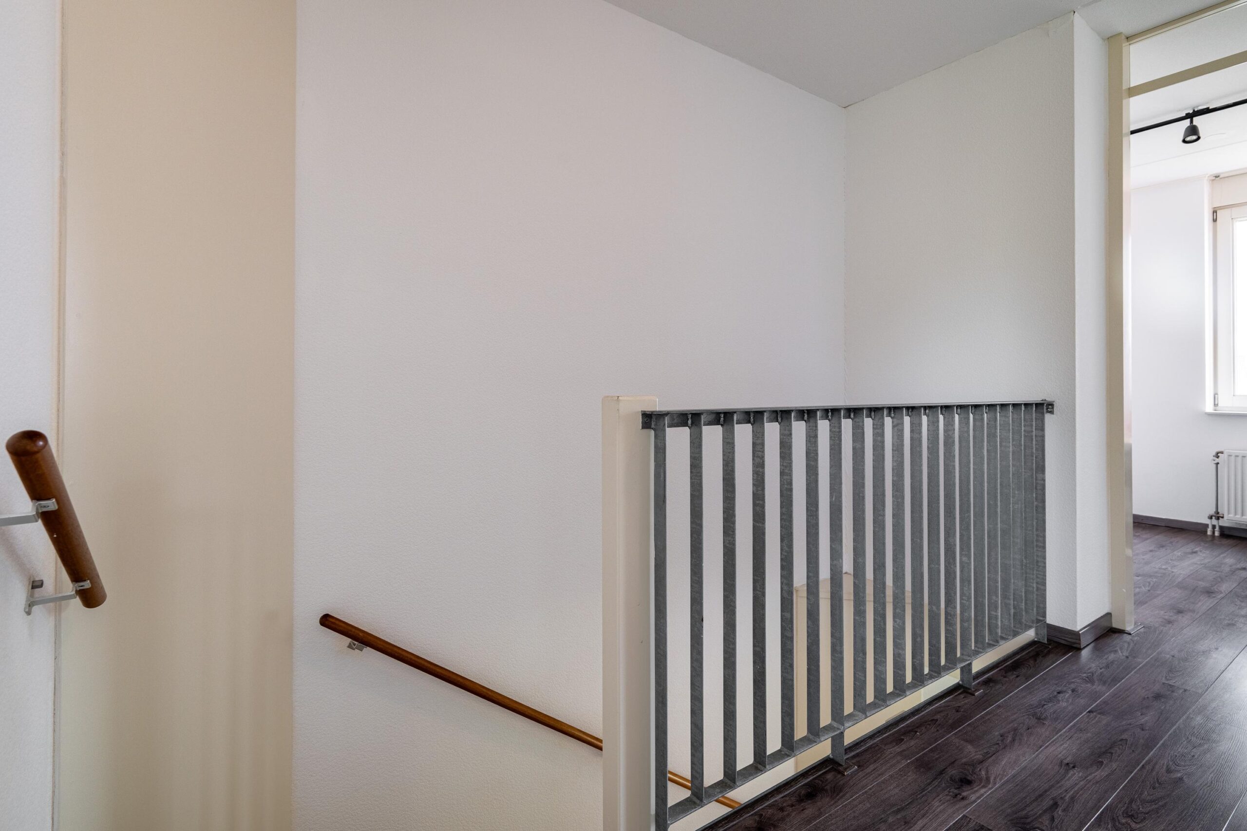 open trap naar woonkamer met vide. Ook deze ruimte is voorzien van een grindvloer.