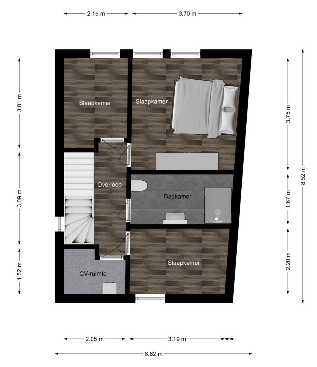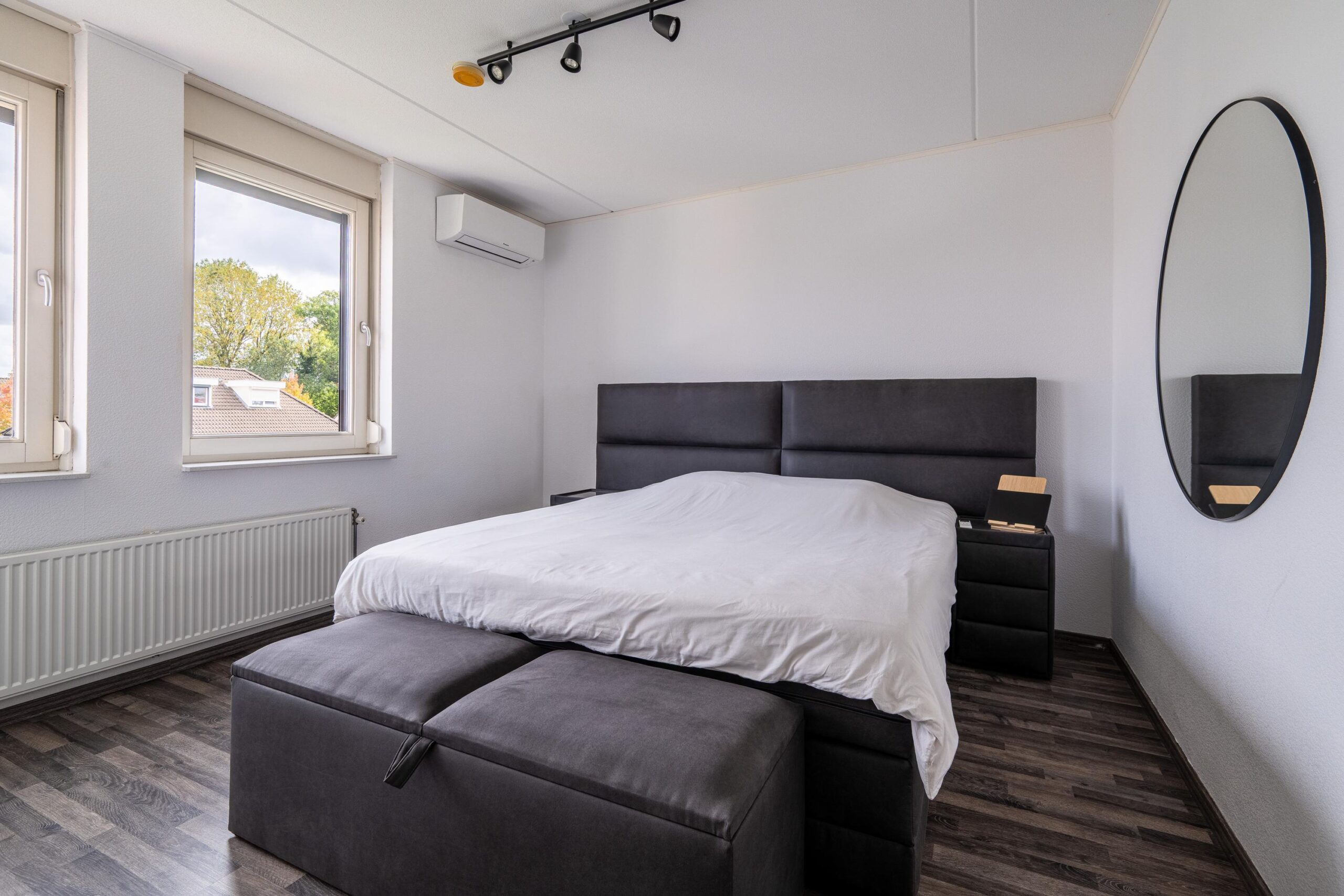 Open trap naar gesloten slaapverdieping. Overloop, drie slaapkamers en de moderne badkamer met inloopdouche, badmeubel en 2e toilet. Deze verdieping is ook van airco voorzien. Tevens is er een bergruimte waar de techniek zich bevindt zoals de WtW-installatie en de C.V.-combi-HR installatie.