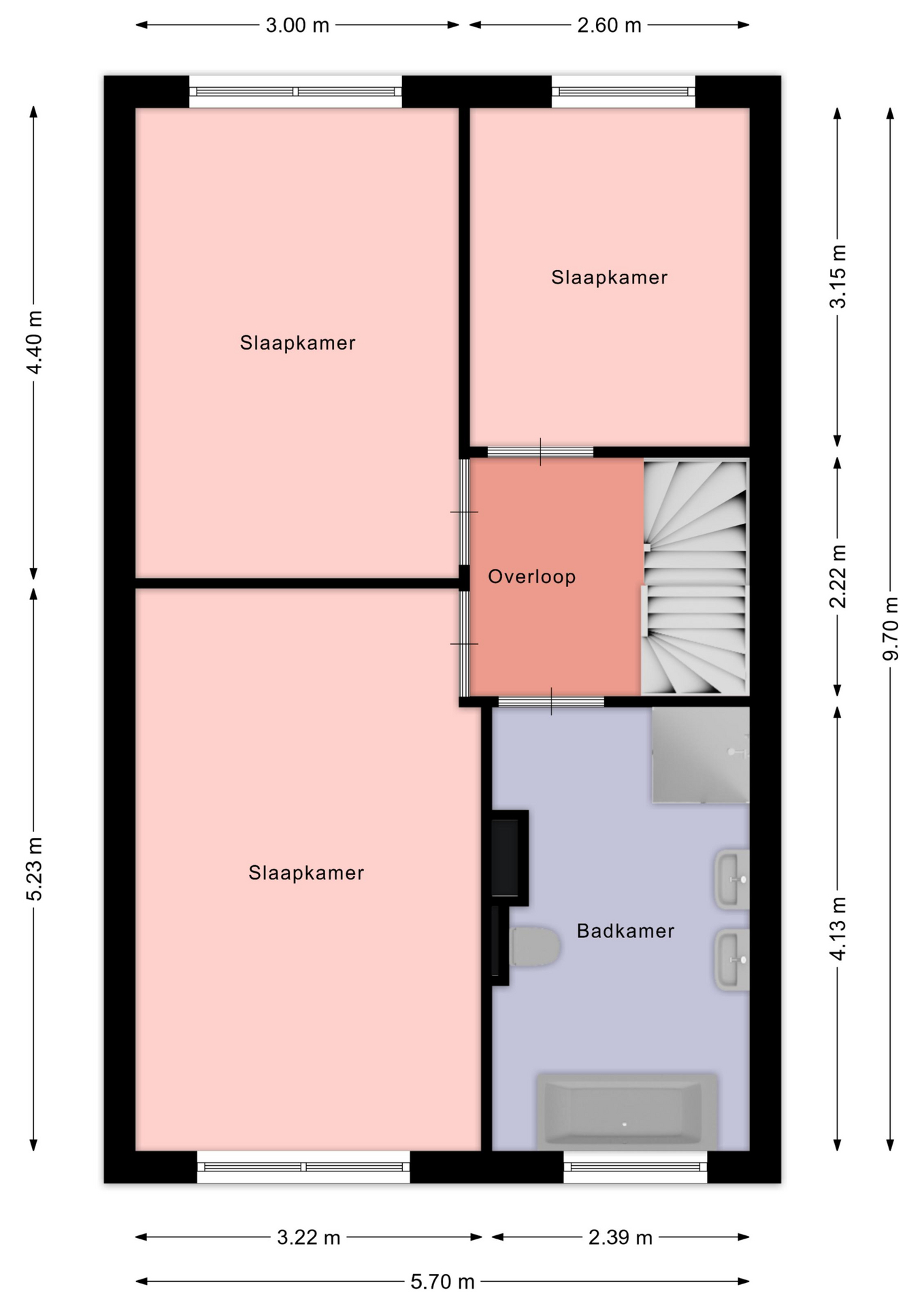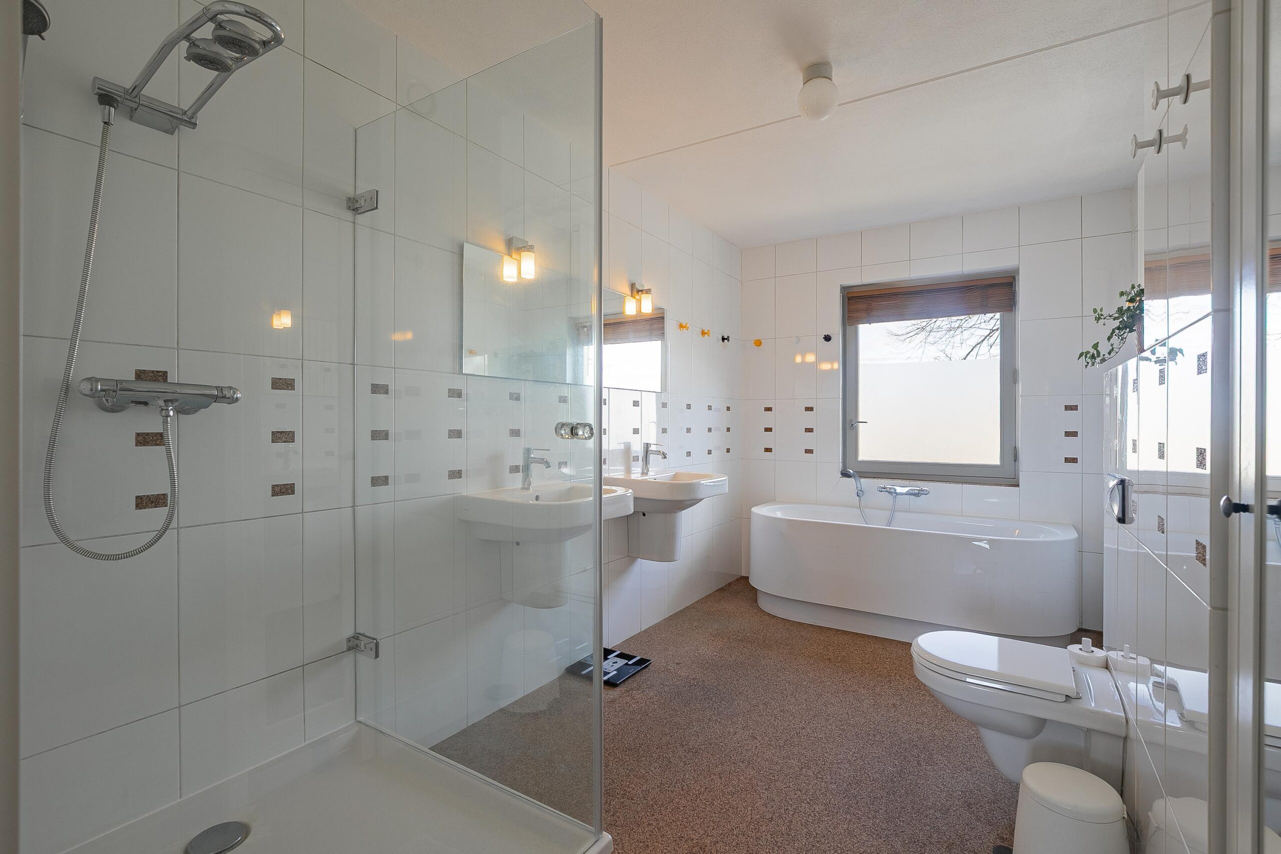 Middels een vaste trap te bereiken ruimtelijke overloop welke toegang biedt tot 3 slaapkamers, de badkamer en de trapopgang naar de 2e verdieping. De slaapkamers (ca. 17, 13 en 8m²) zijn allen voorzien van mooie lichtgrijze laminaatvloeren, glad gestucte wanden en hardhouten kozijnen met isolerende HR++ beglazing. De luxe uitgevoerde badkamer (ca. 10m²) is geheel betegeld en voorzien van een douche, dubbele wastafel, ligbad, design radiator en een wandcloset. Het geheel is hoogwaardig afgewerkt met een grindvloer en mechanische ventilatie.