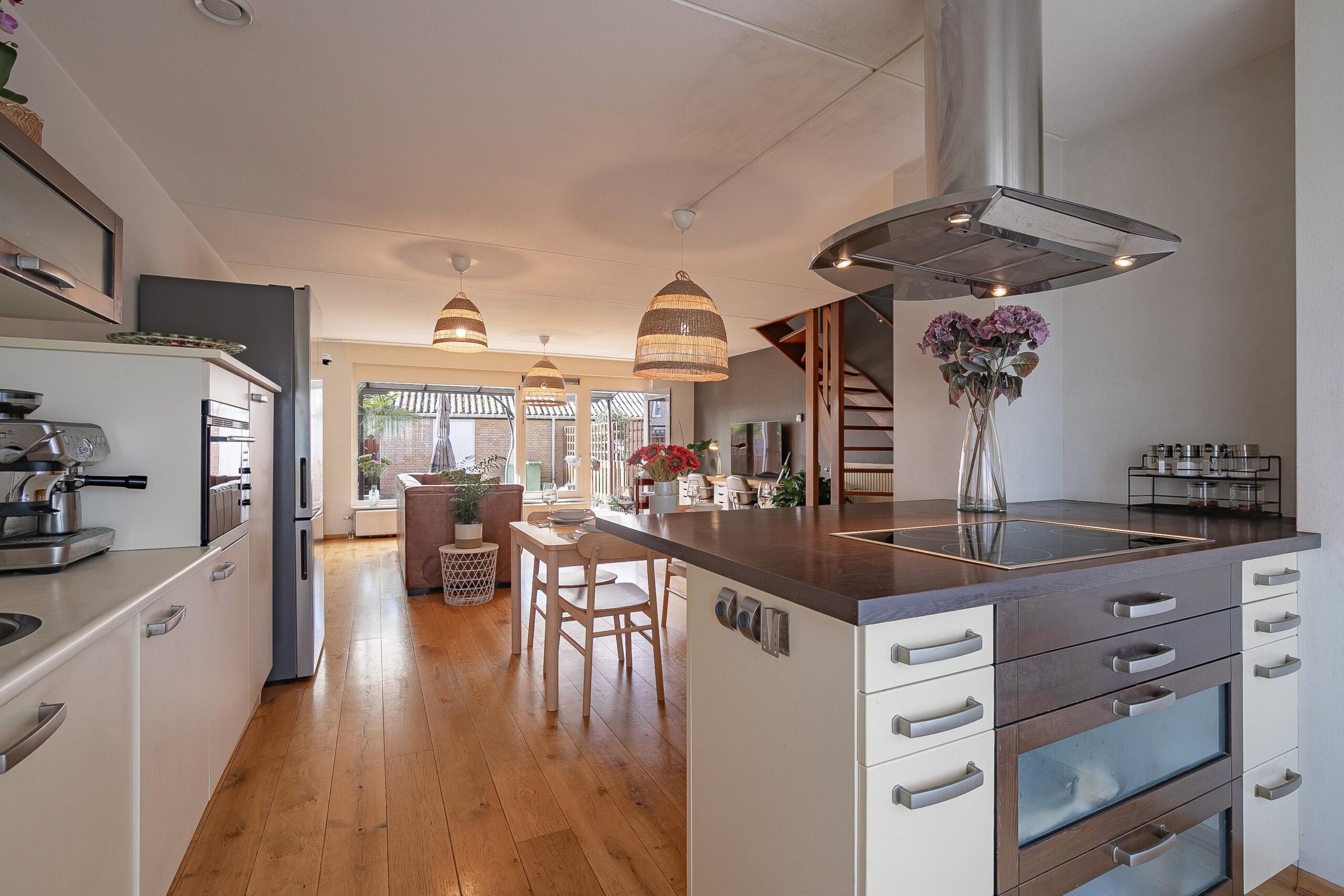 Entree/hal met meterkast, muurkast met de unit voor de stadsverwarming, toilet en toegang tot de living. Het toilet is geheel betegeld en voorzien van een wandcloset met fonteintje. Ruime, sfeervolle en lichte woonkamer met open keuken (totaal ca. 48m²). De keuken is aan de voorzijde van de woning gelegen en beschikt over een moderne keukeninstallatie met kookeiland en de volgende inbouwapparatuur: inductiekookplaat met 4 zones, RVS afzuiginstallatie met filter, koelkast, vriezer met 2 lades, combimagnetron, vaatwasser, apothekerskast en een spoelbak. De zitkamer is aan de achterzijde gelegen en geeft toegang tot de achtertuin. Via een open trap is er toegang tot de 1e verdieping.