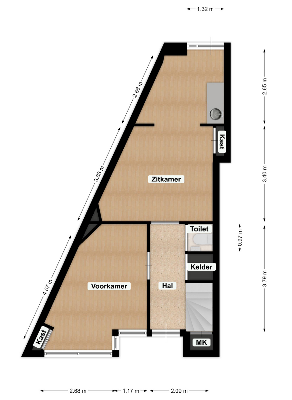 Middels overdekte entree heeft u toegang tot de woning. De hal met trapopgang biedt toegang tot de voorkamer (ca. 12m2), eetkamer en keuken met functioneel keukenblok (ca. 19m2), de toiletruimte en de kelder. Vanuit de keuken is de op het zuidwesten gelegen achtertuin te bereiken (achterzijde ca. 3.5m breedte).