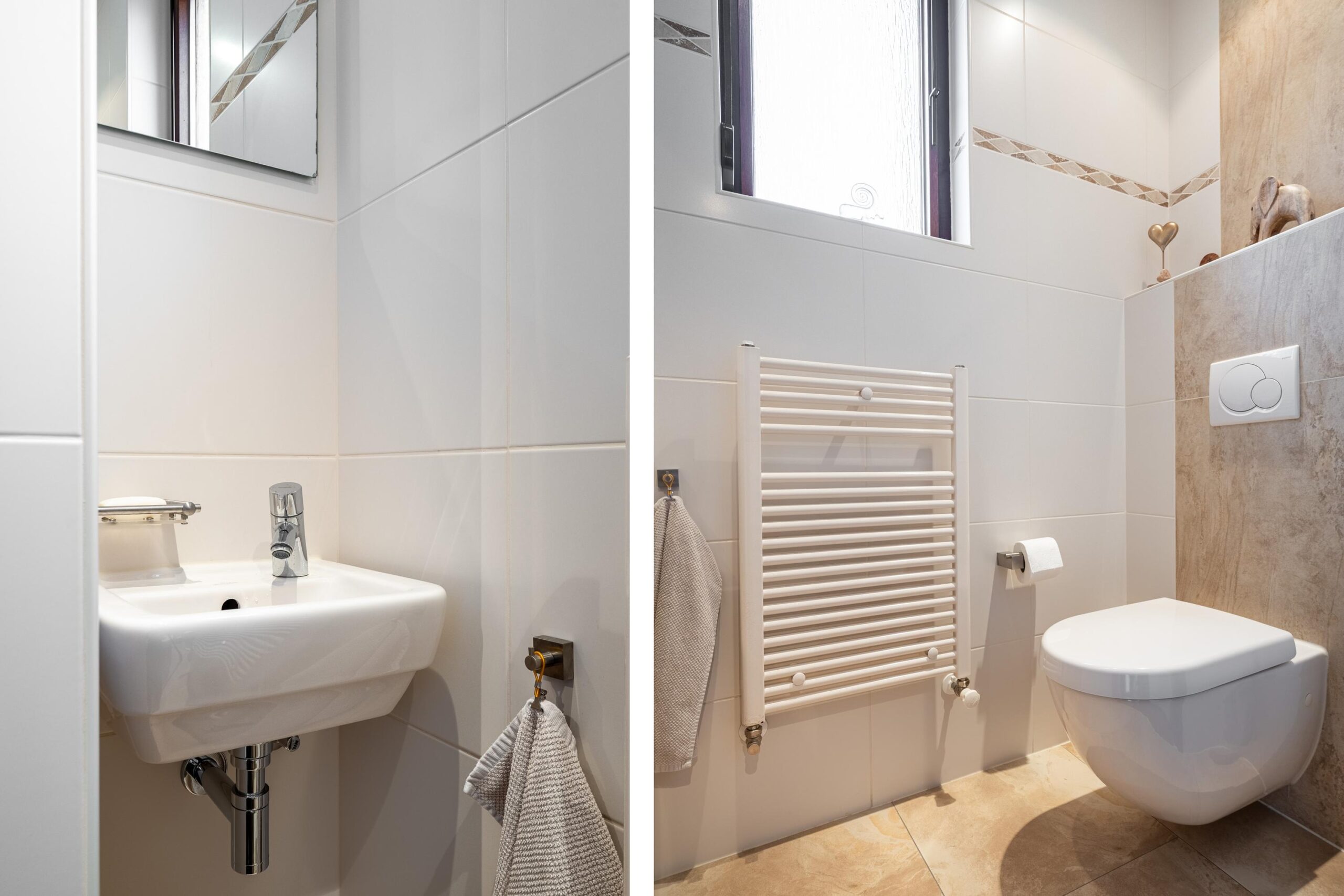 De geheel betegelde badkamer is groot ca 6 m² en is voorzien van een zwevend toilet, bidet, douche en een dubbele vaste wastafel . De badkamer is tevens voorzien van elektrische vloerverwarming.