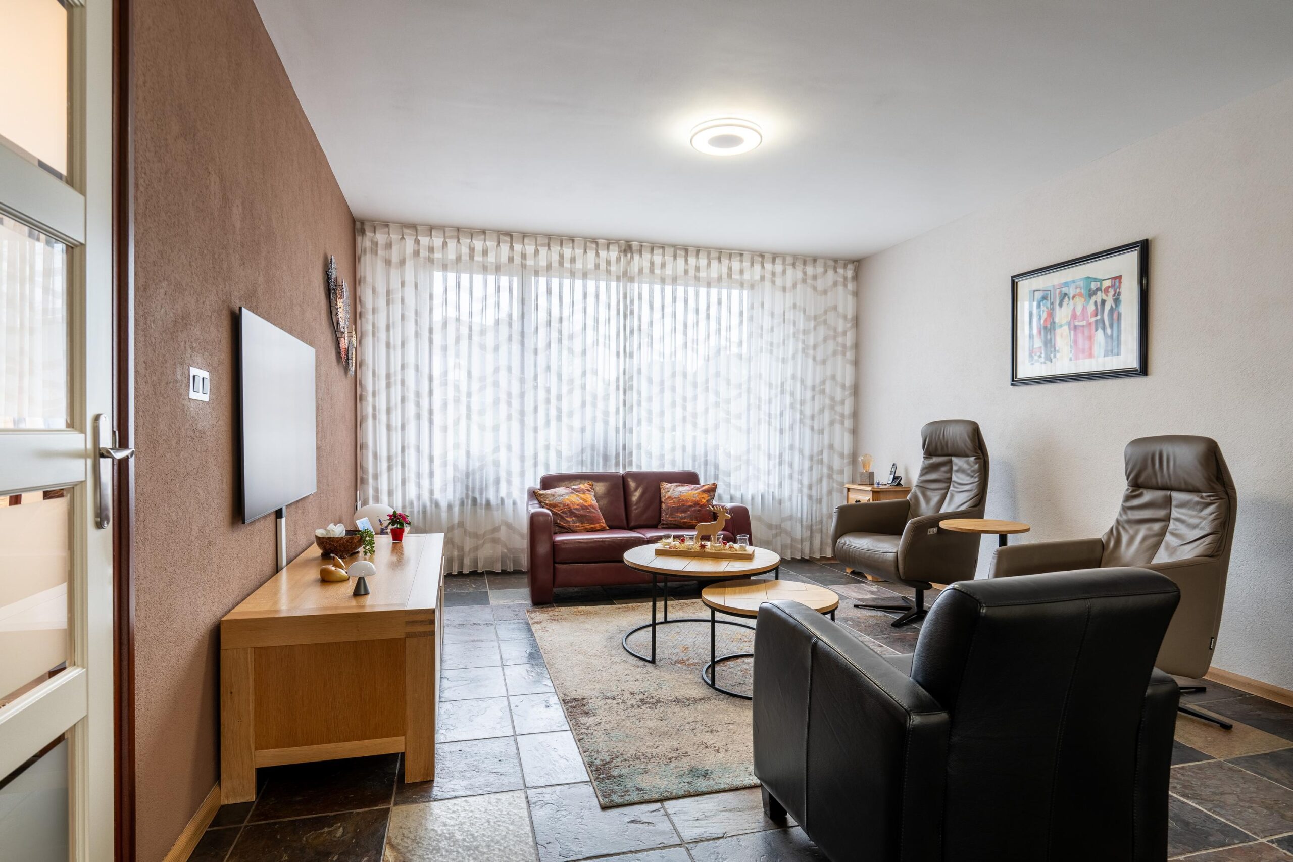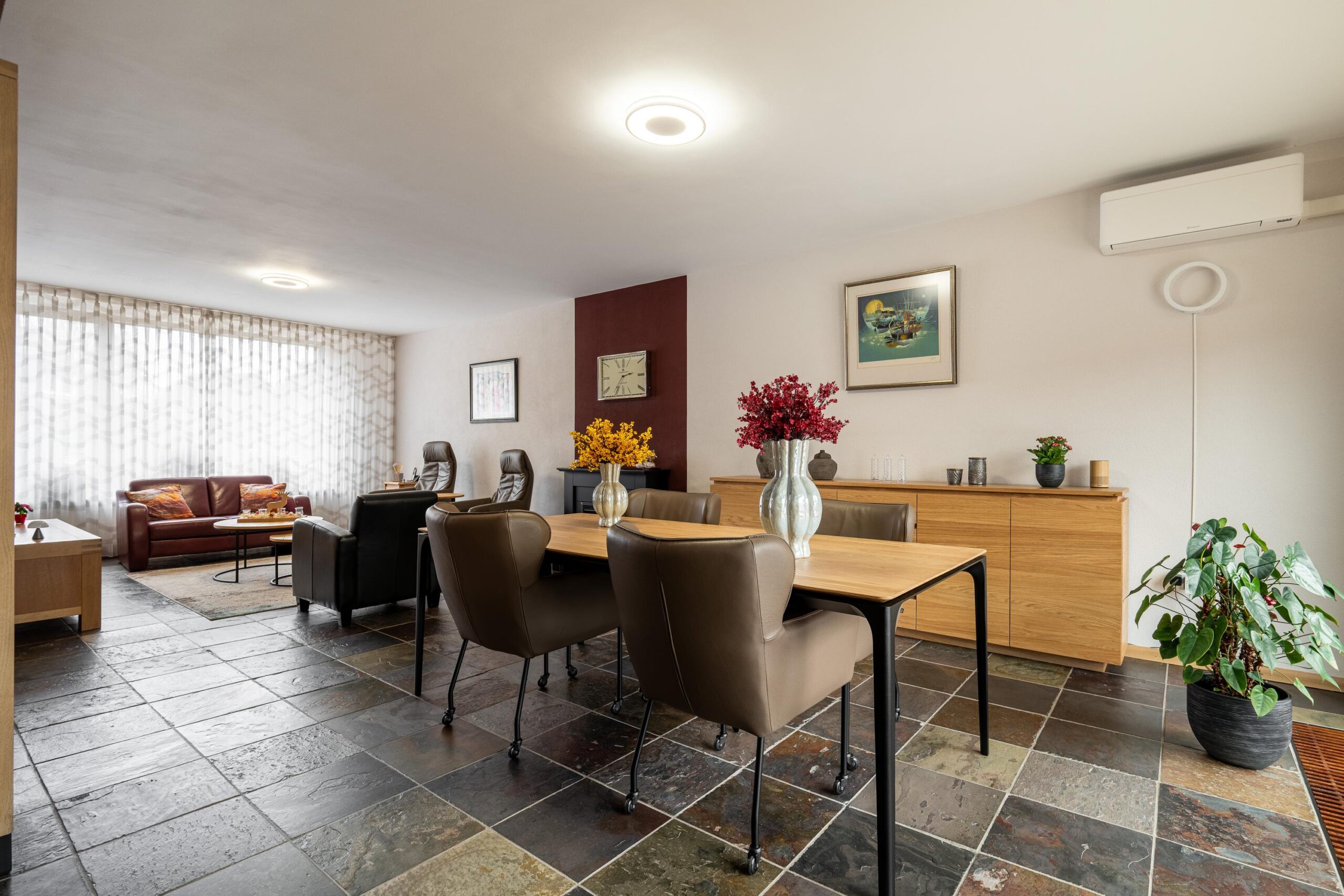 De woonkamer (ca. 38 m²) en keuken (ca. 9 m²) zijn voorzien van grote raampartijen, schuifpui en een leistenenvloer.