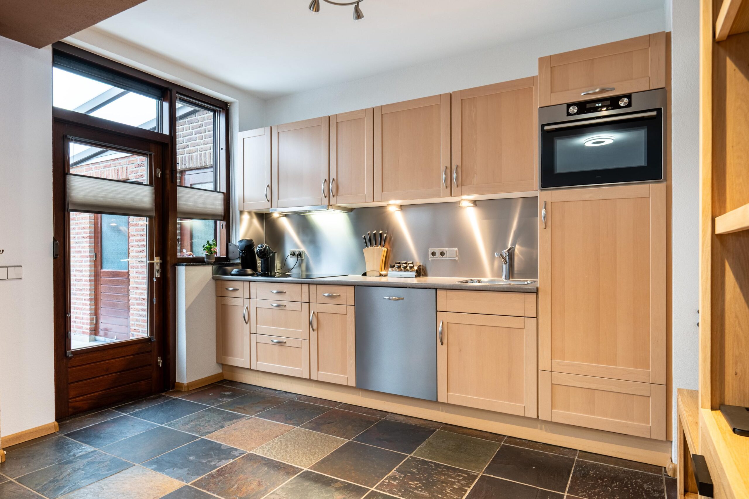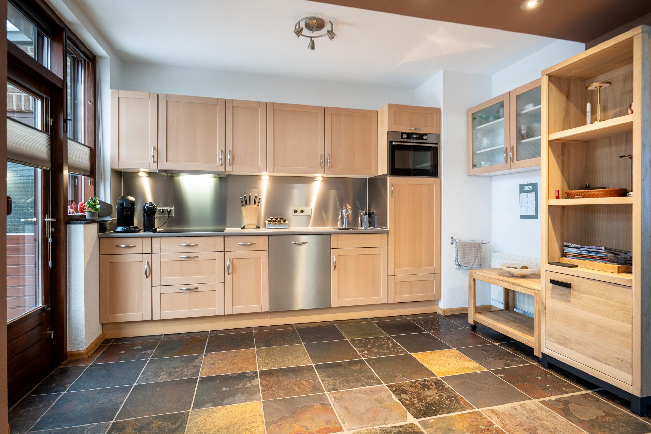De keuken is voorzien van een rechte opstelling met de navolgende apparatuur: inductiekookplaat, afzuigkap, vaatwasser, combi oven/magnetron en koelkast.