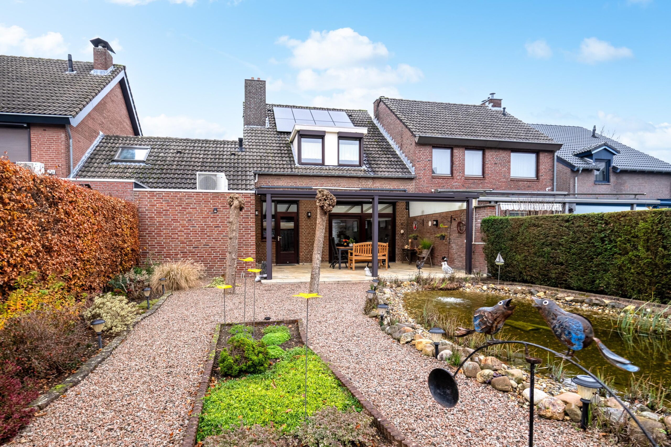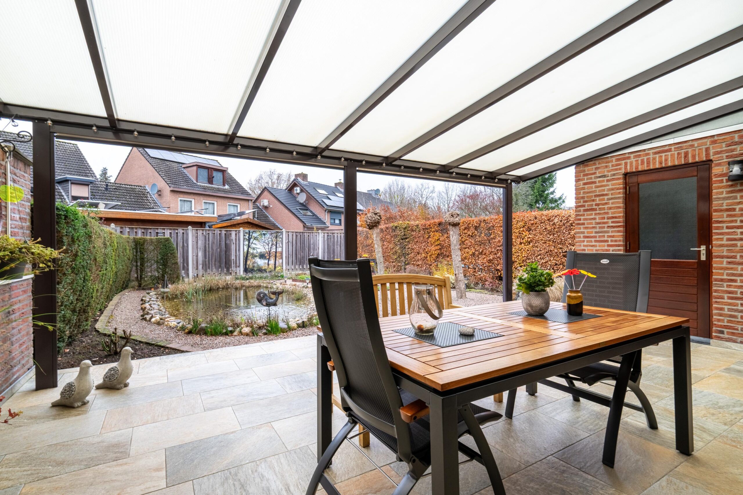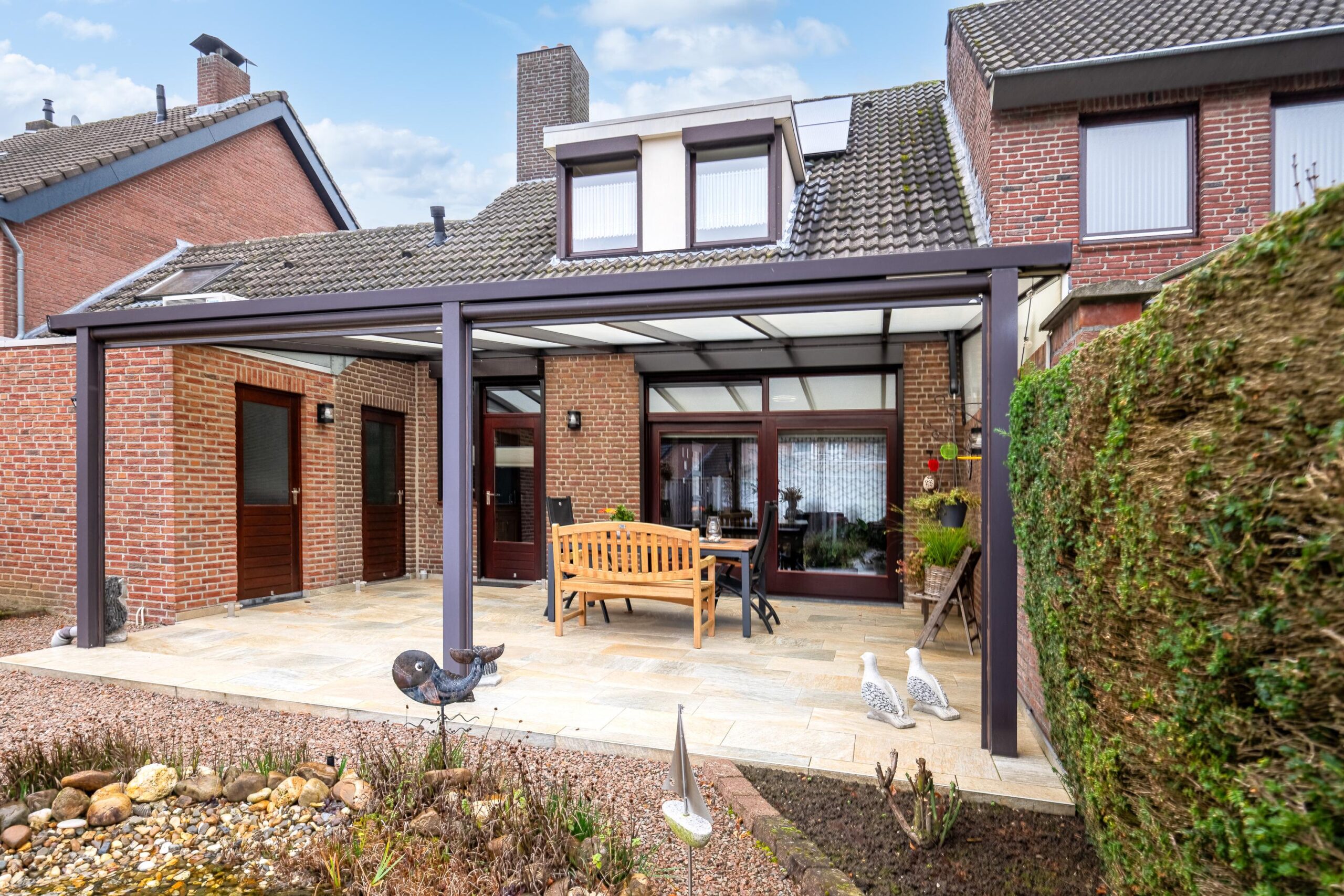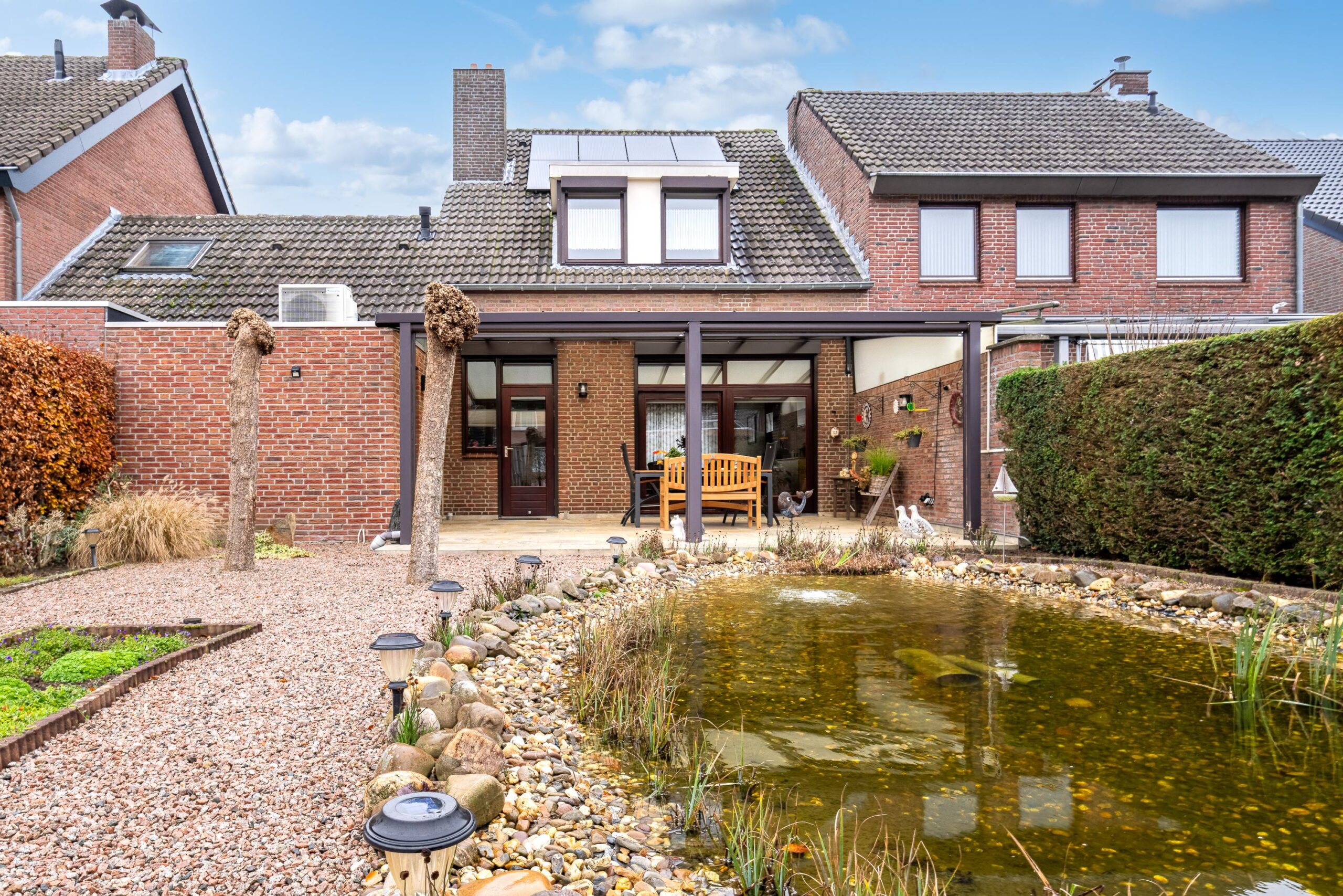 De tuin met een terras, vijver, borders en een grote overkapping (direct aan de woning) is gelegen op het westen.