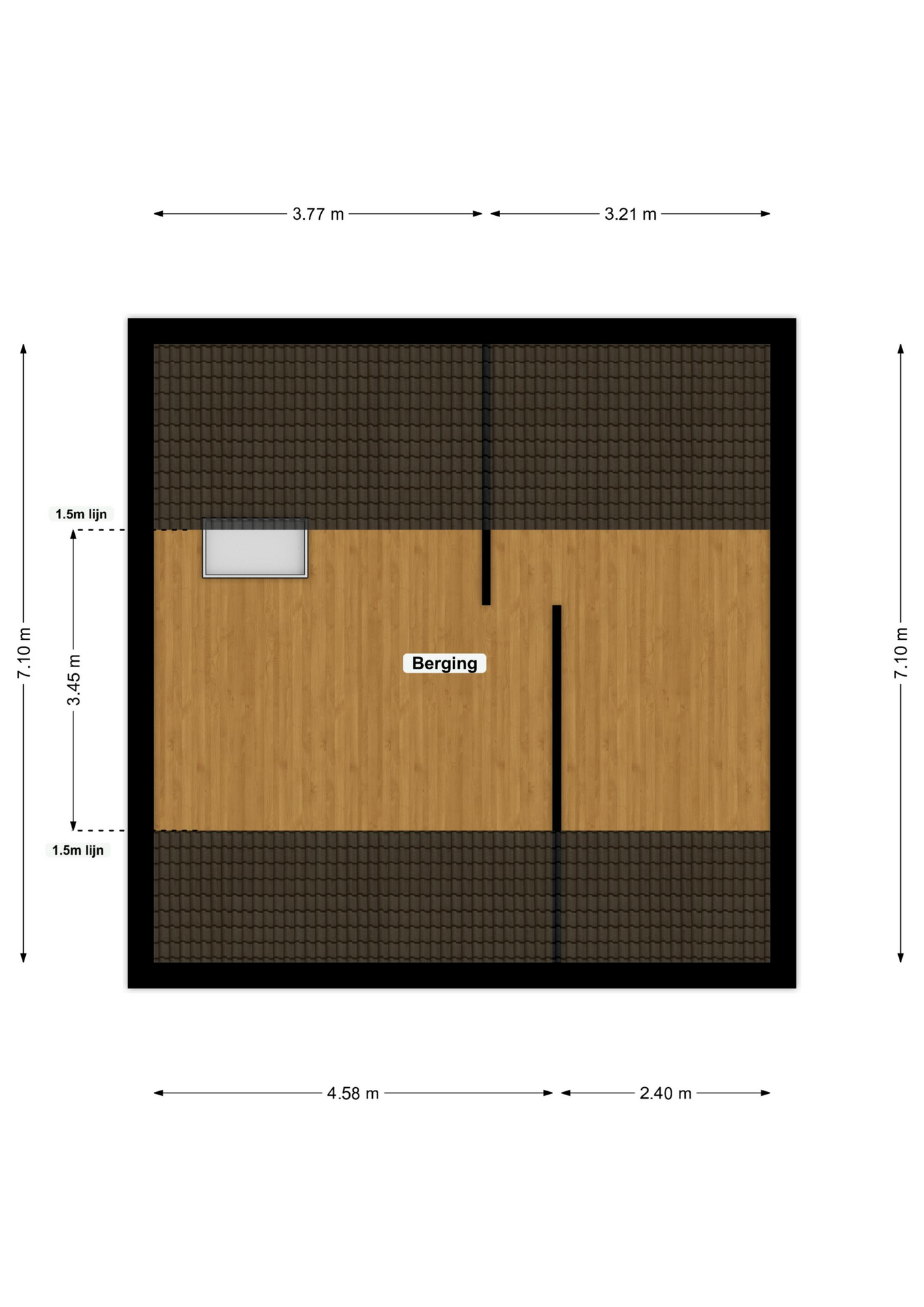 De berging/zolder heeft een vloeroppervlakte van ca. 50 m².