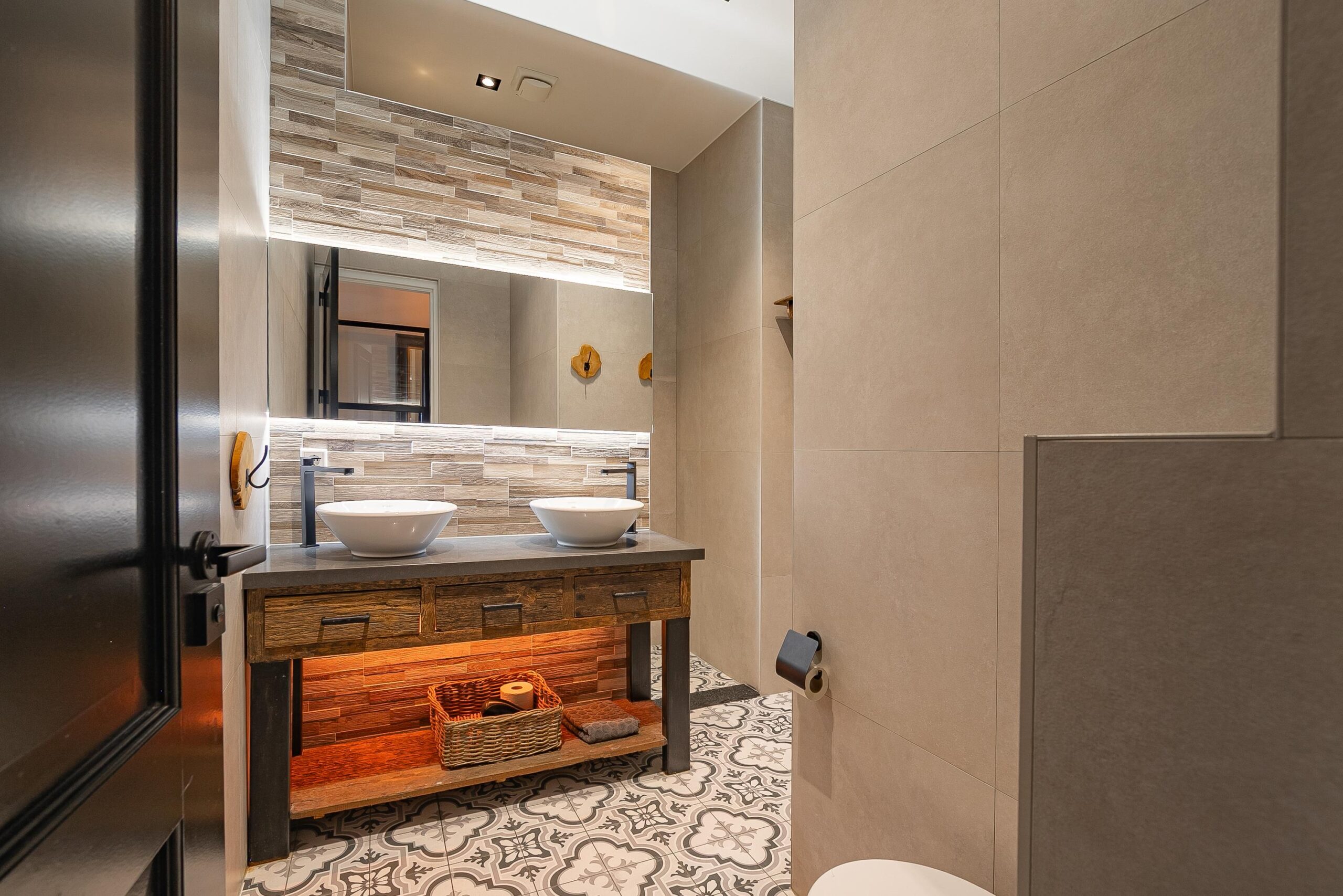 - Badkamervoorzieningen Toilet, dubbele wastafel, inloopdouche, vloerverwarming