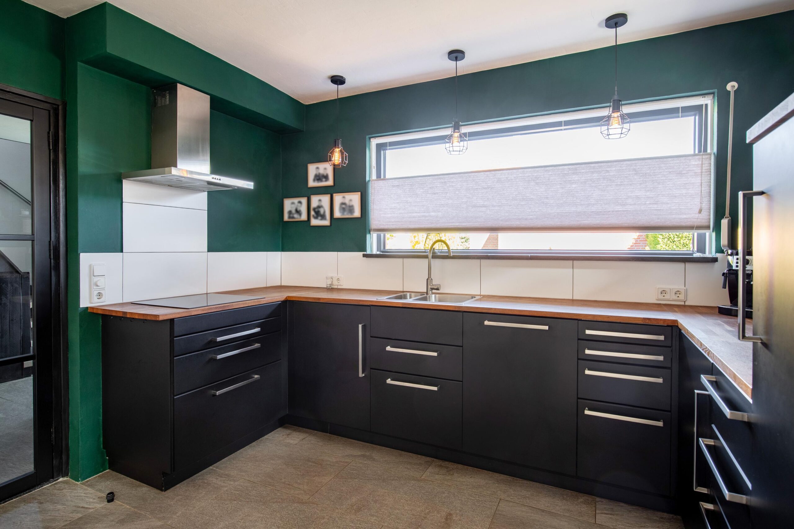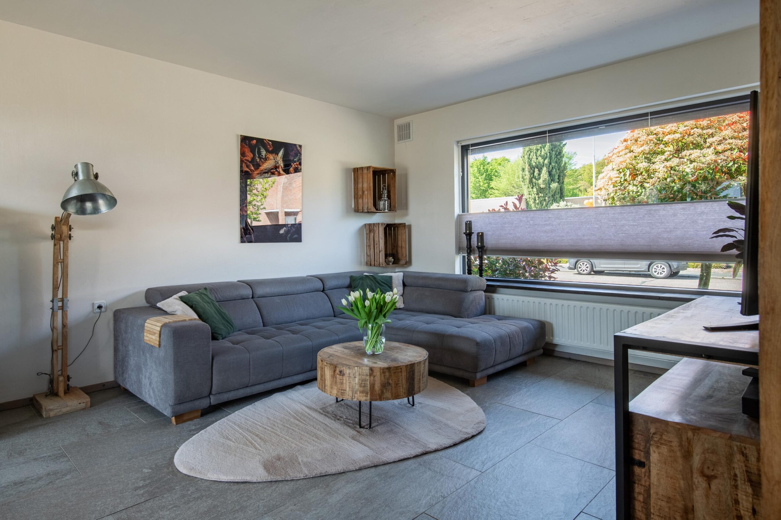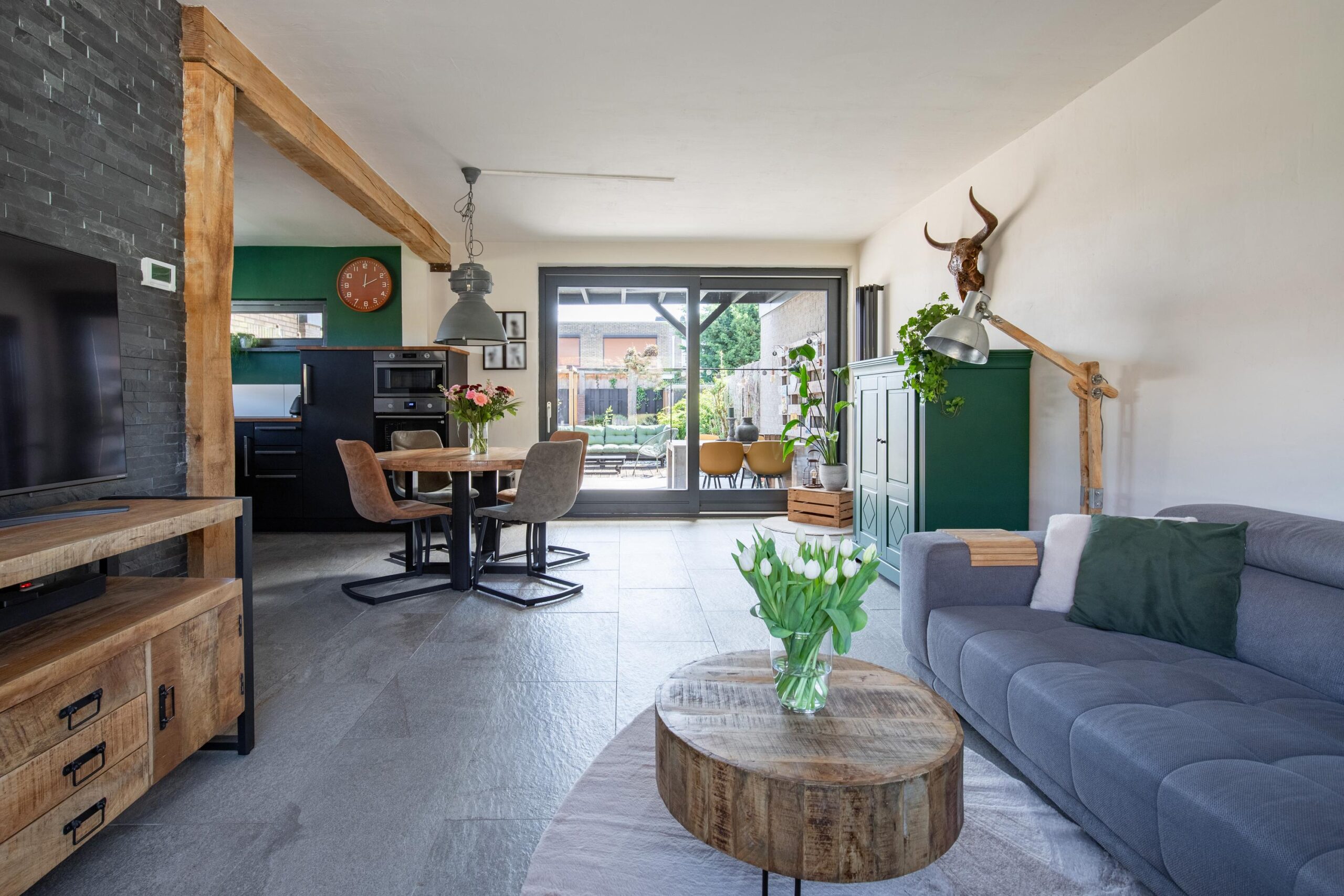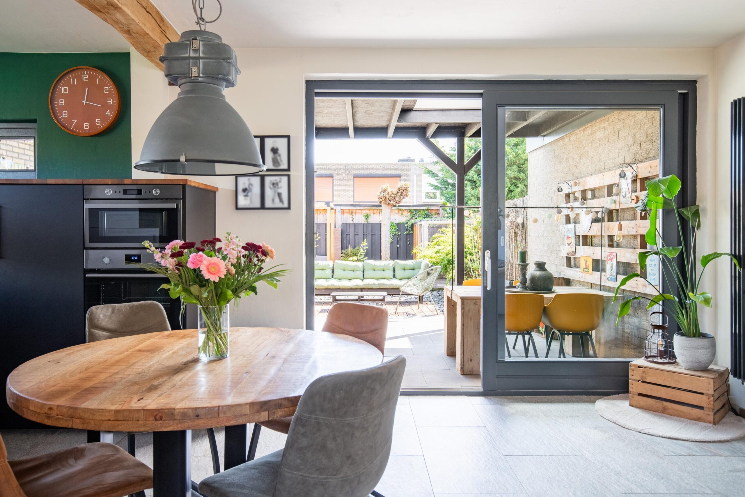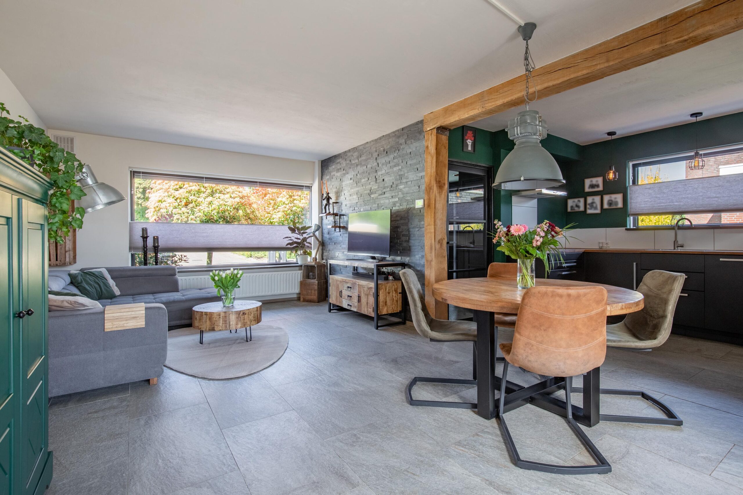 De ruime L-vormige living geniet van een uitstekende lichtinval en beschikt over een royale schuifpui naar de tuin en een designradiator. Aansluitend bevindt zich de open moderne luxe keuken in U-opstelling, welke is voorzien van een inductiekookplaat, RVS afzuigkap in schouwmodel, vaatwasser, koelkast, separate magnetron en een oven uit 2026. De gehele begane grond is afgewerkt met een fraaie onderhoudsarme plavuizenvloer in granietlook.