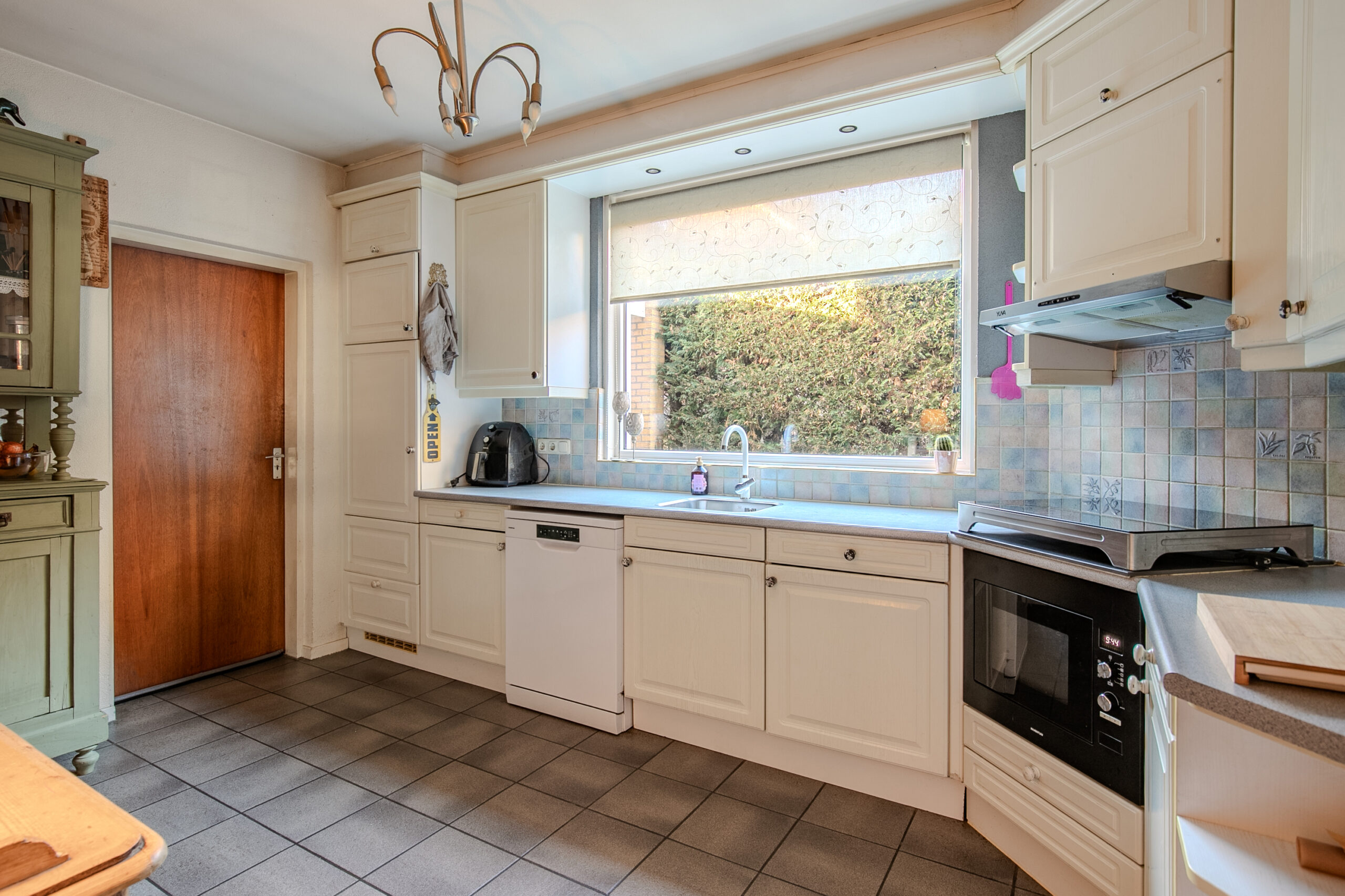 De keuken is netjes onderhouden en functioneel, maar mag naar wens gemoderniseerd worden. Achter de keuken bevindt zich een portaal met achterom, bergkast, trap naar de kelder én doorgang naar de garage.