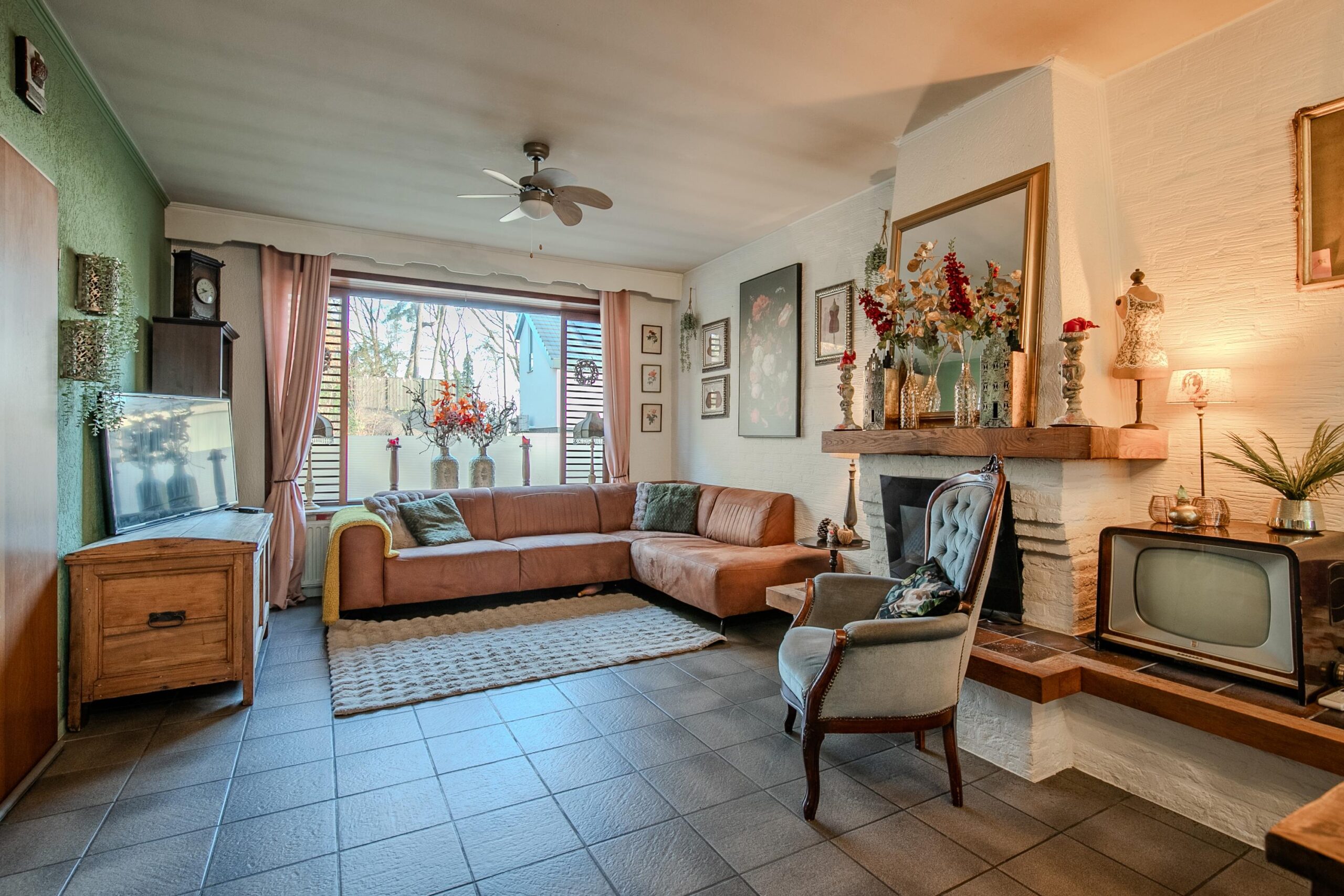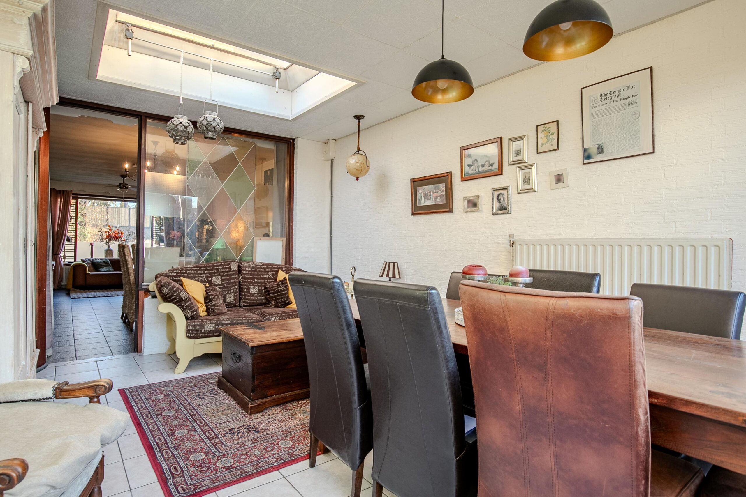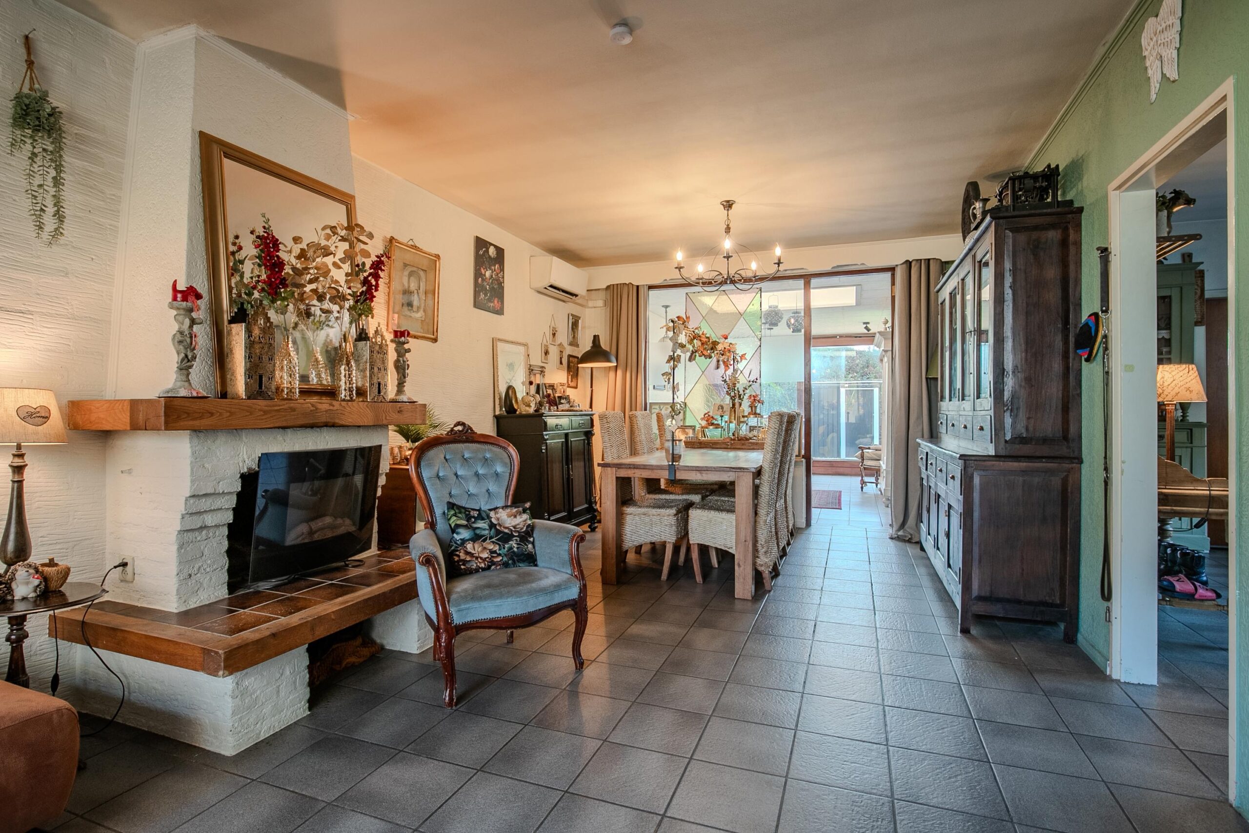 De woonkamer is ruim en gezellig dankzij de open haard. Vanuit hier heb je zicht op de grote, lichte serre. Deze aangename extra leefruimte is een echte aanwinst: een heerlijke plek om te loungen, spelen of te dineren, dankzij de grote schuifpui en de lichtkoepel die het daglicht rijkelijk binnenlaat.