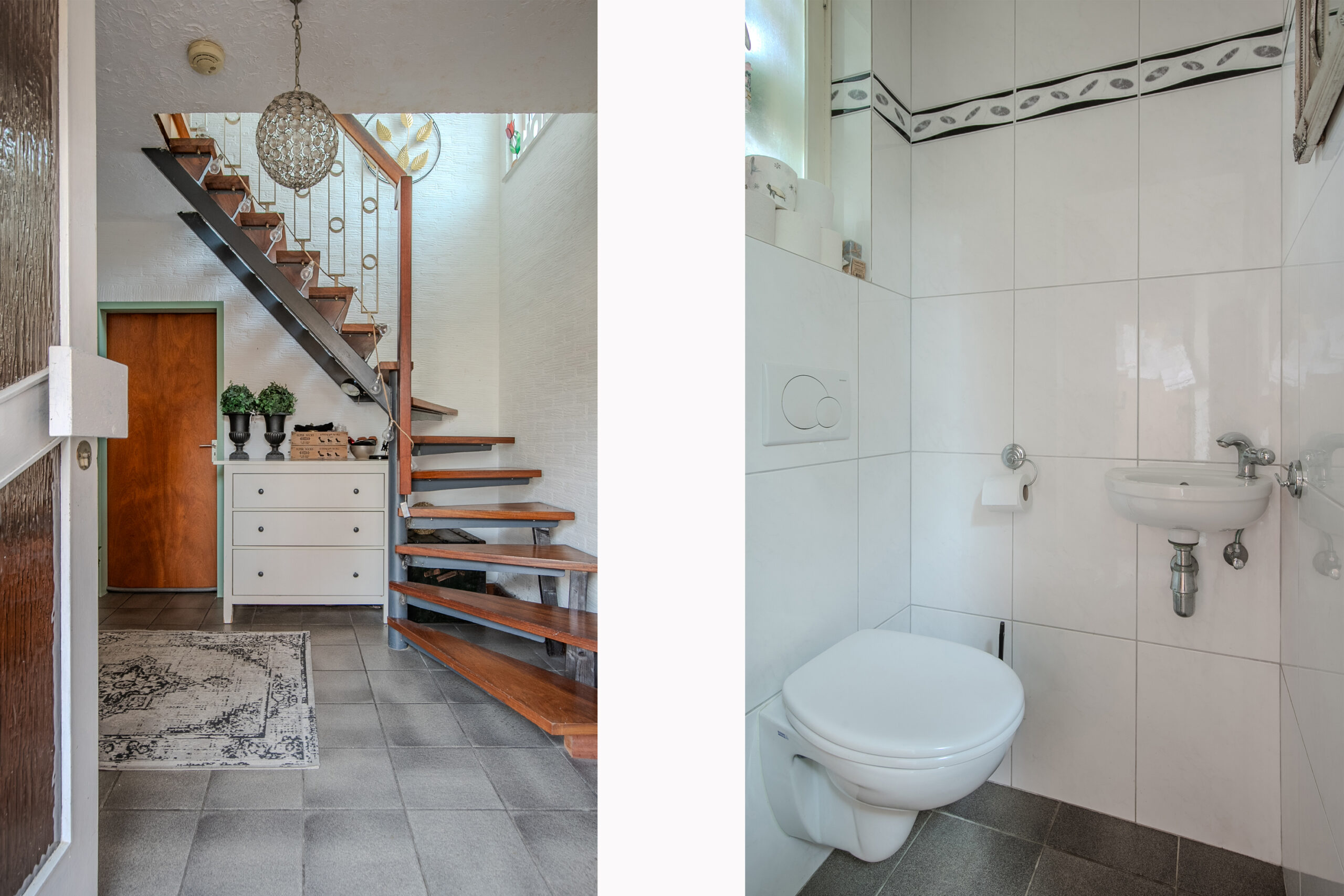 We komen binnen in de royale hal met toilet, meterkast, trapopgang en toegang naar zowel de woonkamer als de keuken. De volledig doorlopende tegelvloer op de begane grond verbindt alle ruimtes en zorgt voor een mooie eenheid.