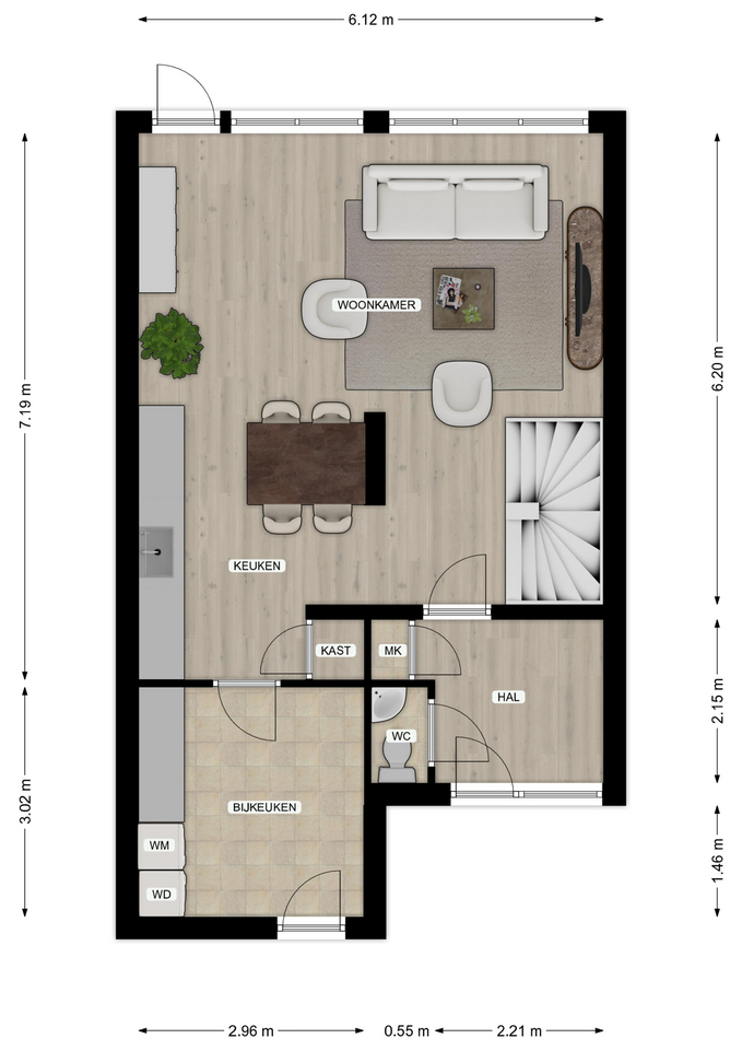 De woonkamer met open keuken heeft een afmeting van circa 7,20 x 6,10 m. De bijkeuken is circa 3,00 x 3,00 m groot.