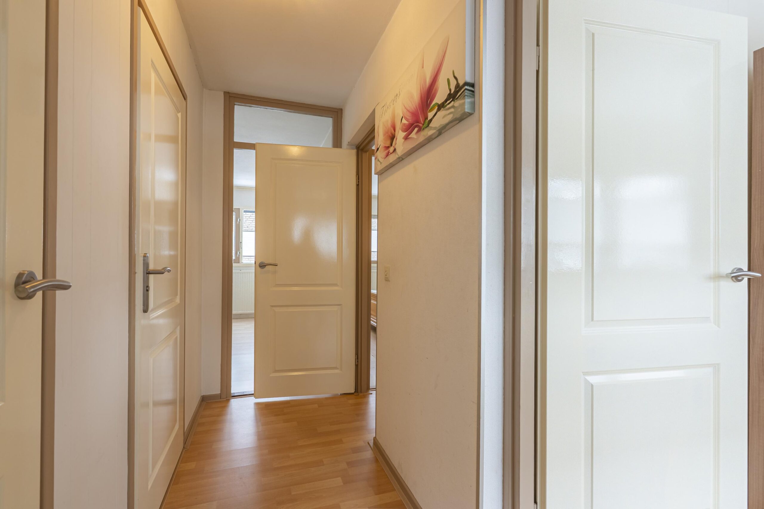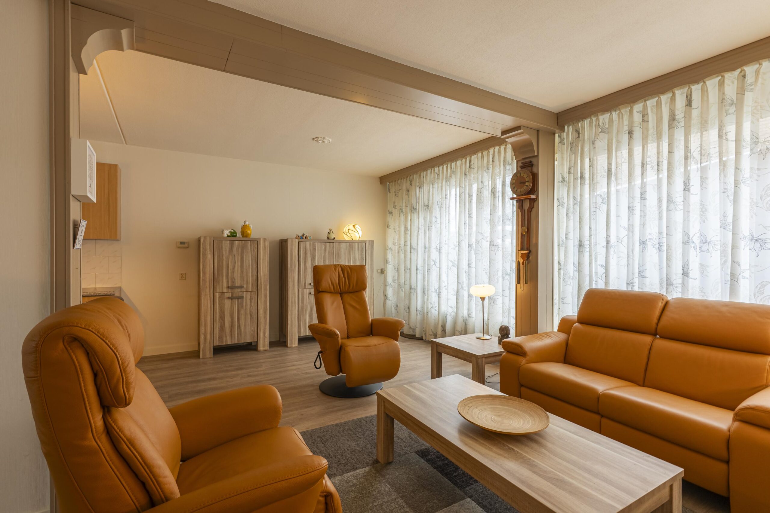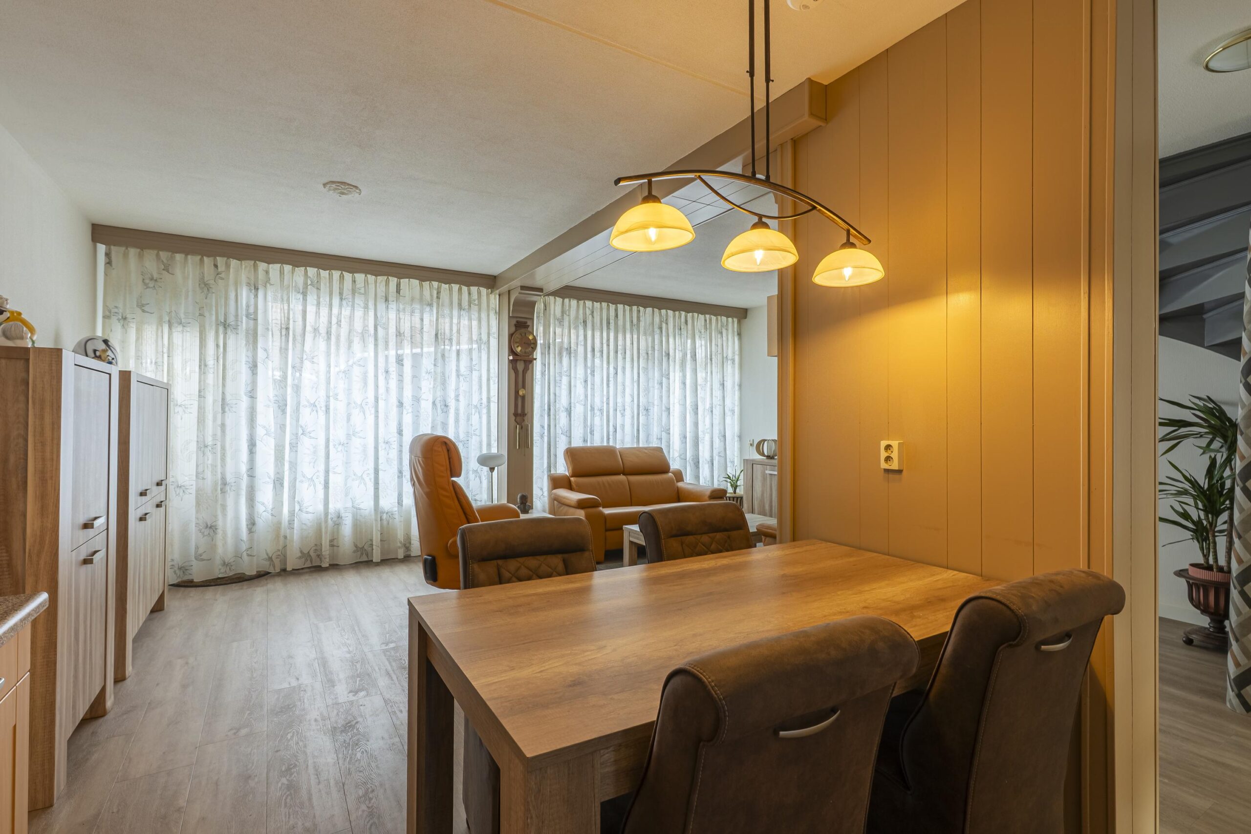 De entree biedt toegang tot de hal met toilet voorzien van fontein, meterkast en doorgang naar de woonkamer. De woonkamer is afgewerkt met een pvc-vloer en staat in open verbinding met de keuken, met uitzicht op de tuin.
