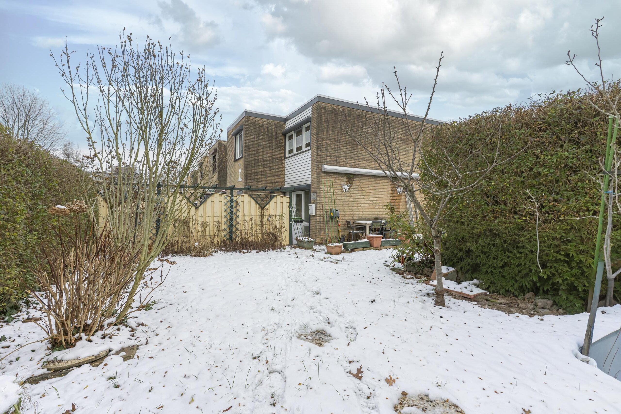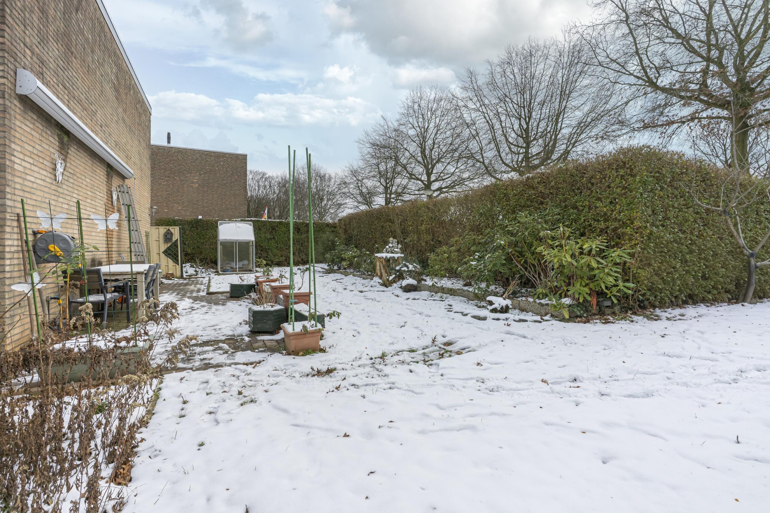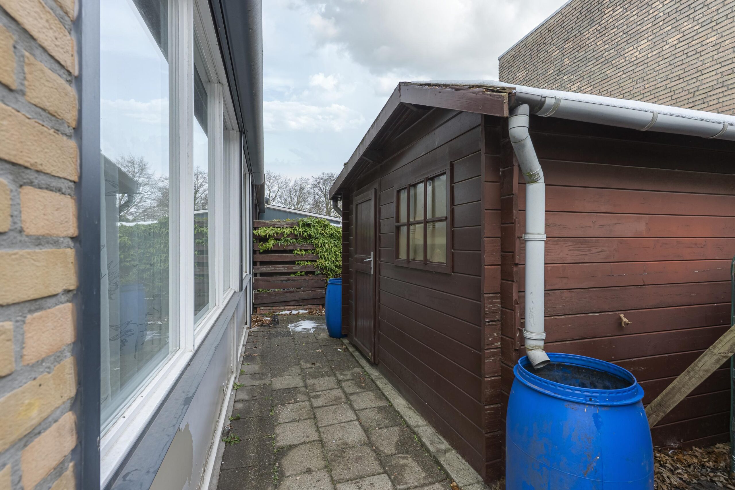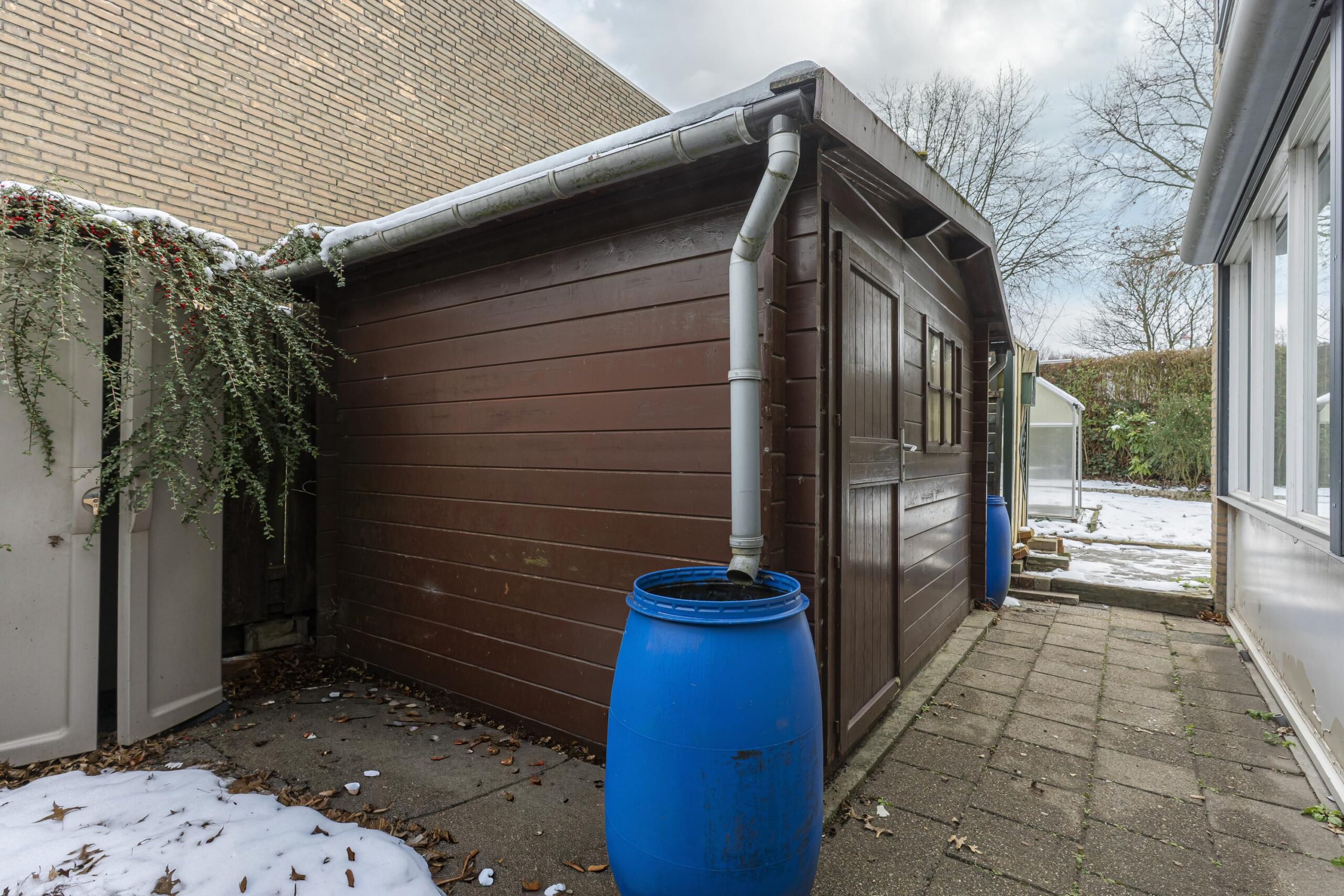 Aan de achterzijde is er toegang tot de L-vormige tuin met houten berging. De tuin biedt veel privacy dankzij de groene haag. Aan de zijkant van de woning is een zonnescherm geplaatst. De zijtuin bevindt zich op een tweede perceel (2182).