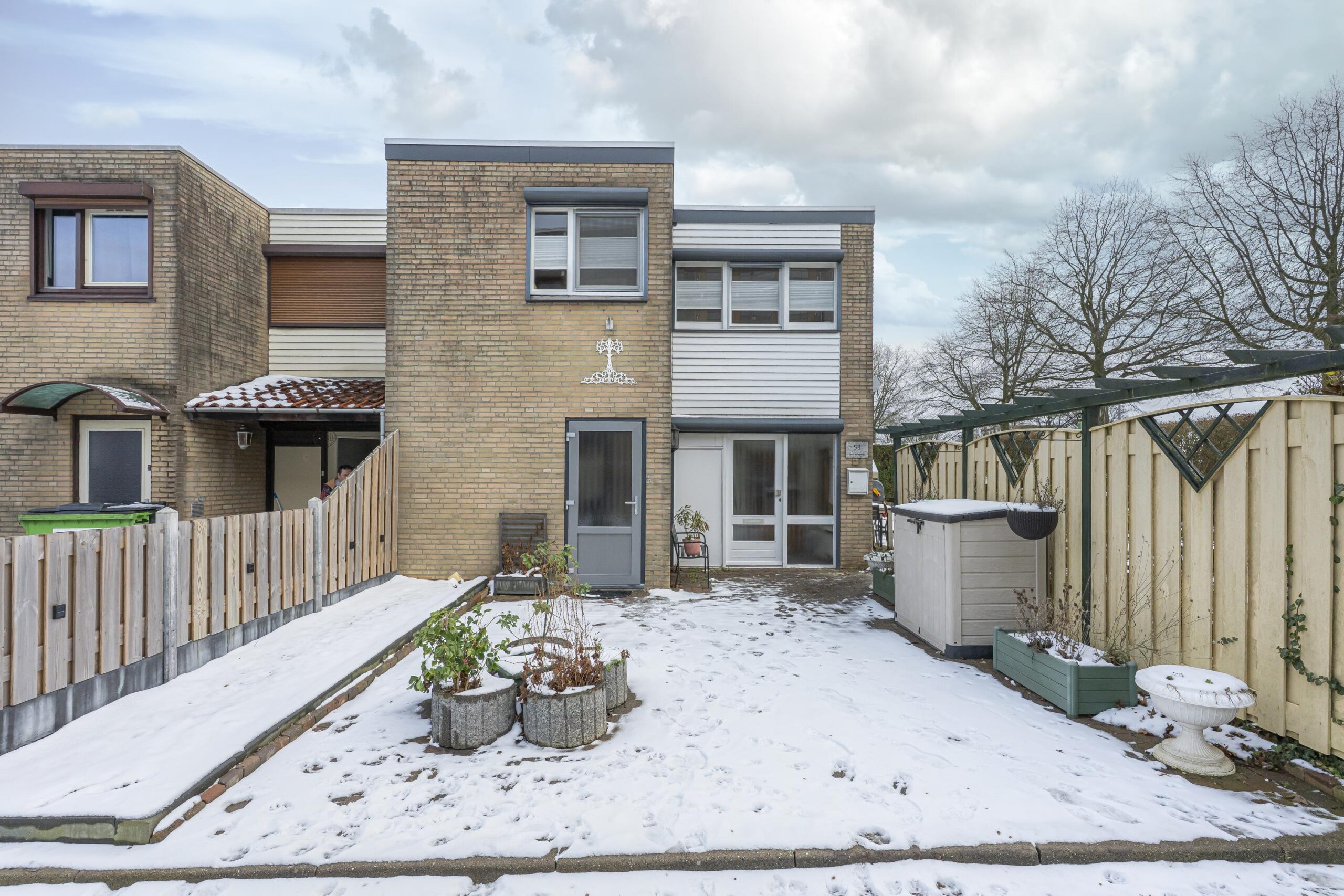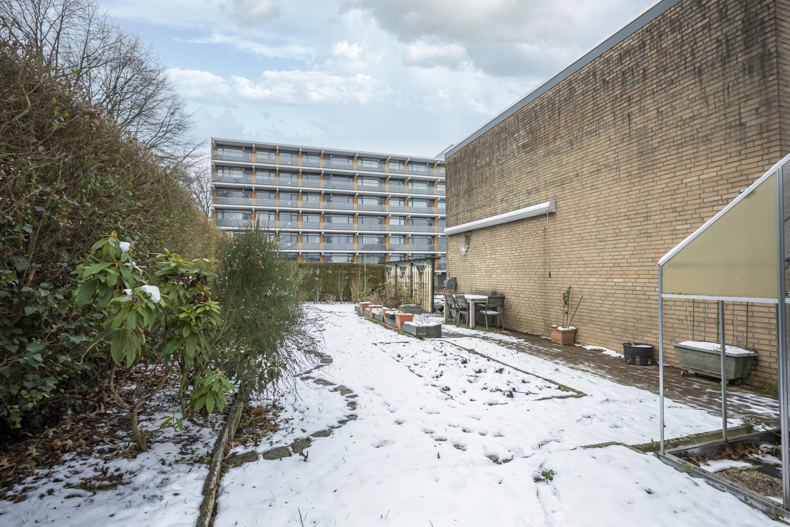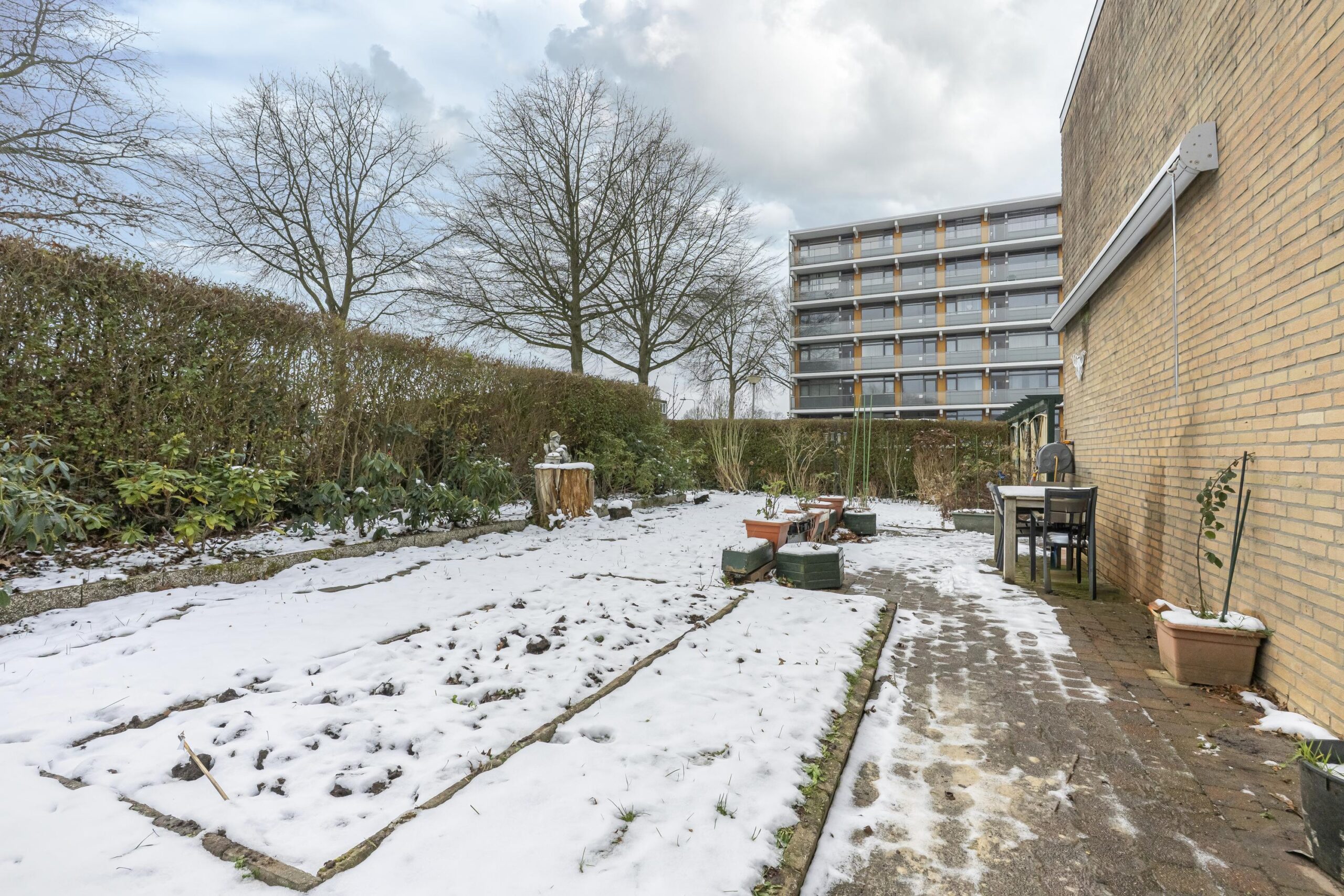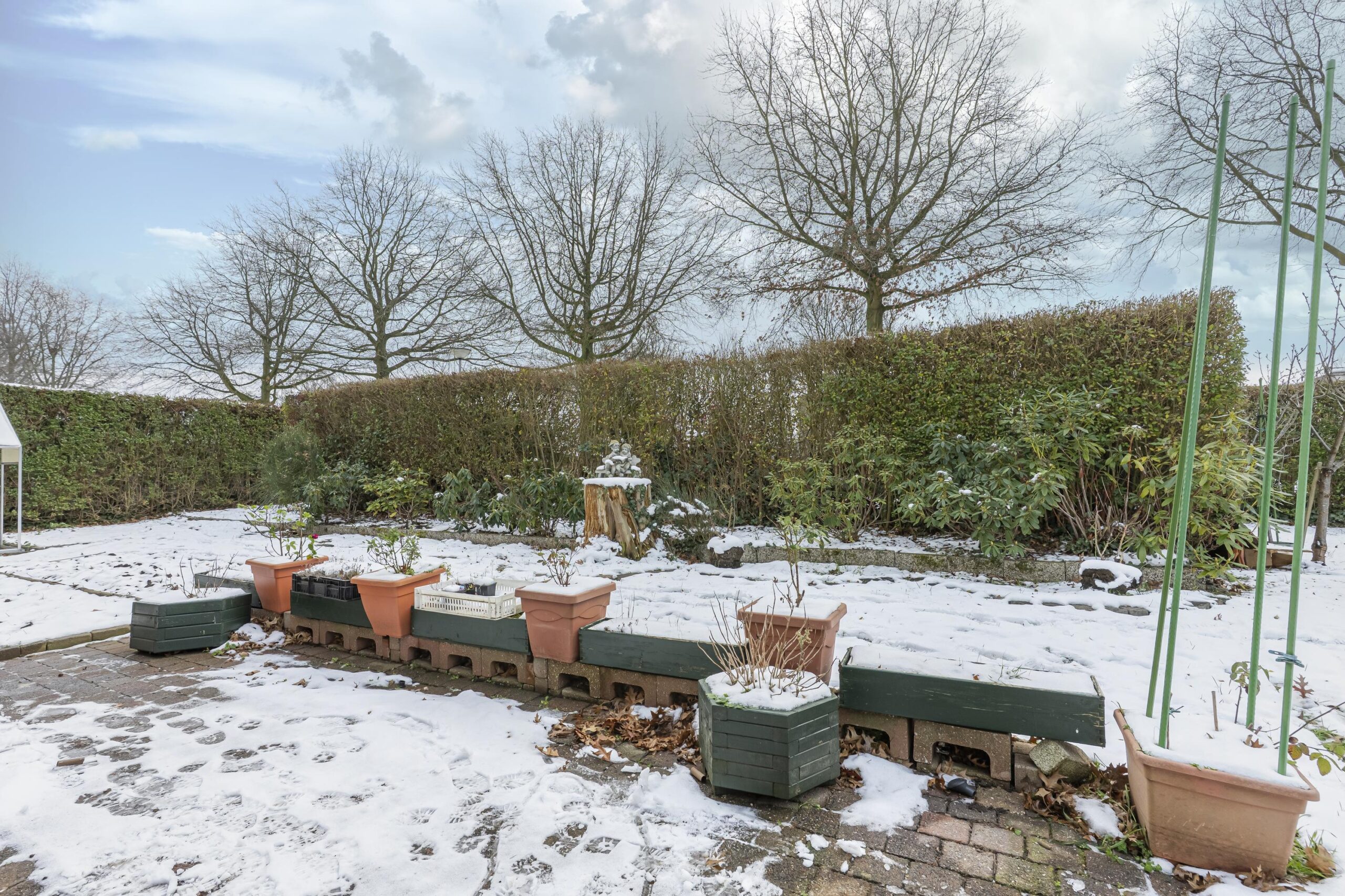 Aan de achterzijde is er toegang tot de L-vormige tuin met houten berging. De tuin biedt veel privacy dankzij de groene haag. Aan de zijkant van de woning is een zonnescherm geplaatst. De zijtuin bevindt zich op een tweede perceel (2182).