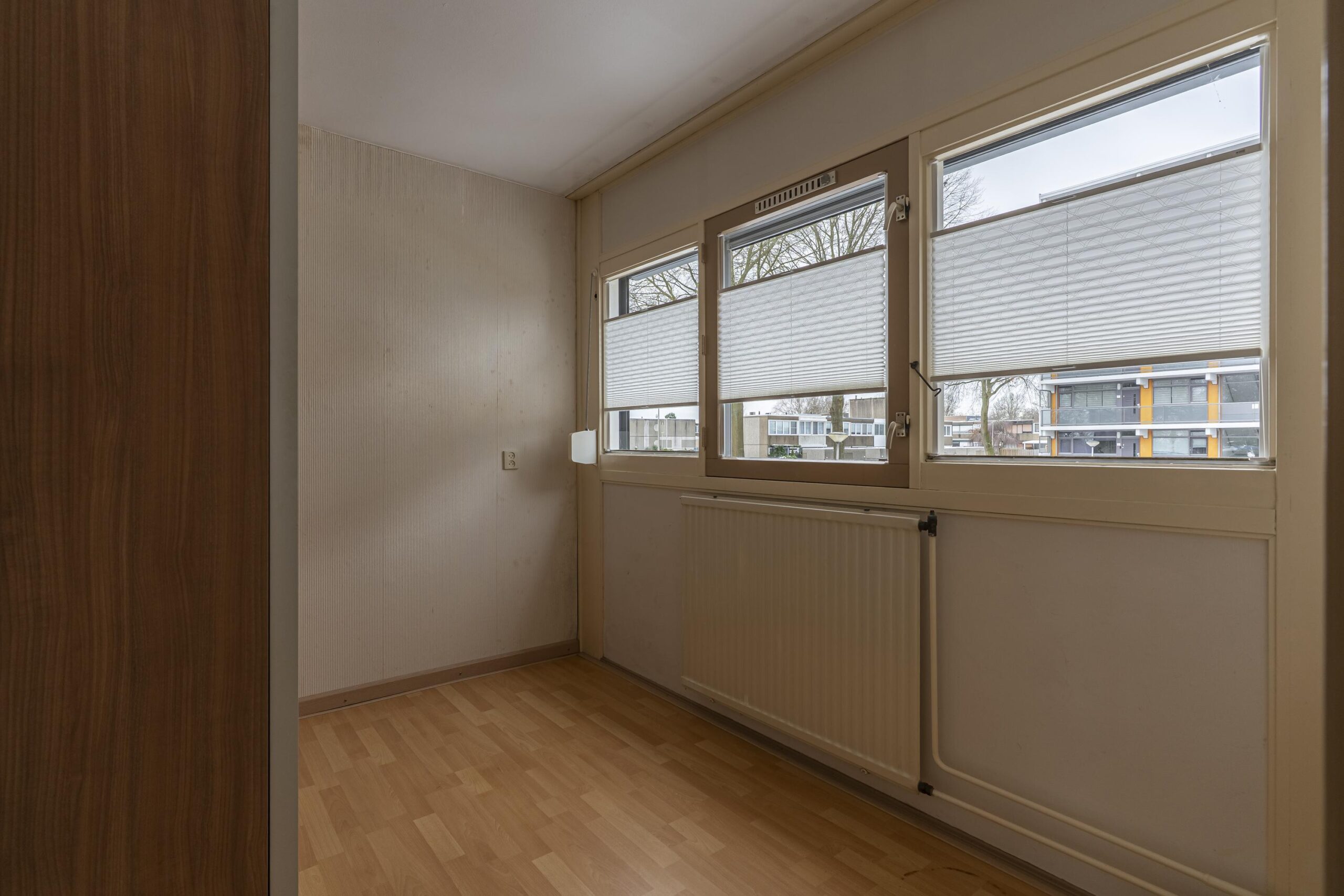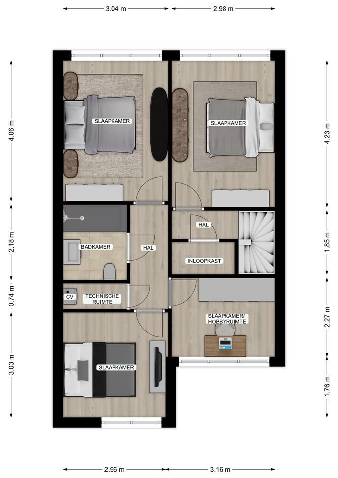 In de woonkamer bevindt zich de trap naar de verdieping. Hier zijn vier slaapkamers, een inloopkast, een technische ruimte en de badkamer gesitueerd. De badkamer is voorzien van een wastafel, toilet en inloopdouche. De gehele bovenverdieping is afgewerkt met laminaat.