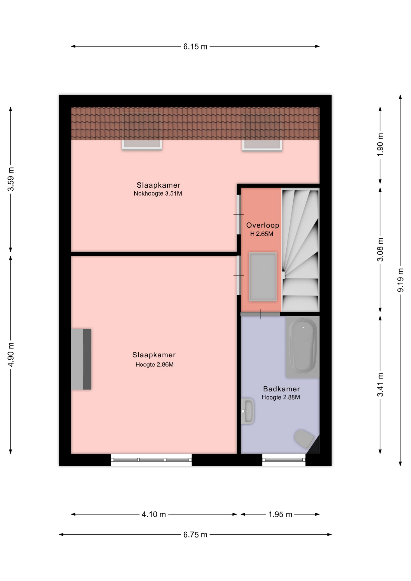 Vanaf de overloop is er toegang tot twee ruime slaapkamers van ca. 19 m² en 20 m². De badkamer (ca. 7 m²) is voorzien van een ligbad, wastafel en toilet. Daarnaast is er vanaf de overloop toegang tot de zolder middels een vlizotrap.