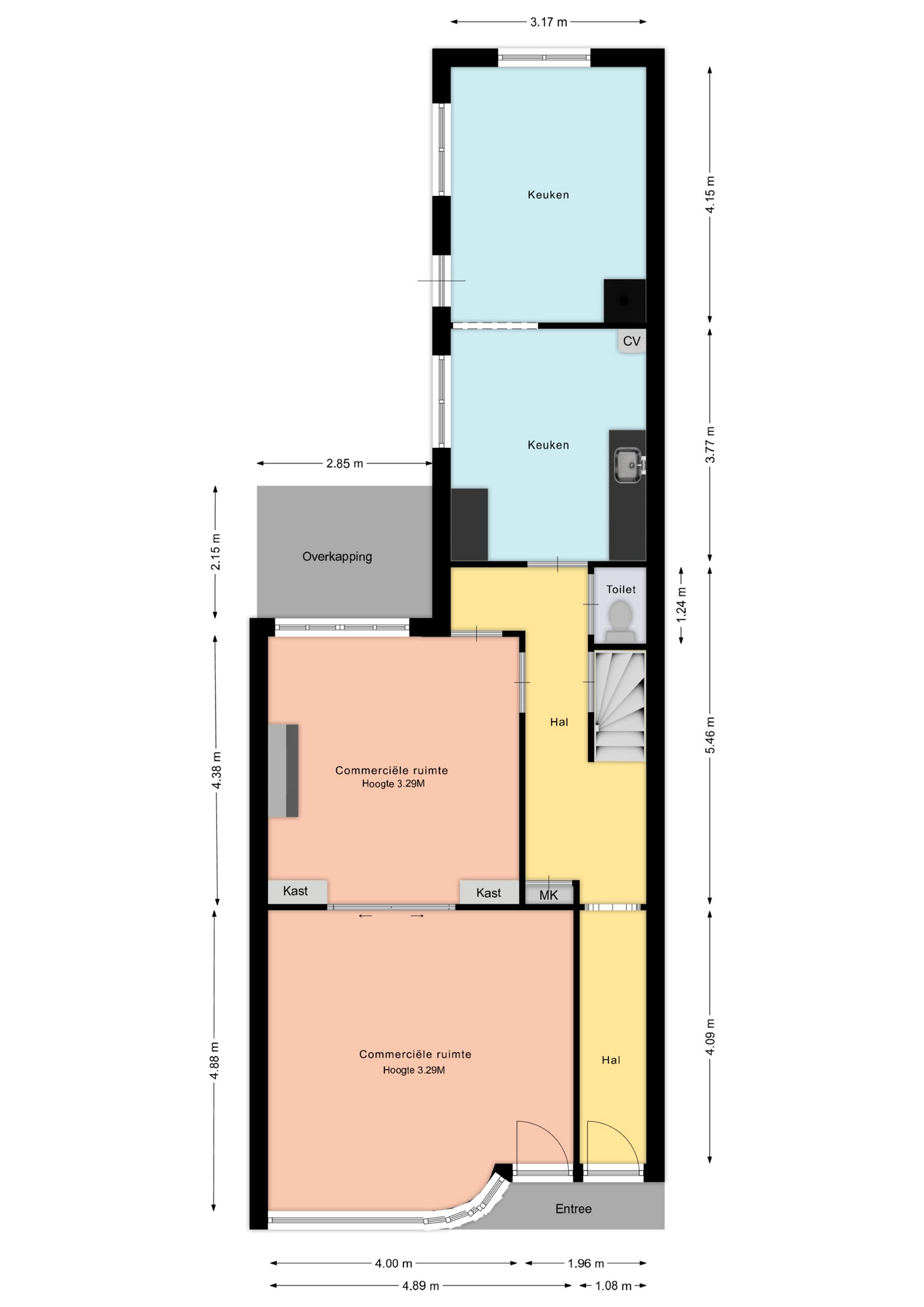 De woning beschikt over twee entrees. De linker entree biedt direct toegang tot de ruimte die momenteel als traiteur wordt gebruikt. Via de rechter entree komt u in de hal met de meterkast, het toilet en de trap naar de eerste verdieping. Vanuit de hal is tevens de kelder bereikbaar. Verder geeft de hal toegang tot twee ruime keukens (ca. 12 m² en 13 m²), waar ook de cv-ketel is geplaatst (Intergas Kombi Kompakt HRE, 2023; eigendom) evenals tot de kantoorruimte (ca. 18 m²) en de traiteur (ca. 23 m²) aan de voorzijde. Vanuit de hal is bovendien de tuin bereikbaar.