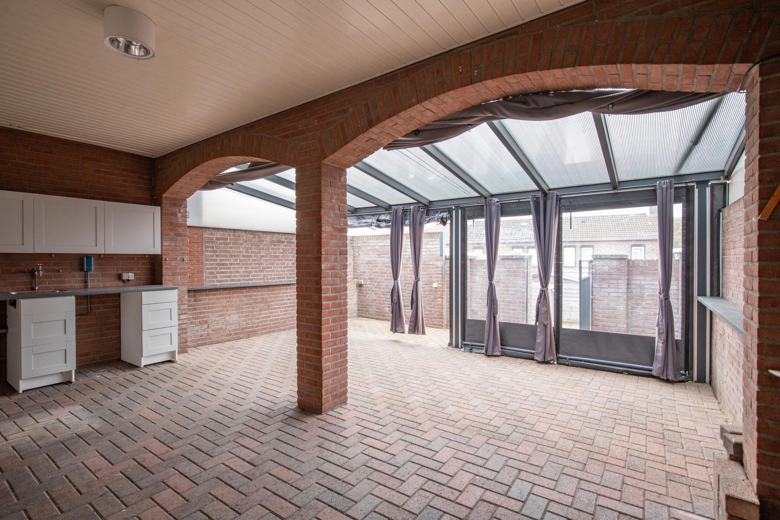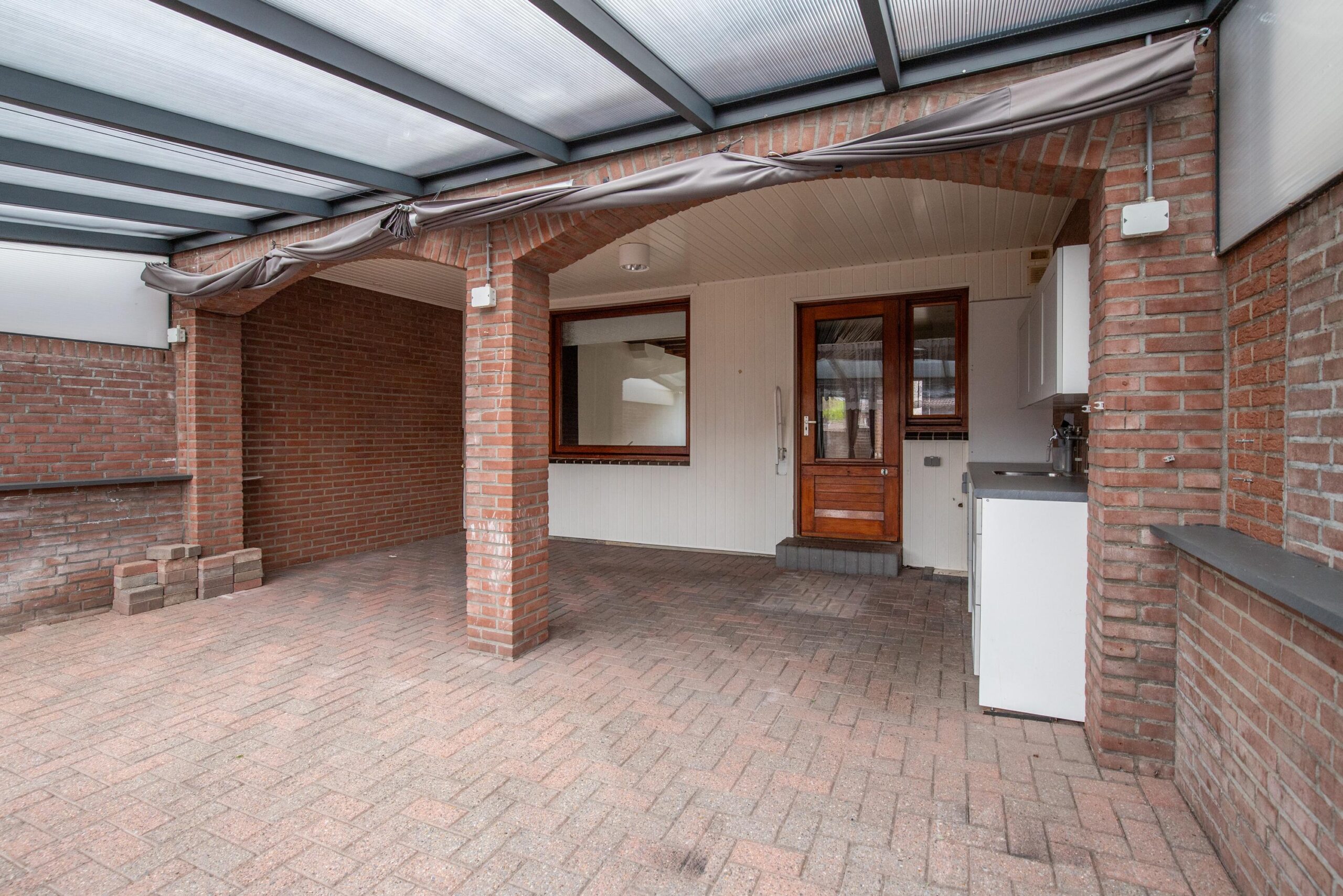 Via de keuken en achteringang bereikt u het royale, overdekte terras met extra aanrechtunit. De overkapping bestaat deels uit een vast dak en deels uit een aluminium constructie met lichtdoorlatende platen en afsluitbaar tentdoek.