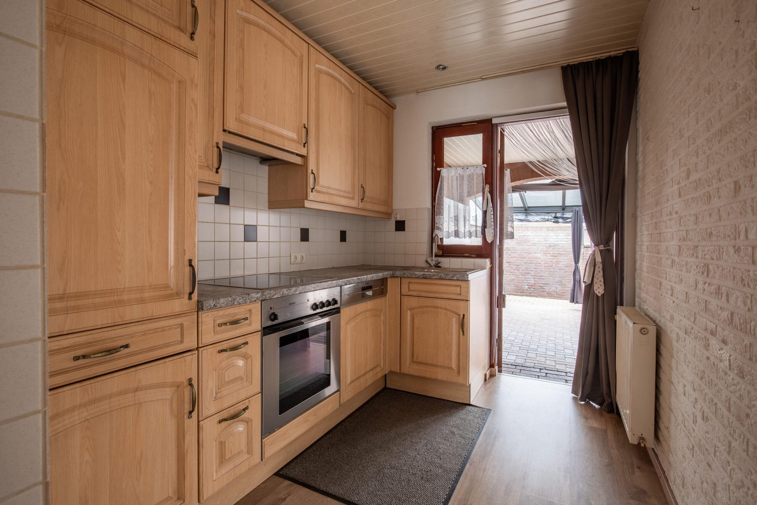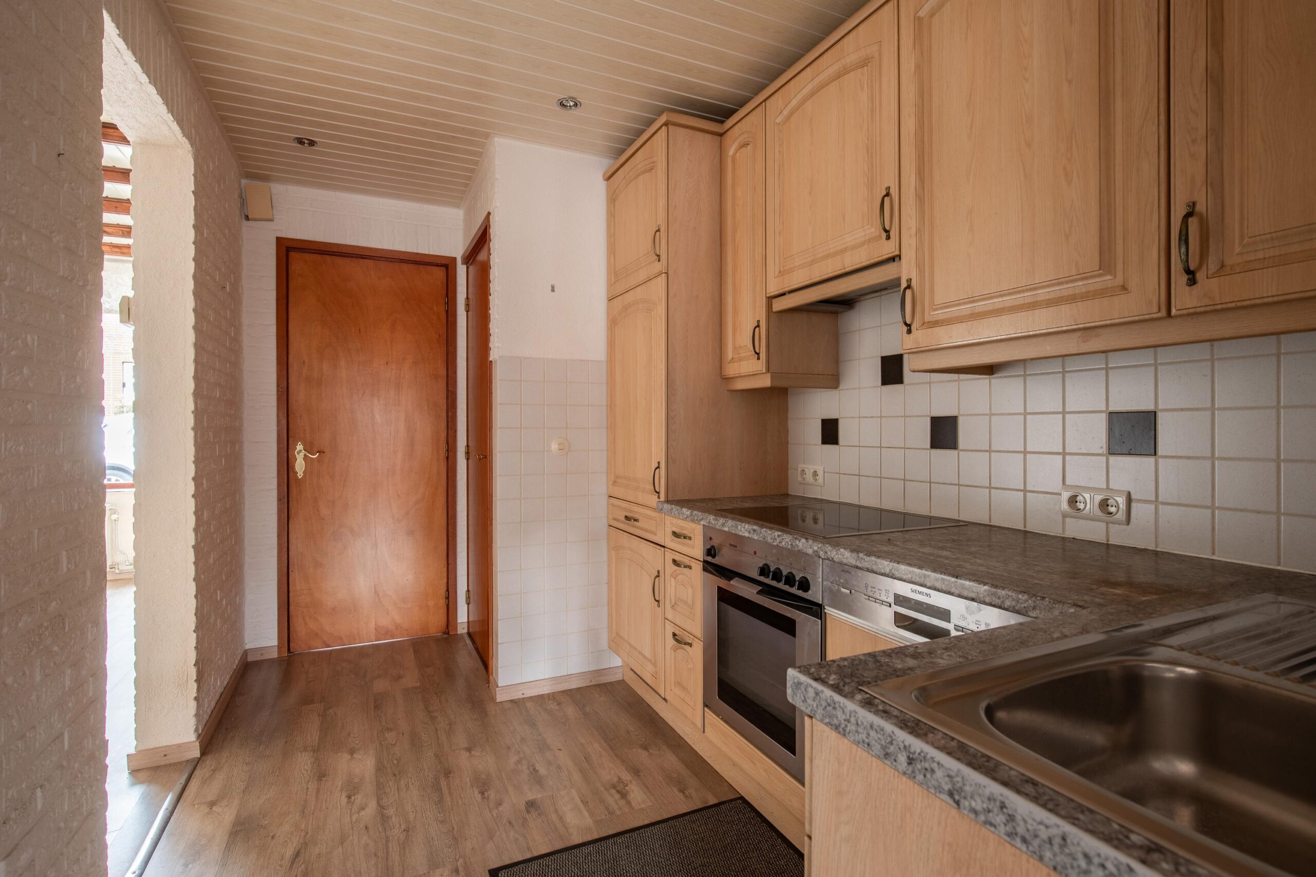 De gesloten keuken is volledig betegeld en voorzien van een beuken keukeninstallatie in hoekopstelling, uitgerust met: keramische kookplaat, oven, koelkast, Siemens vaatwasser, vlakscherm afzuigkap, spoelbak en ingebouwde ledverlichting.