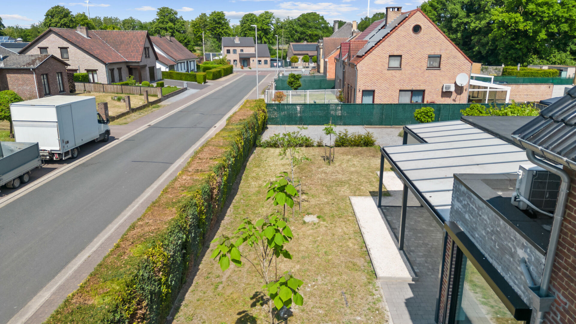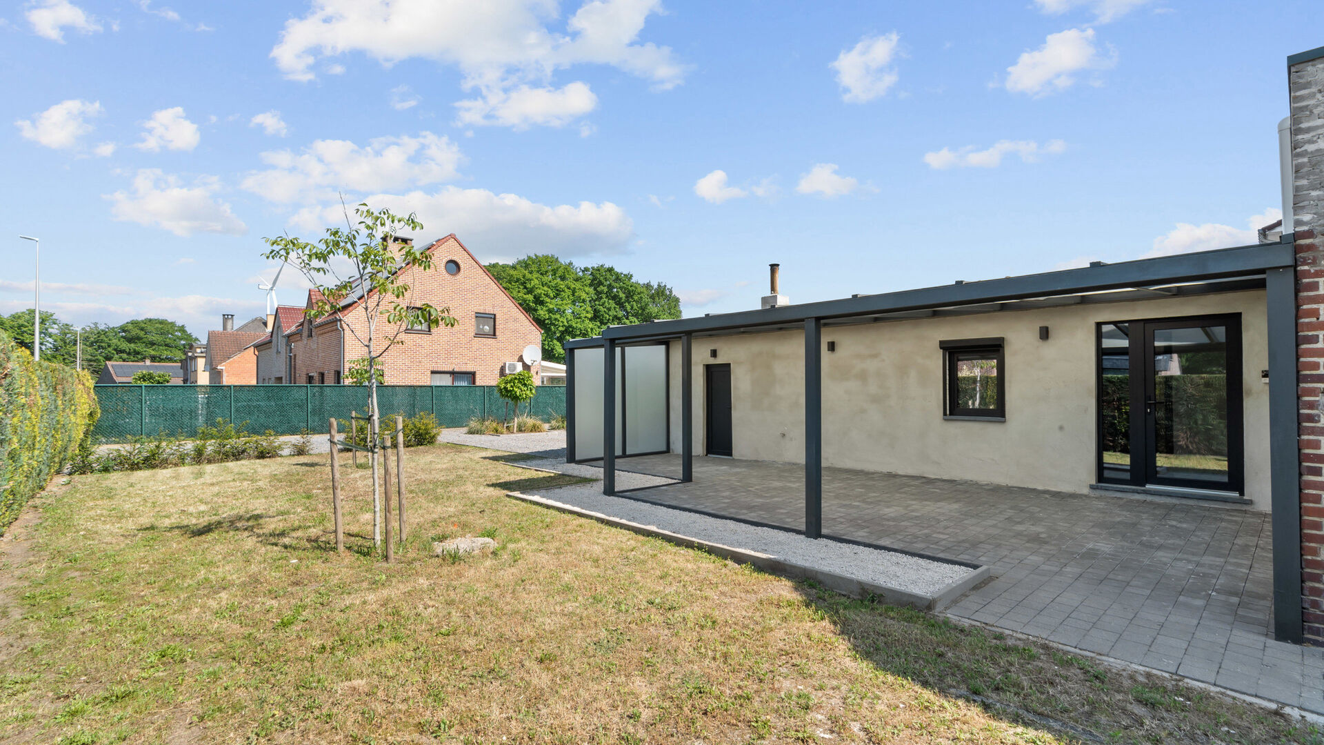 Achteraan ligt een verzorgd aangelegde tuin met een groot terras in klinkers, sfeervolle terrasverlichting en een overkapping waar ook een handige tuinberging met grondwaterpomp is voorzien. De tuin is ingedeeld met een grasgedeelte, enkele boompjes en een stuk met sierkiezel. Aan de zijkant van het huis bevindt zich een oprit met afsluitbare poort. De kelder biedt extra opbergruimte en huisvest de elektriciteitskast.