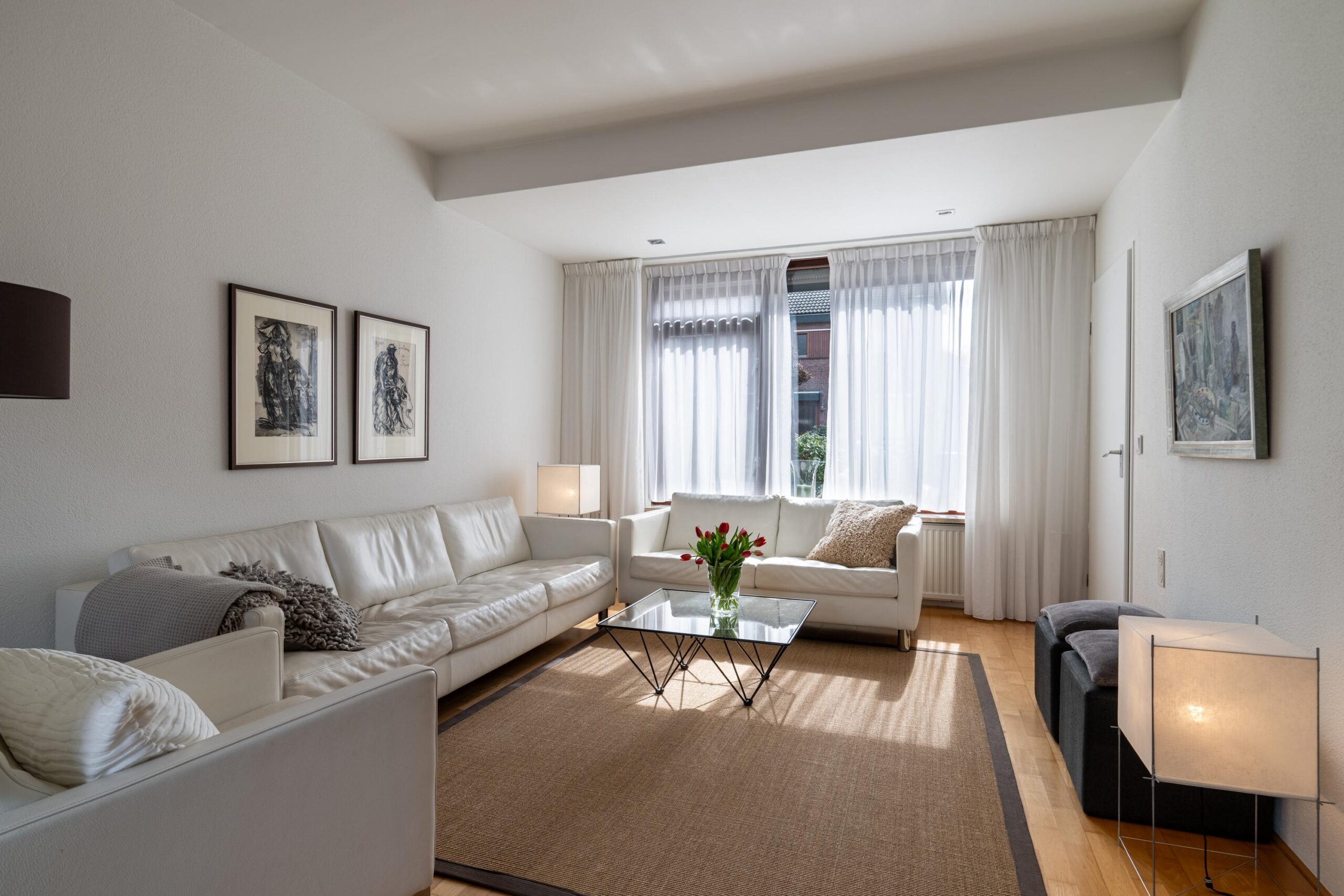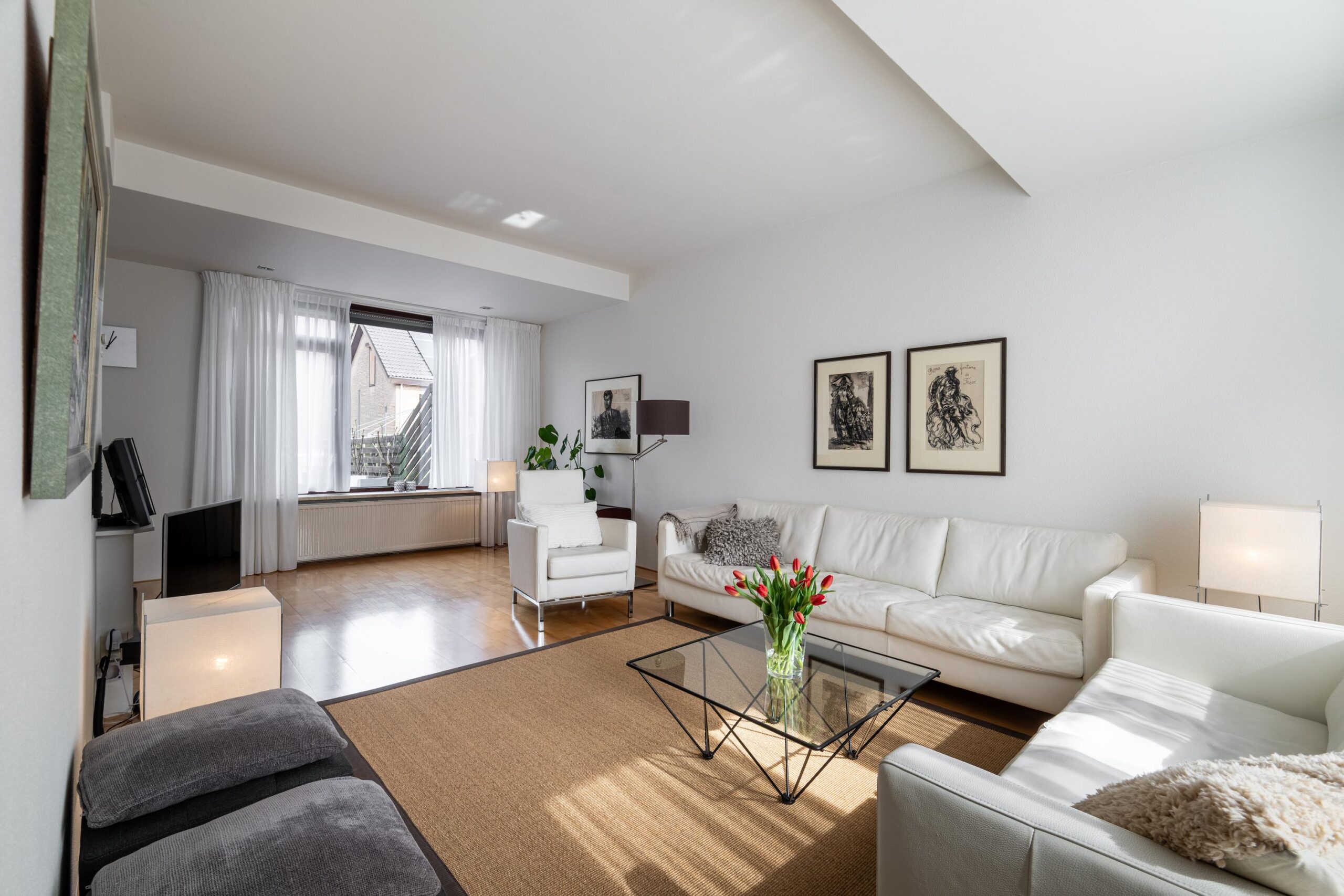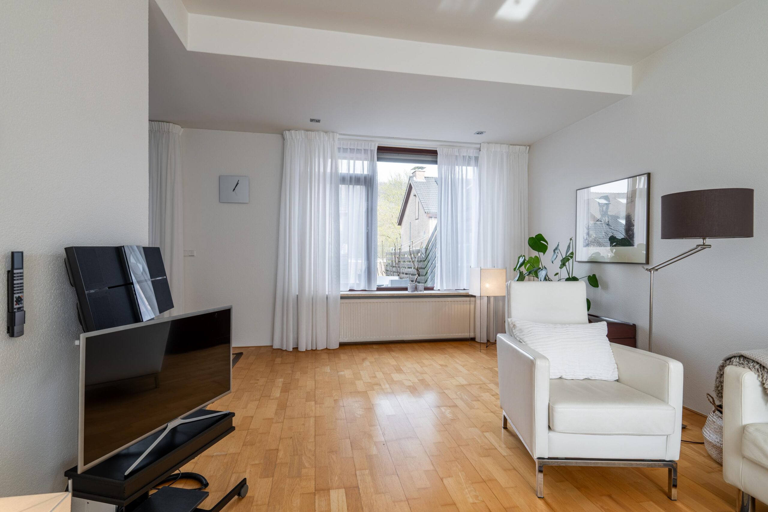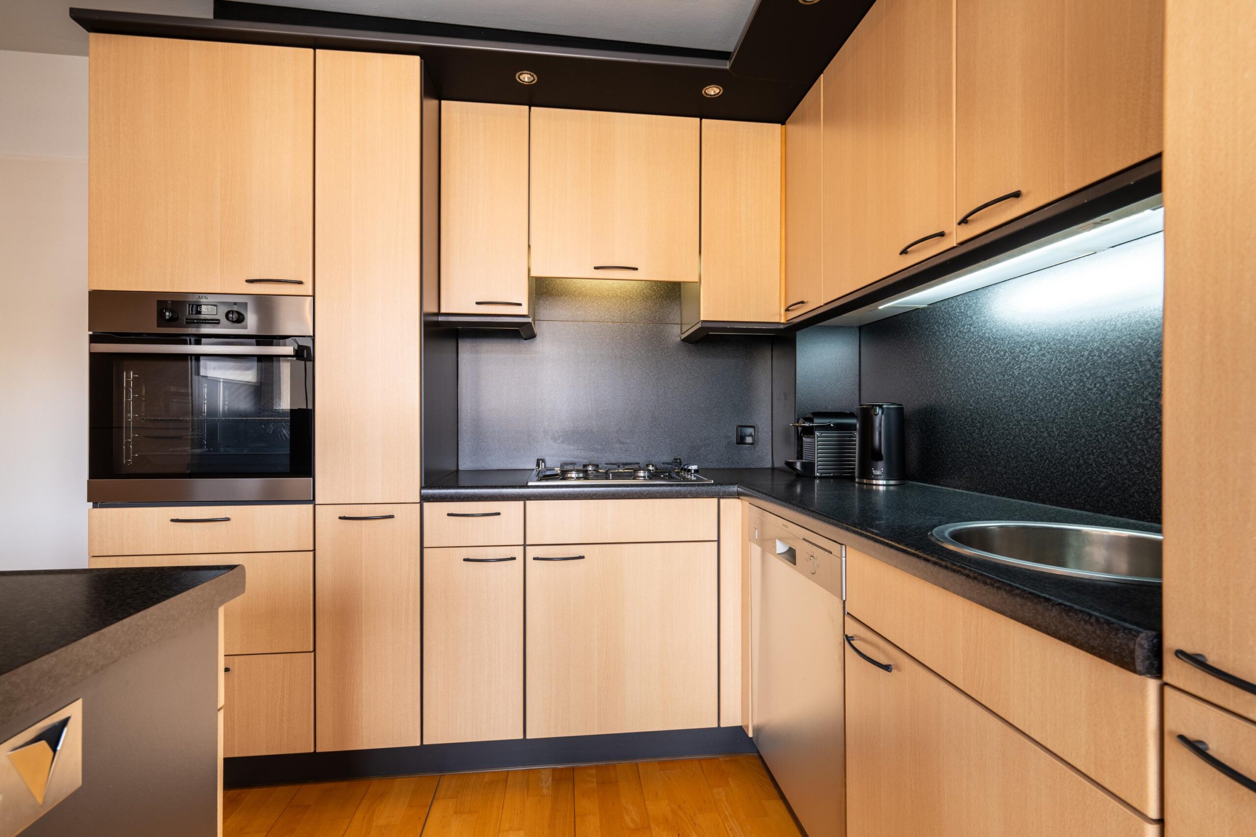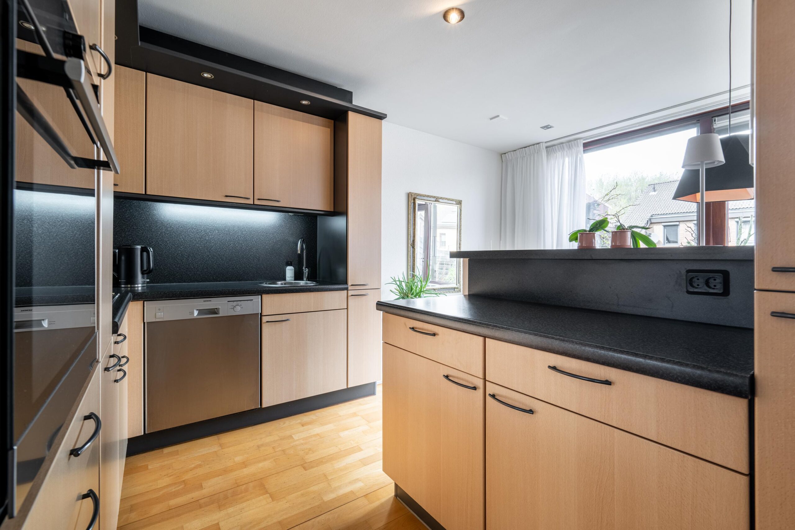 De lichte doorzonwoonkamer kenmerkt zich door een uitstekende lichtinval en een prettige indeling. De aangrenzende L-vormige keuken in houtlook is uitgerust met diverse inbouwapparatuur, waaronder een koelkast, gaskookplaat, oven, vaatwasser, afzuigkap en spoelbak. De gehele living is afgewerkt met een stijlvolle parketvloer.