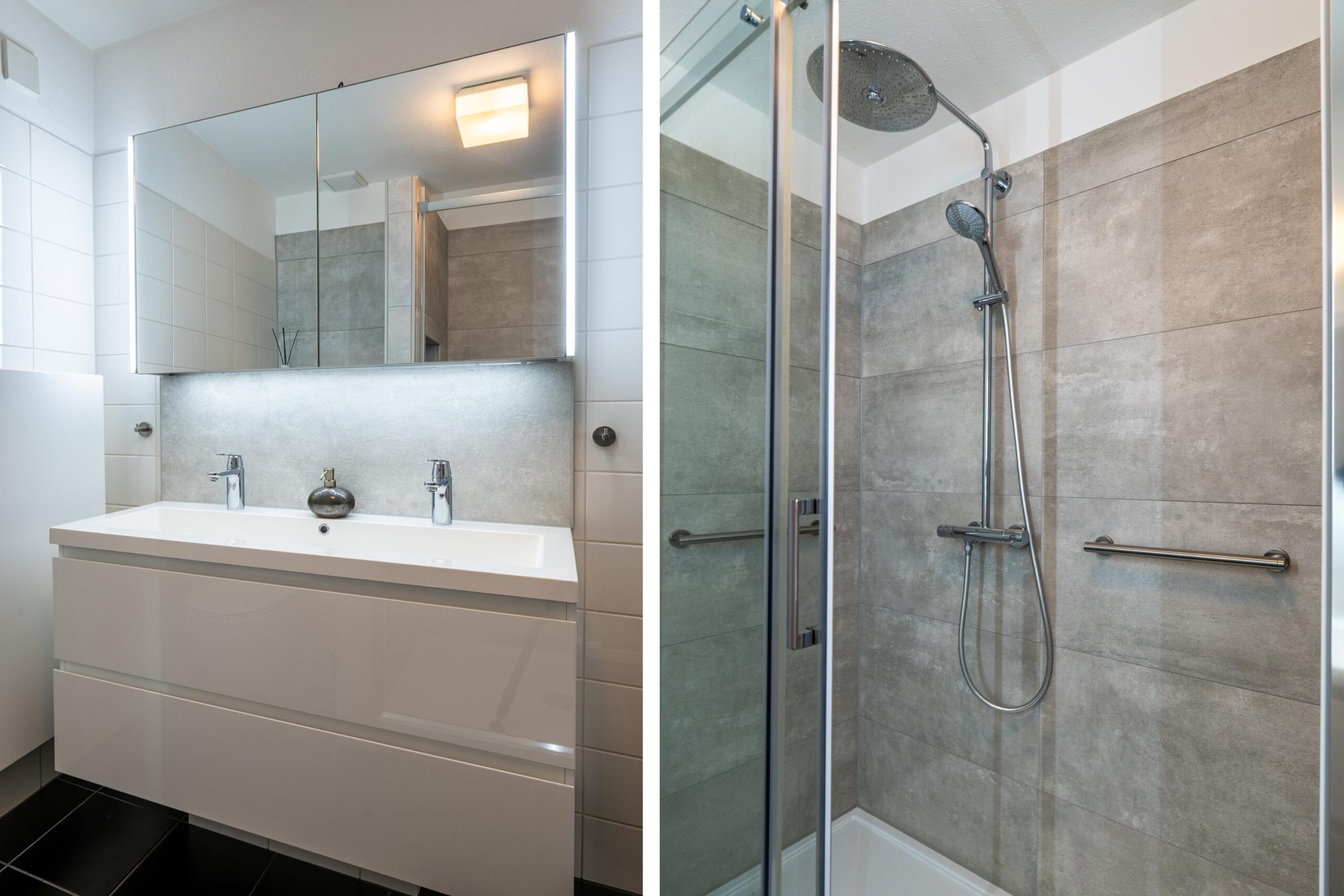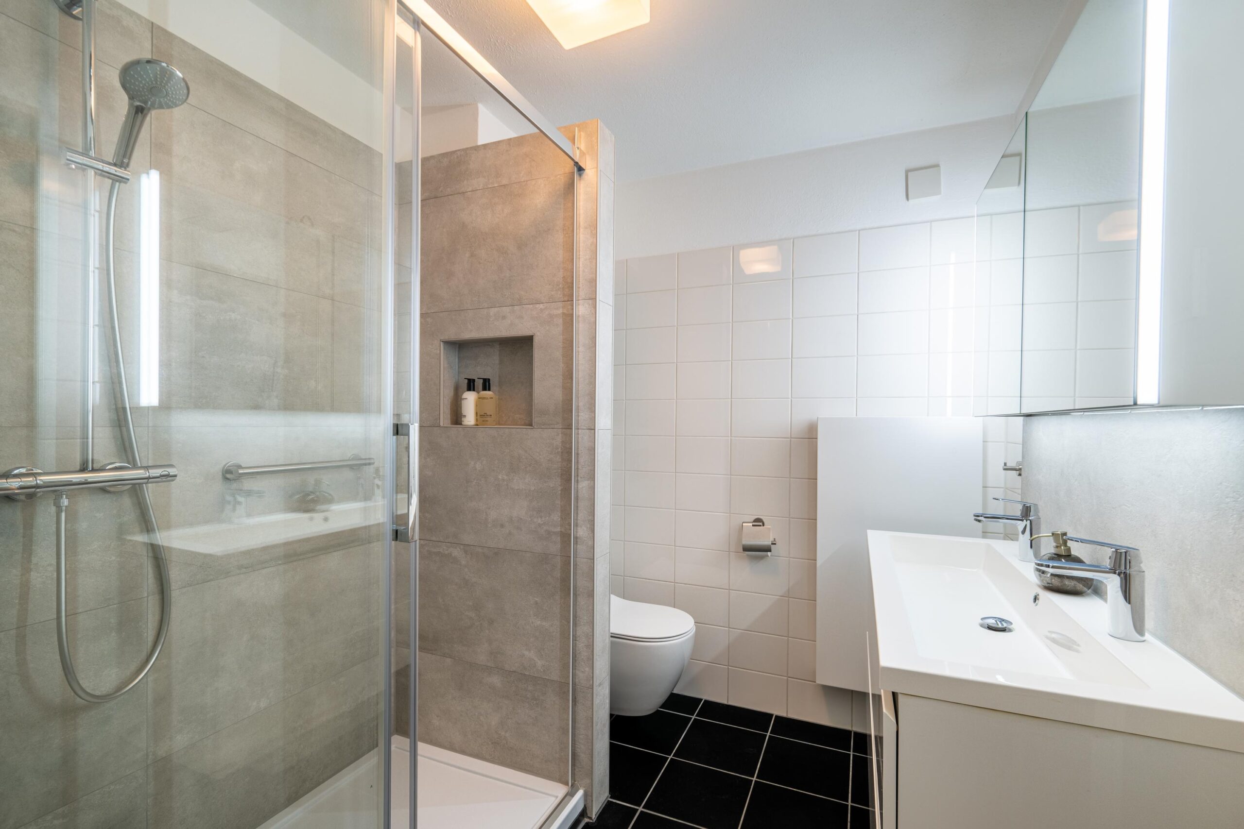 De royale en moderne badkamer is compleet ingericht met een ruime regendouche, een wastafel met dubbele kraan en een tweede vrijhangend toilet.