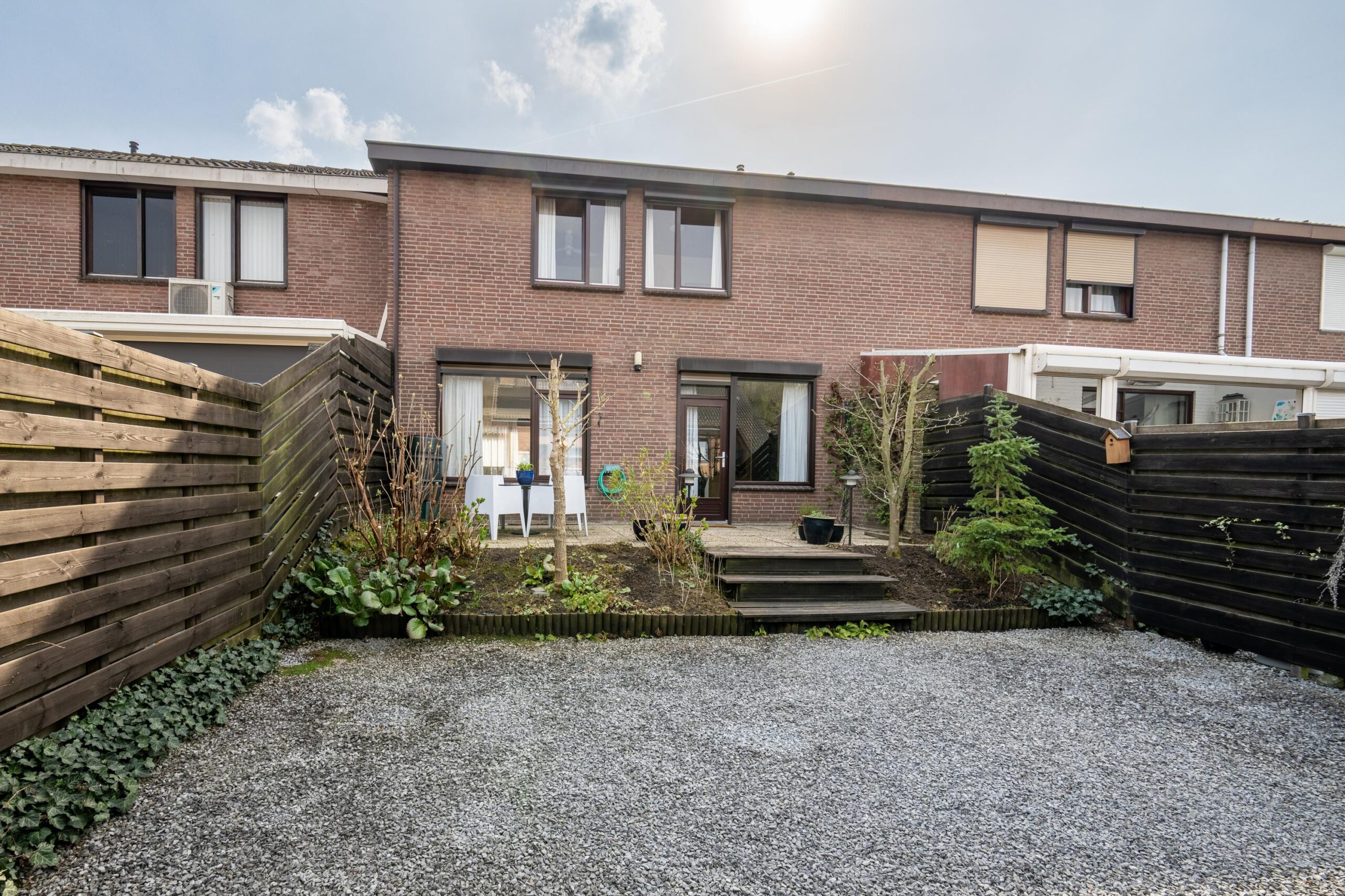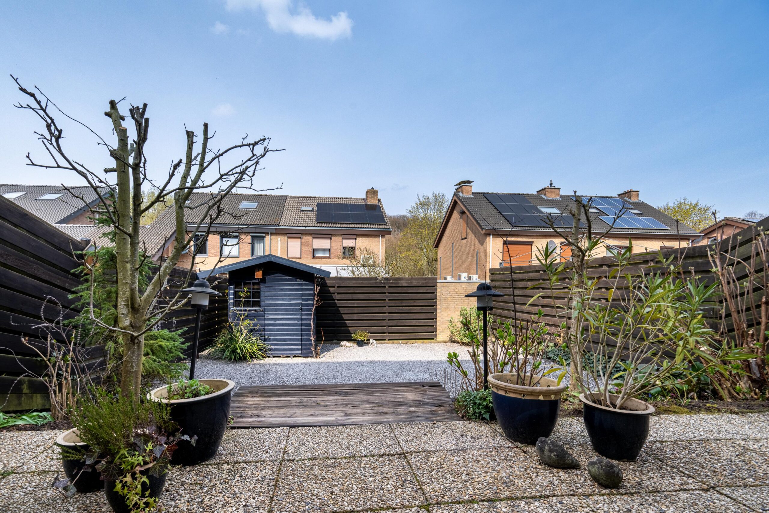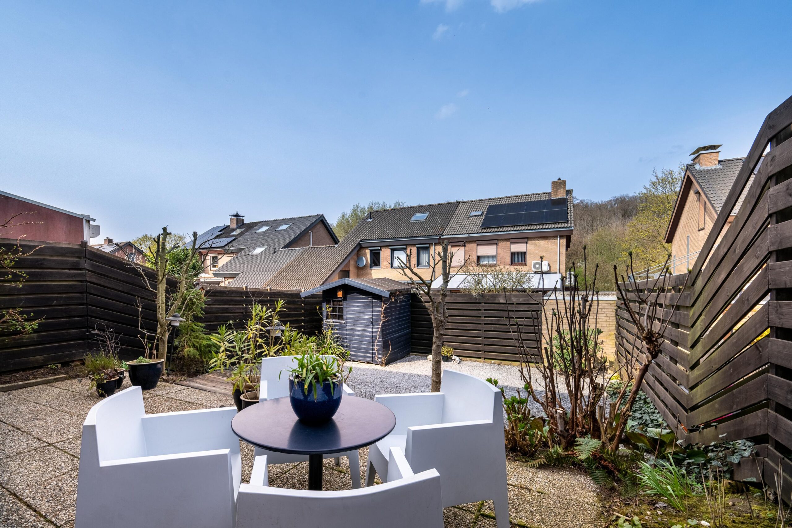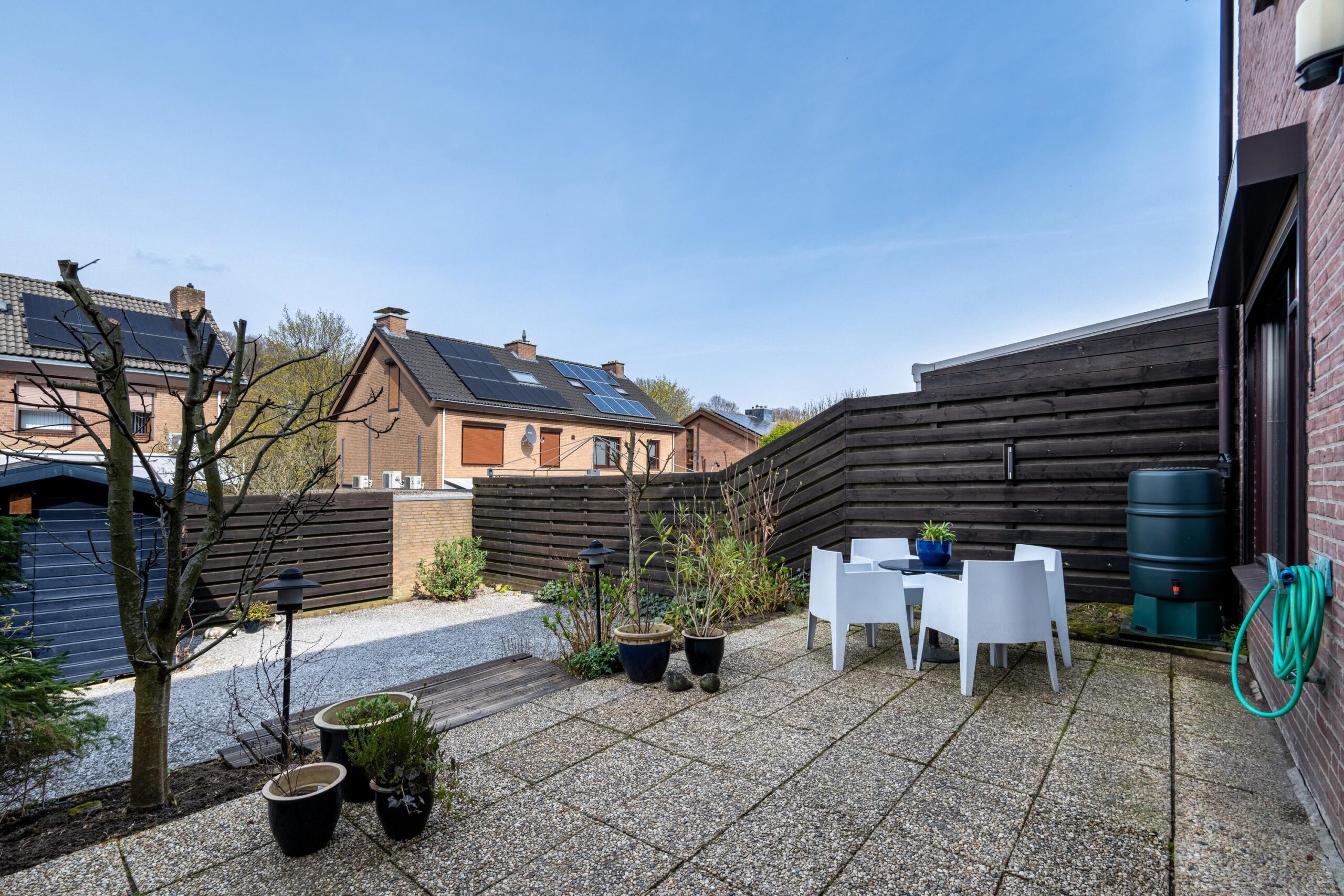 Via de keuken is de geheel omsloten, onderhoudsvriendelijke tuin bereikbaar. De tuin beschikt over een speels niveauverschil, een gezellig zitgedeelte en een praktisch tuinhuis.
