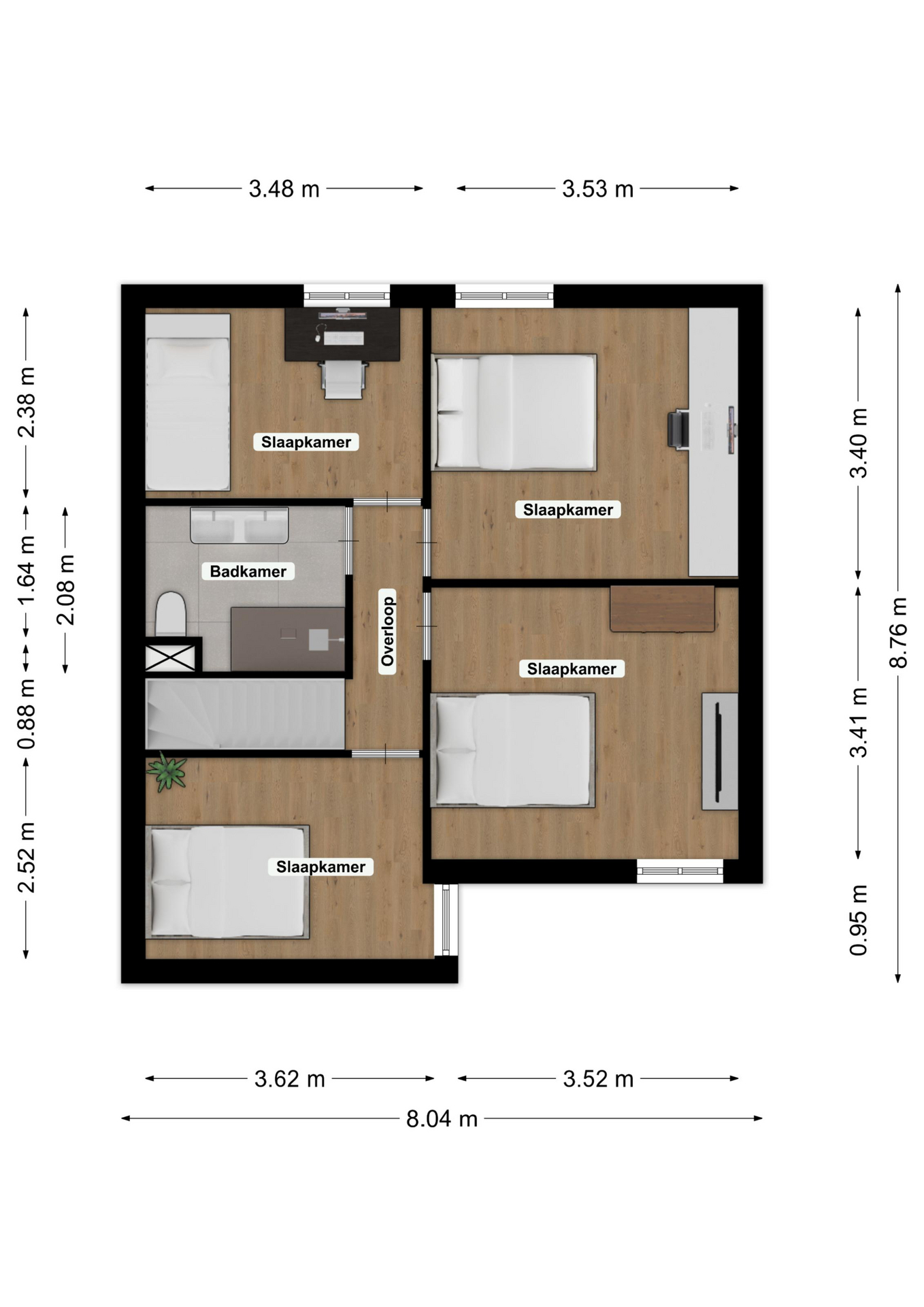 De overloop biedt toegang tot vier goed afgewerkte en ruime slaapkamers, allen voorzien van laminaatvloeren. De slaapkamers zijn respectievelijk groot;
