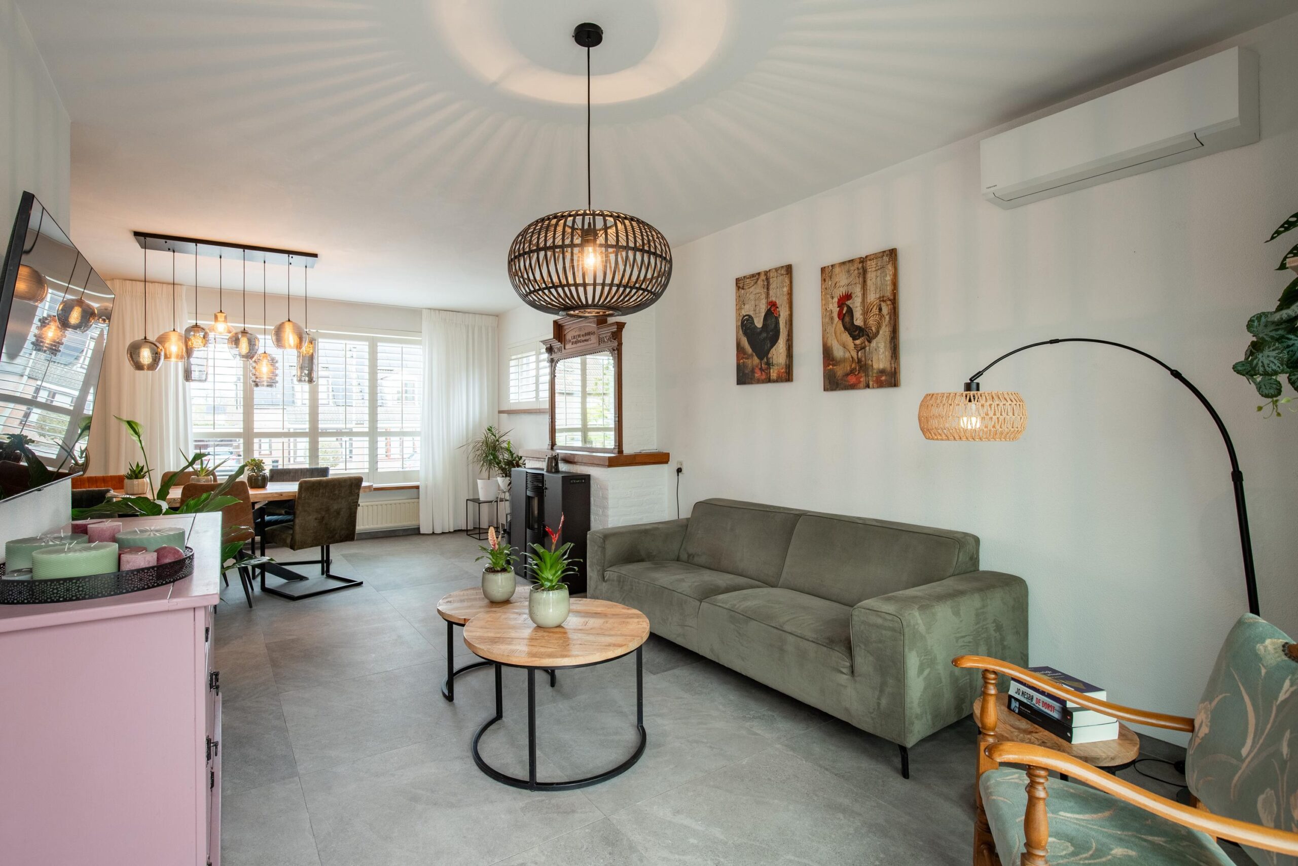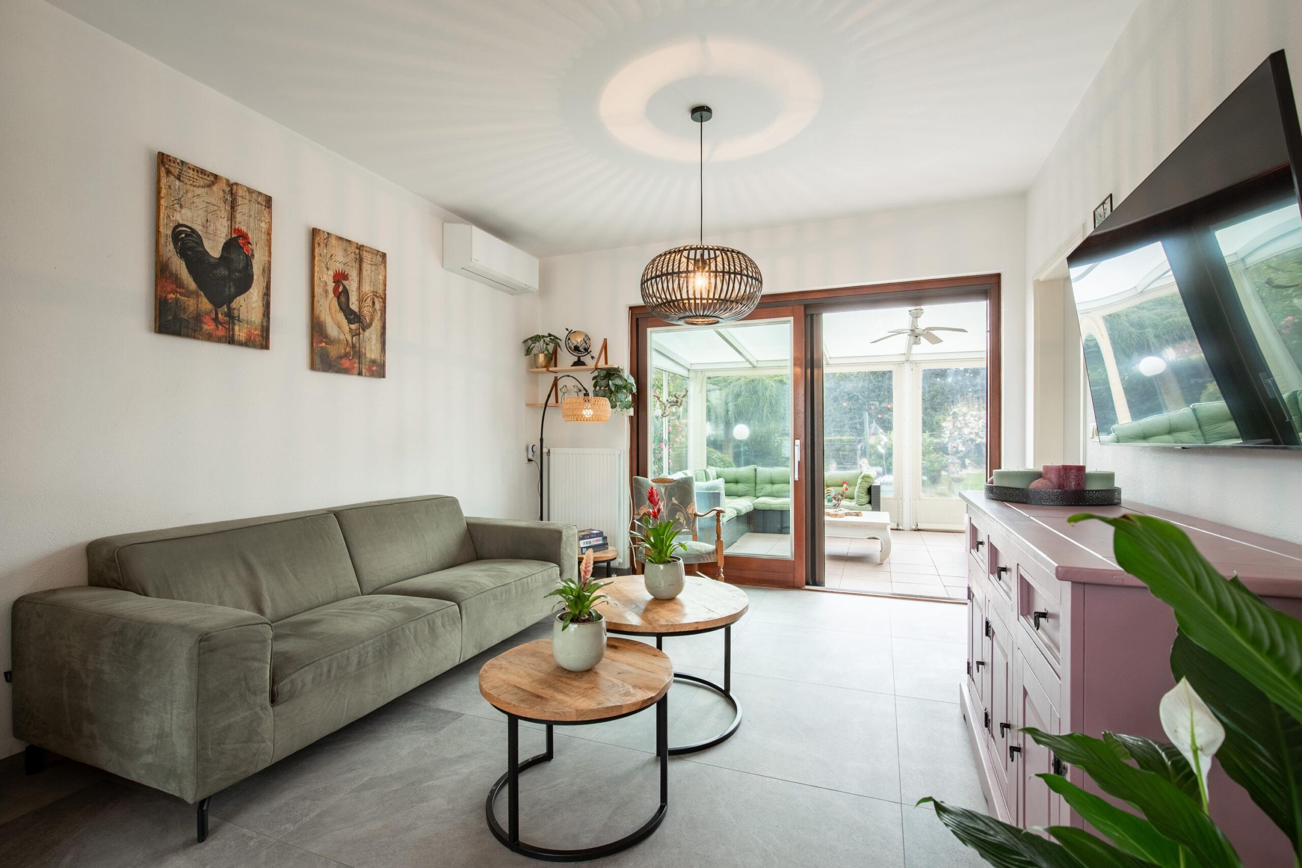 Aansluitend bereik je de woonkamer. Deze ruimte is sfeervol en licht dankzij de grote raampartijen en de schuifpui naar de overkapping. De woonkamer is strak afgewerkt, voorzien van dezelfde tegelvloer en uitgerust met een airco-installatie voor extra comfort tijdens warme dagen. De pelletkachel vormt een centraal en gezellig element in de ruimte, ideaal voor knusse avonden.