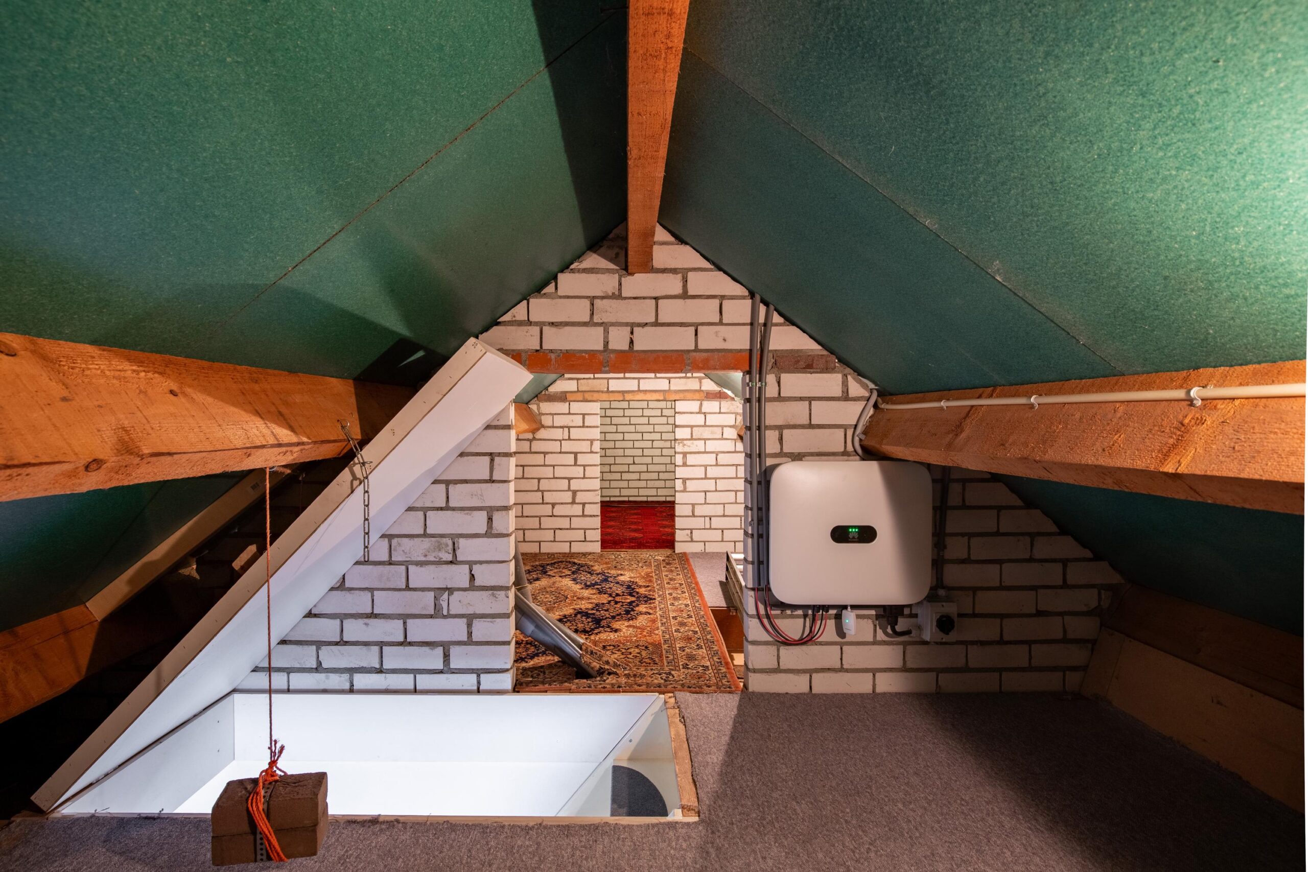 De bergzolder is bereikbaar via een vaste trap vanuit de grootste slaapkamer en biedt volop ruimte voor het opbergen van spullen. Tevens is hier de omvormer van de zonnepanelen geplaatst.