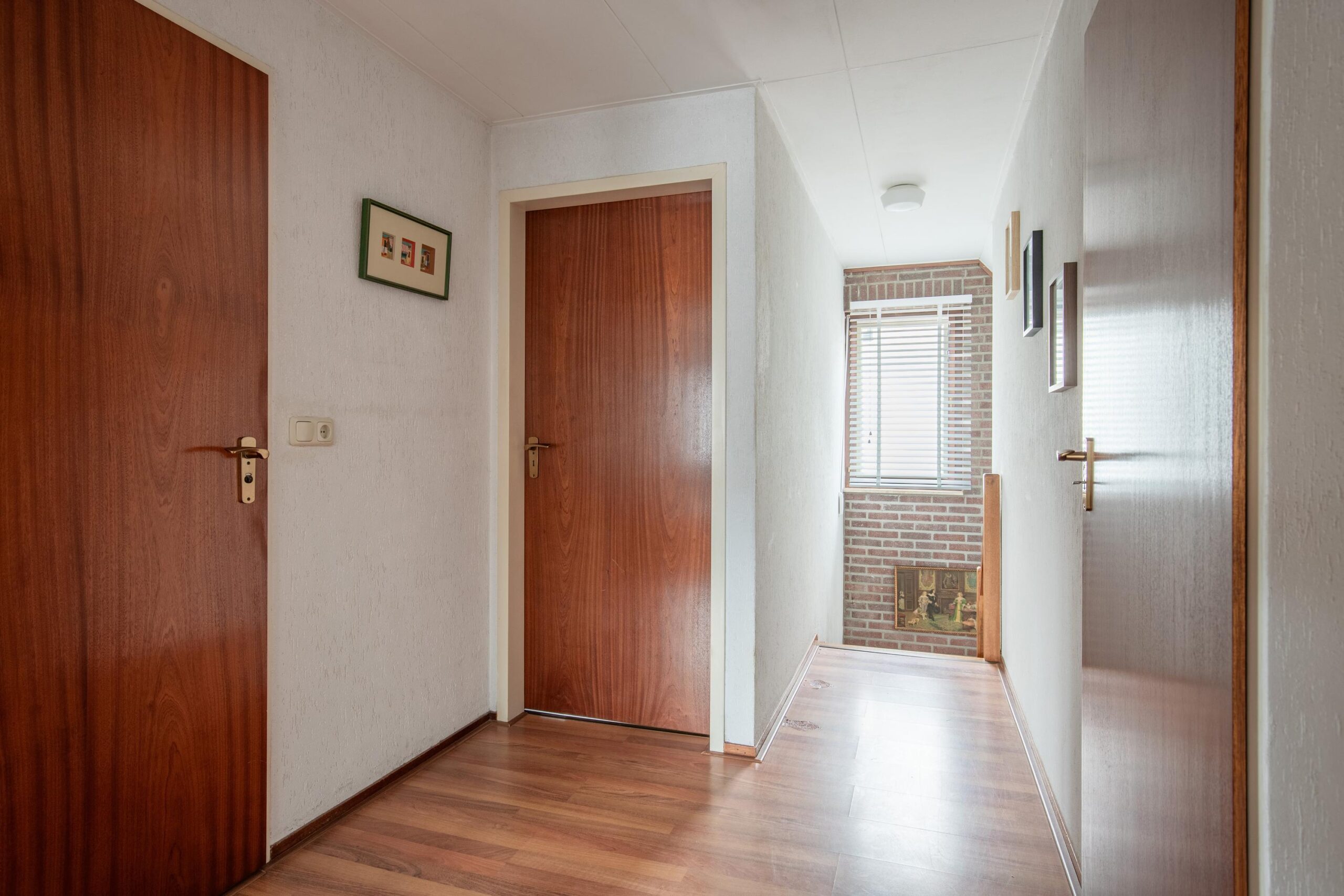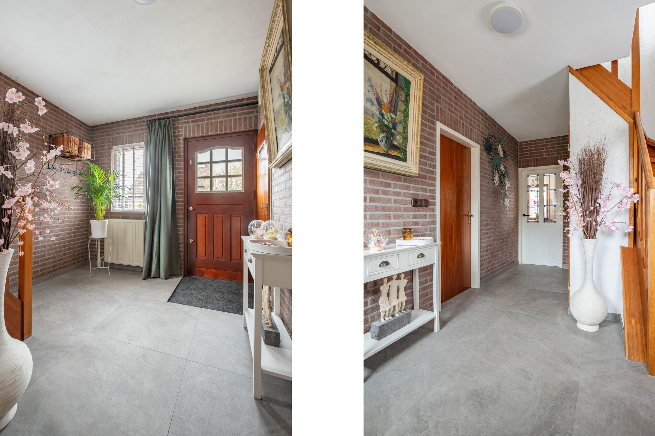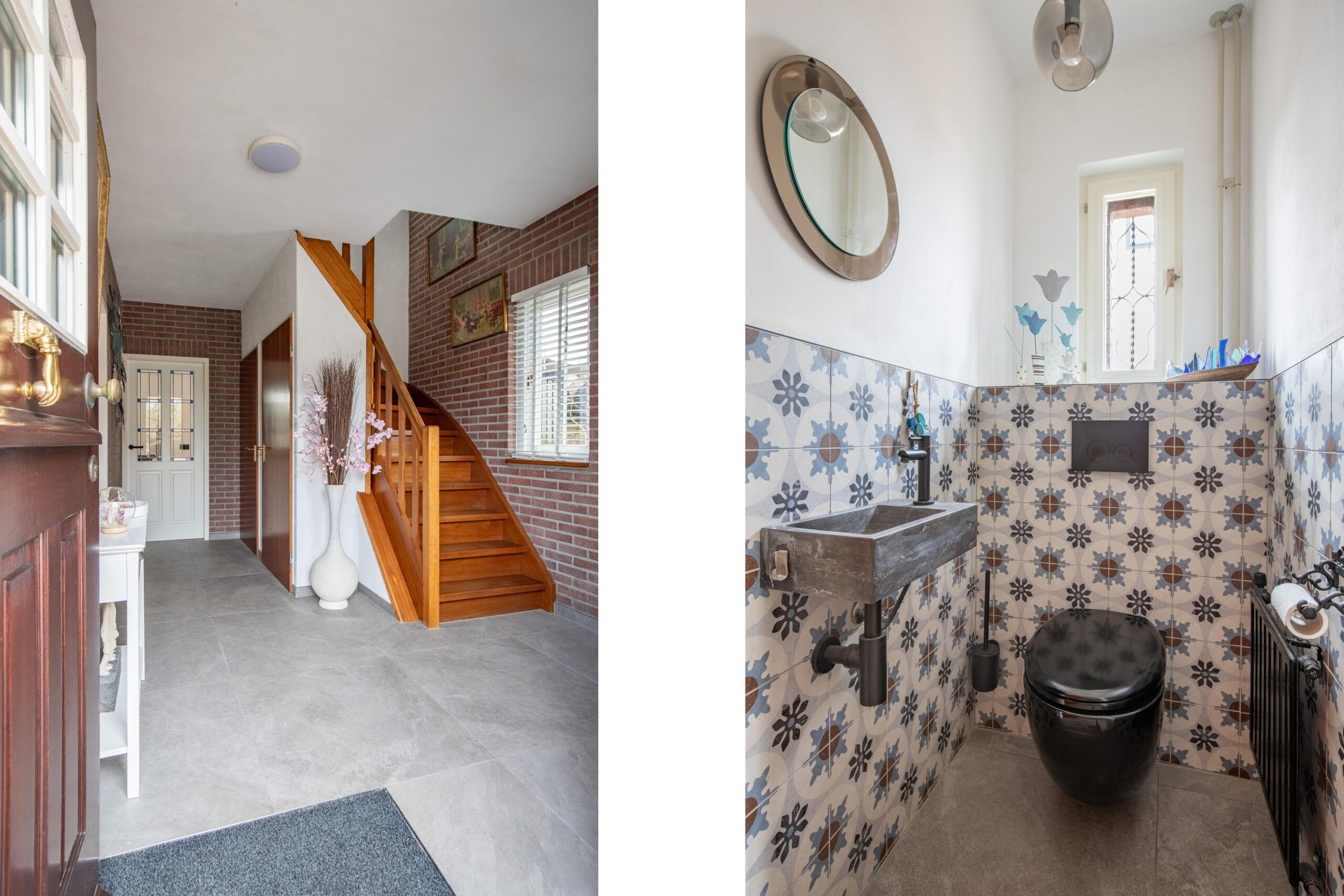 Bij binnenkomst valt direct de ruime en verzorgde hal op, die een prettige eerste indruk geeft van de woning. Vanuit hier heb je toegang tot de trap naar de eerste verdieping, het toilet, de meterkast en de trap naar het souterrain. De tegelvloer die je hier ziet, loopt naadloos door over de gehele begane grond en zorgt voor een rustige en uniforme uitstraling.