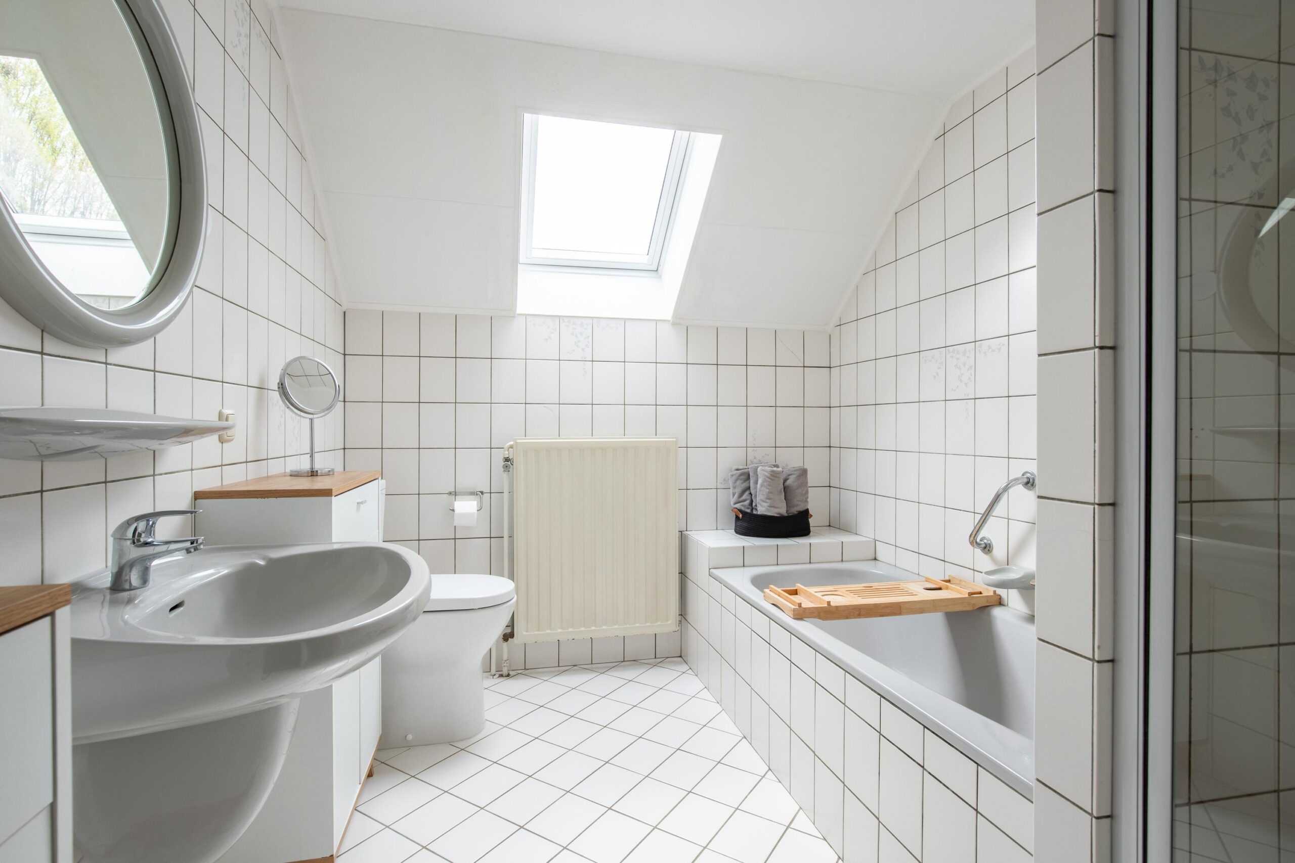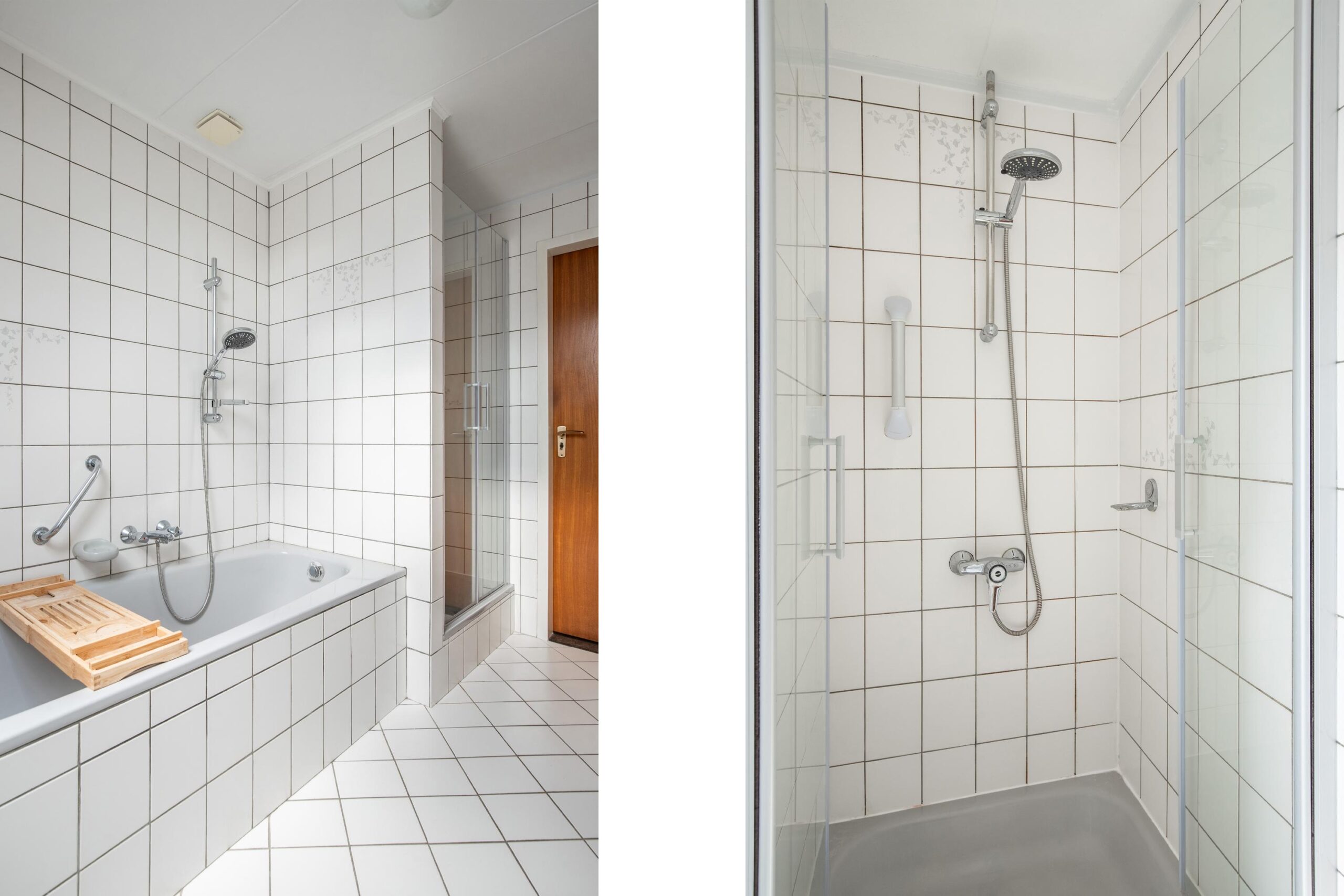 De badkamer is volledig betegeld en voorzien van een ligbad, douche, wastafel en toilet. Hoewel de badkamer functioneel is, is deze gedateerd en biedt daarmee een uitstekende kans om deze geheel naar eigen smaak te moderniseren en om te vormen tot een eigentijdse wellnessruimte.
