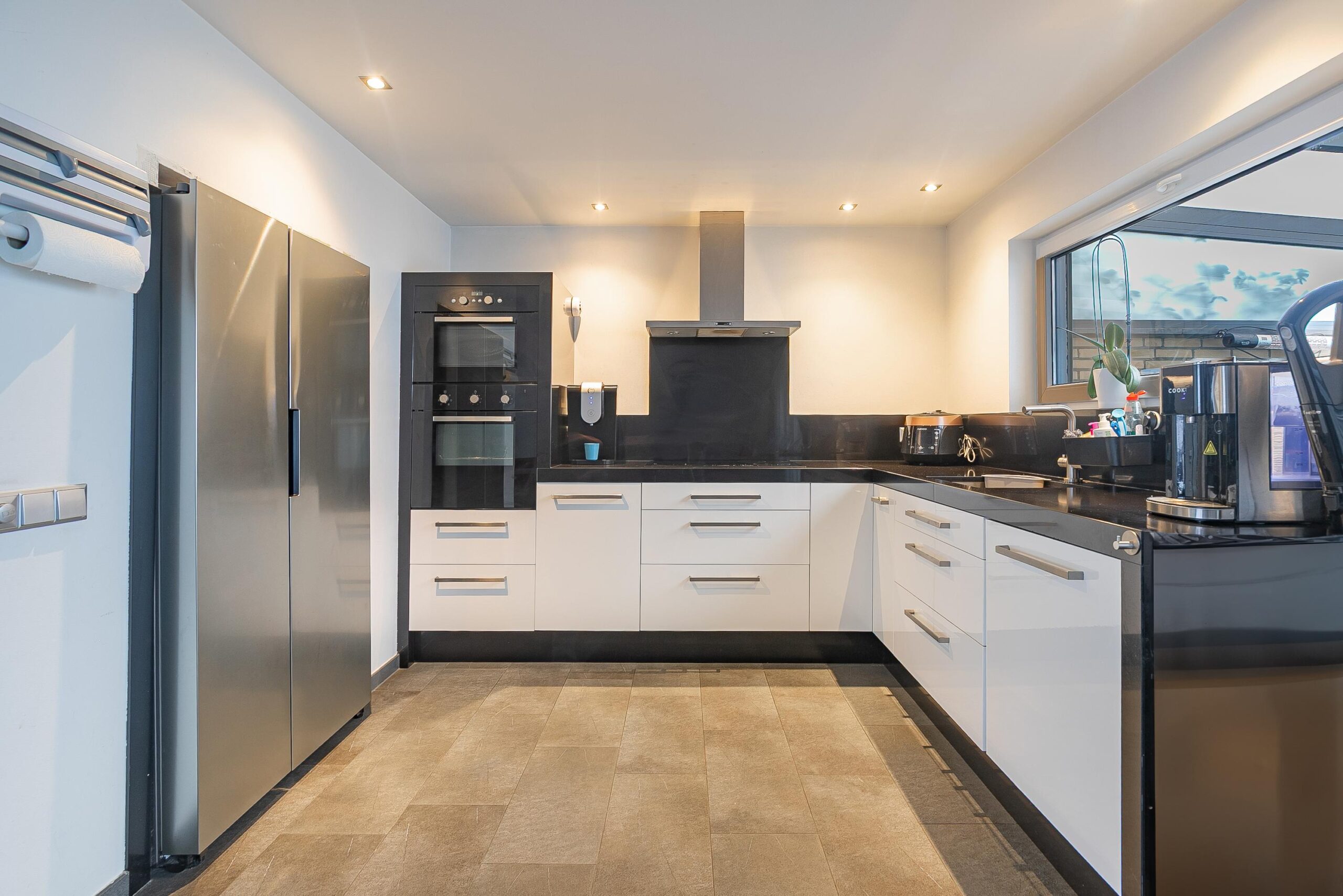 Open hoogglans keuken in L-vorm inclusief navolgende apparatuur: koel-, vriescombinatie, oven, magnetron,
