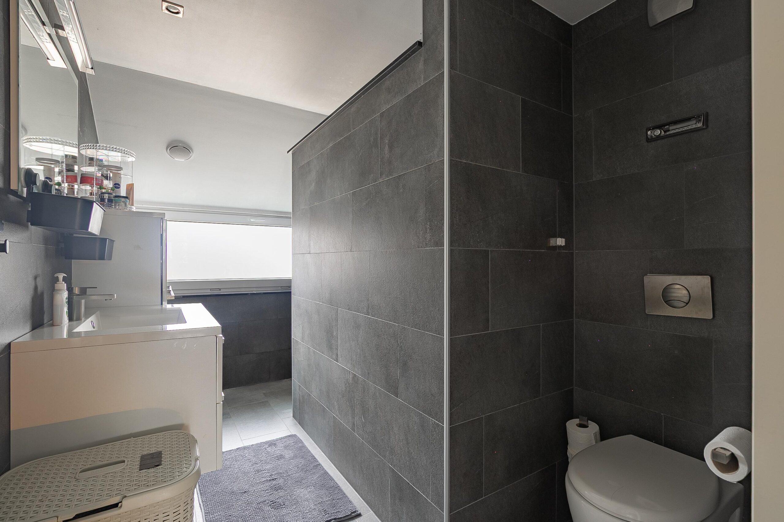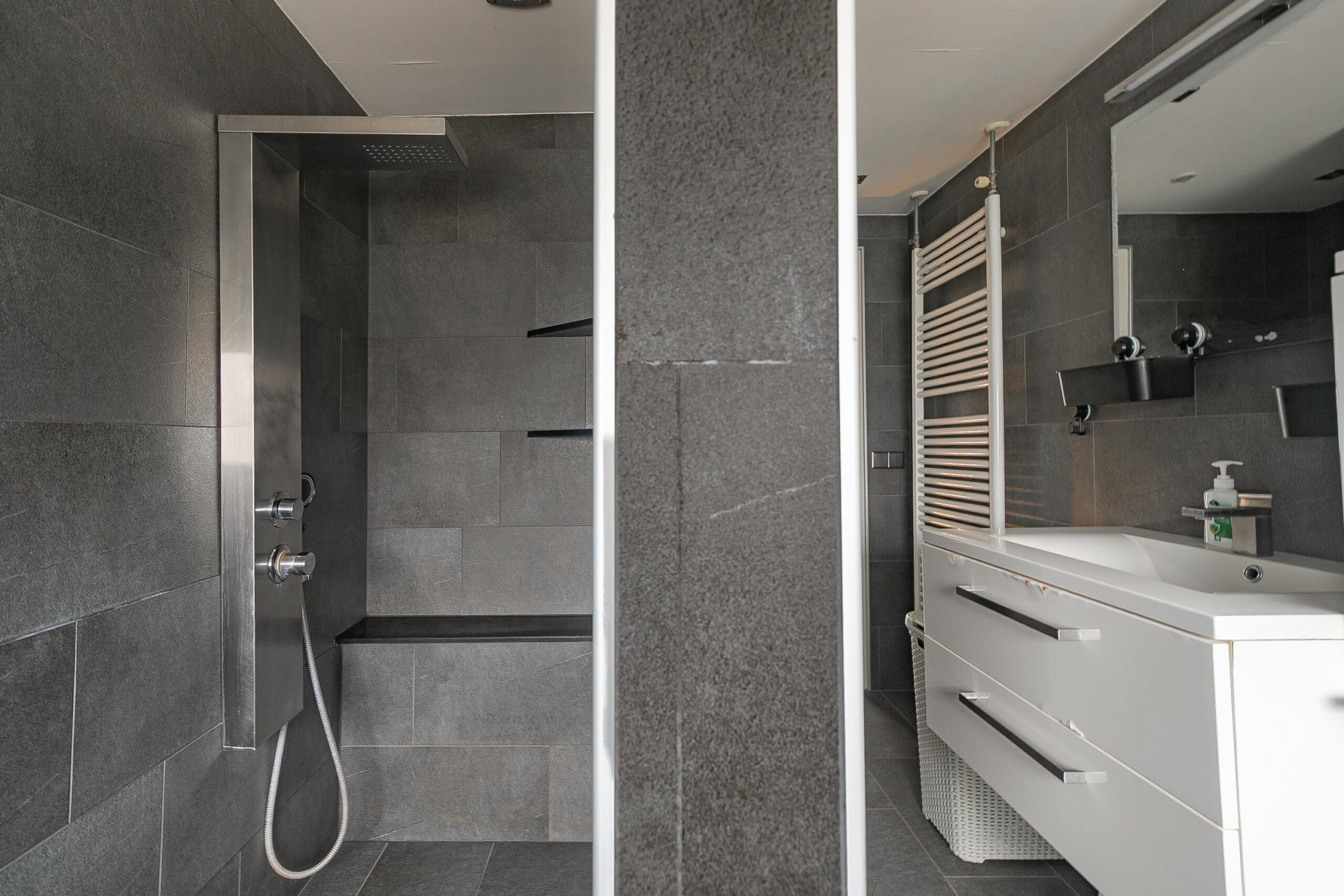 Moderne badkamer met grote inloopdouche, badmeubel met vaste wastafel, 2e zwevend toilet en design radiator.
