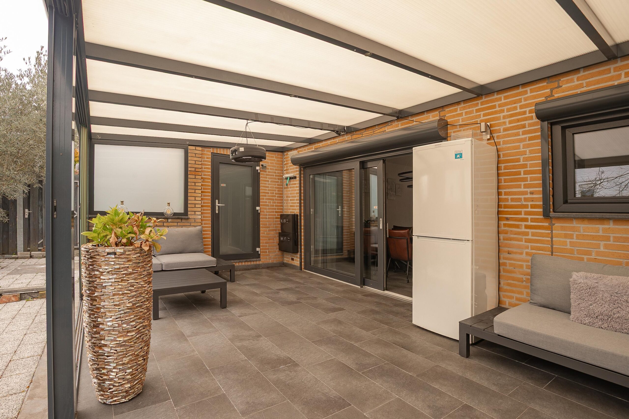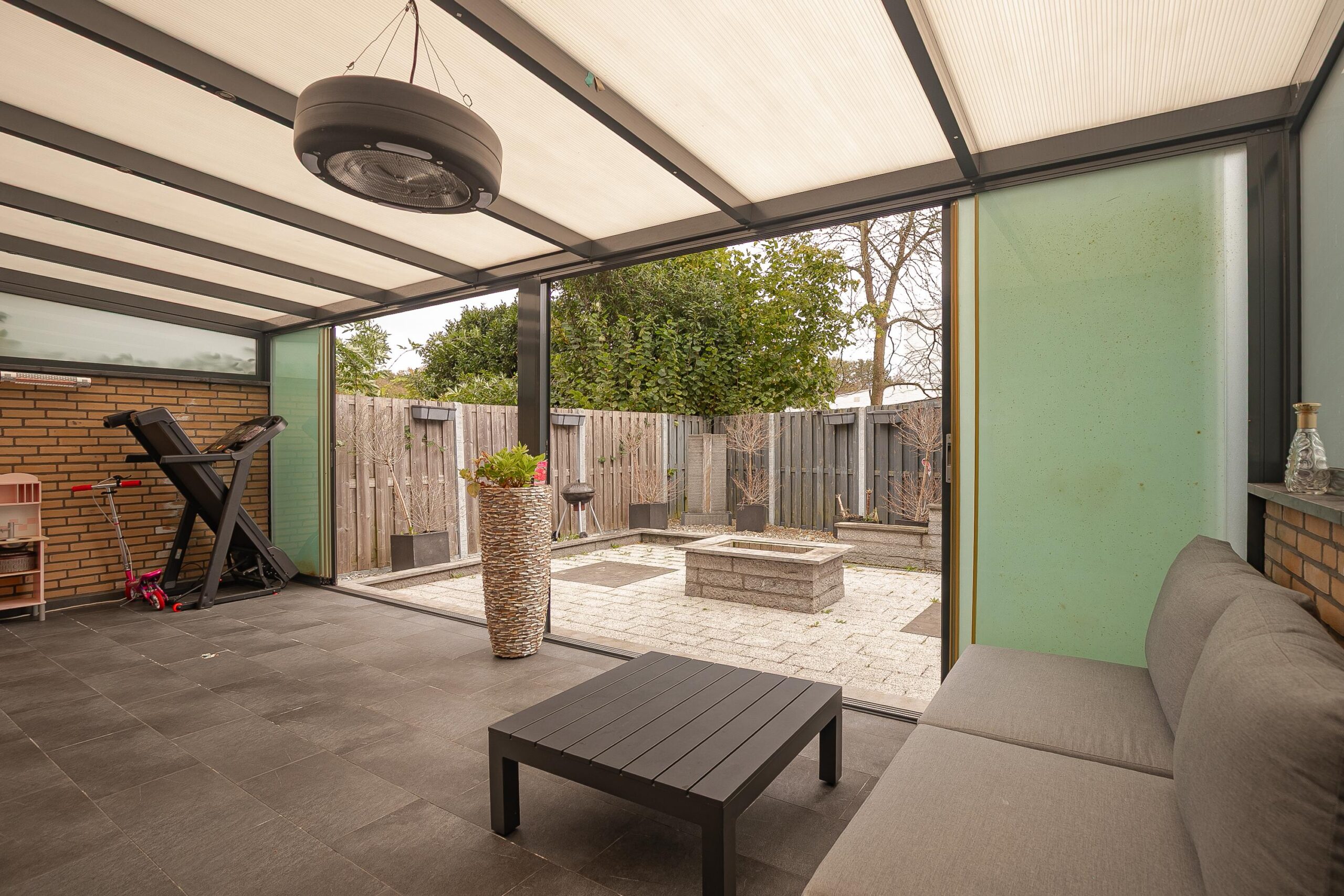 Via de serre toegang naar de onderhoudsvrije goed omheinde tuin.