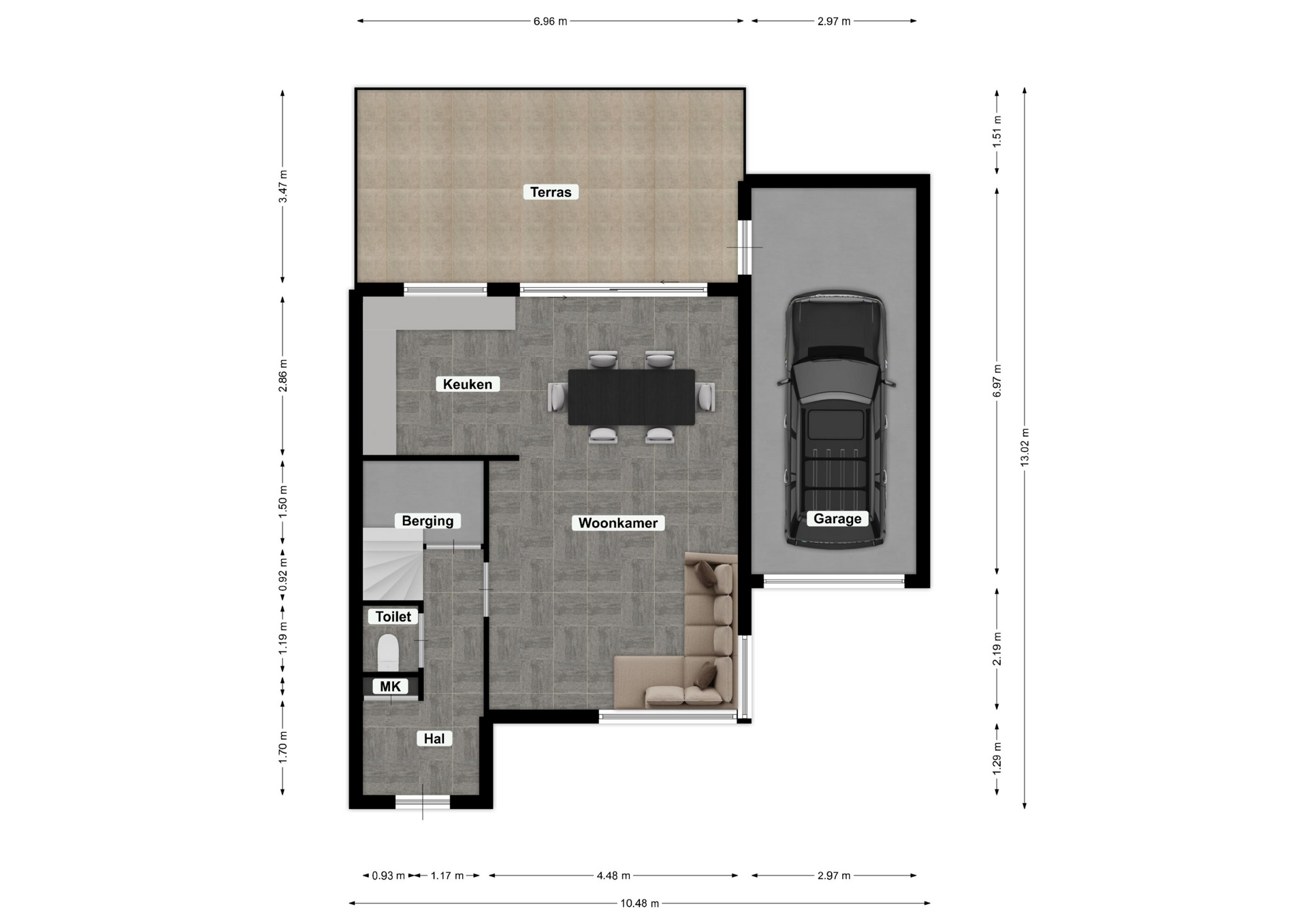 Via de serre toegang naar de garage met elektrisch bedienbaar sectionaal poort.