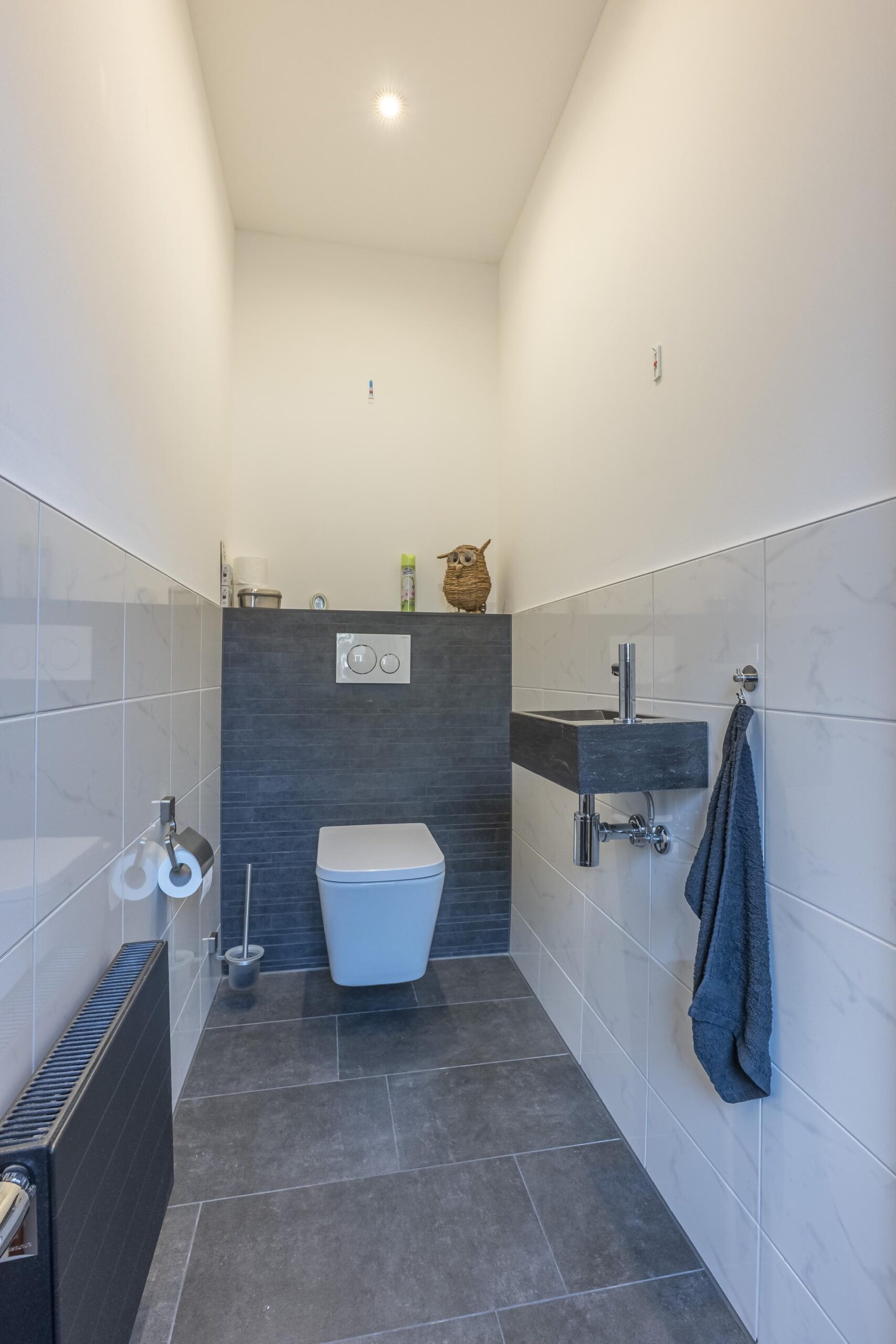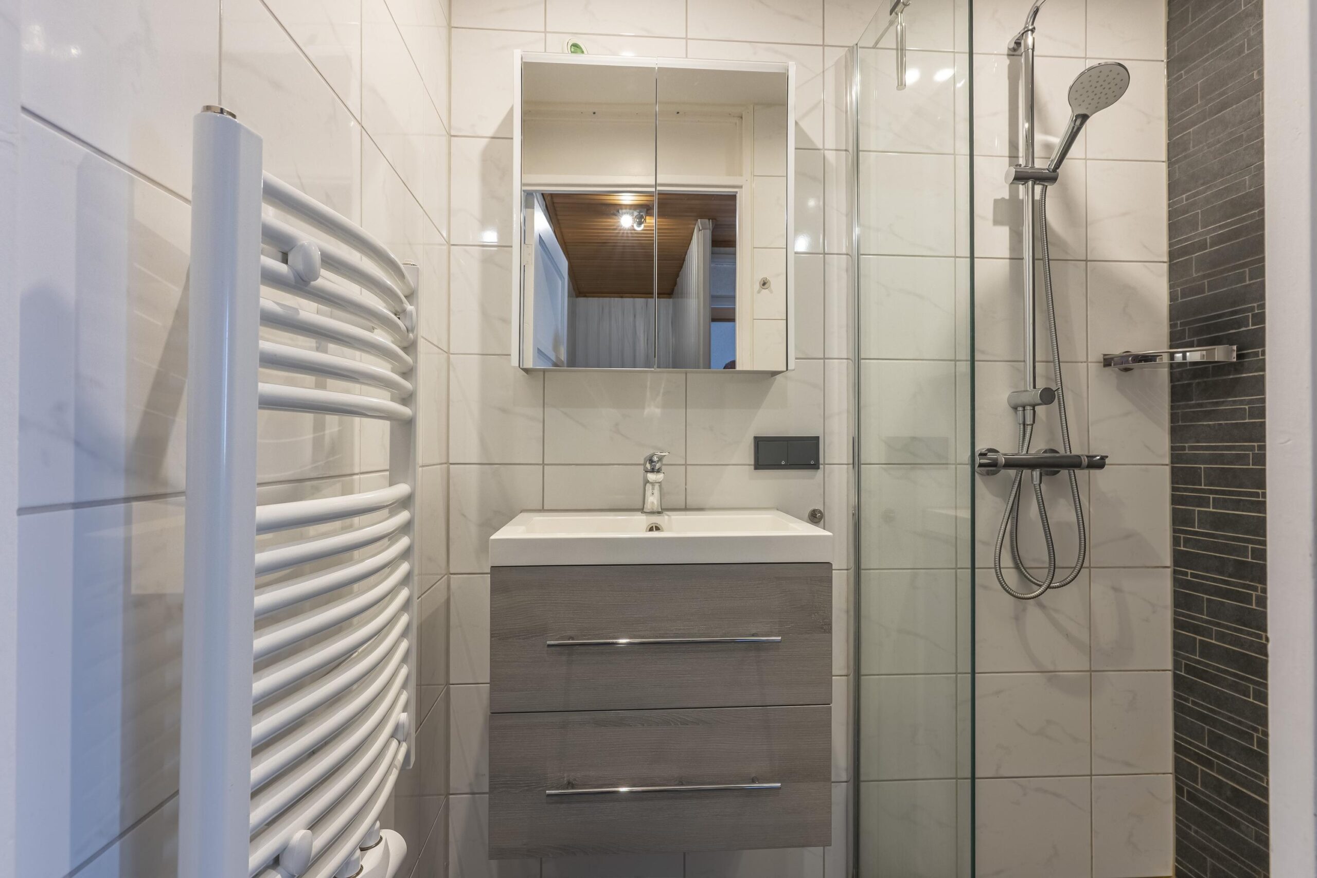 Eerste verdieping: overloop, drie slaapkamers, waarvan één met muurkast. De geheel betegelde badkamer is in 2020 vernieuwd en ingericht met een douche, badmeubel en design-radiatior.