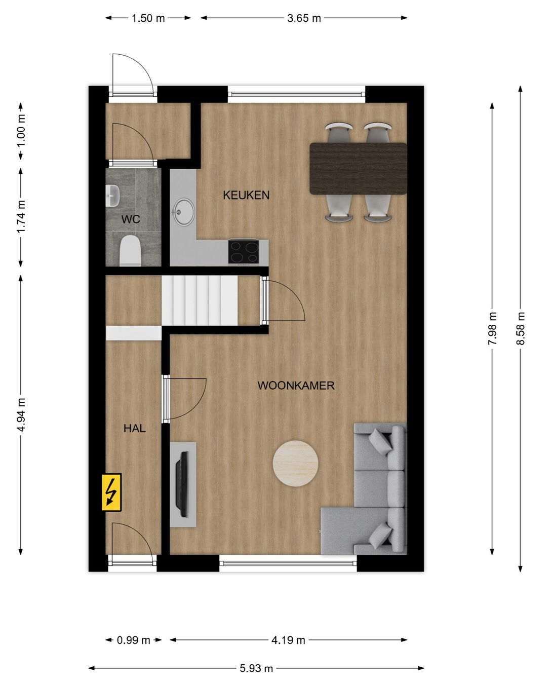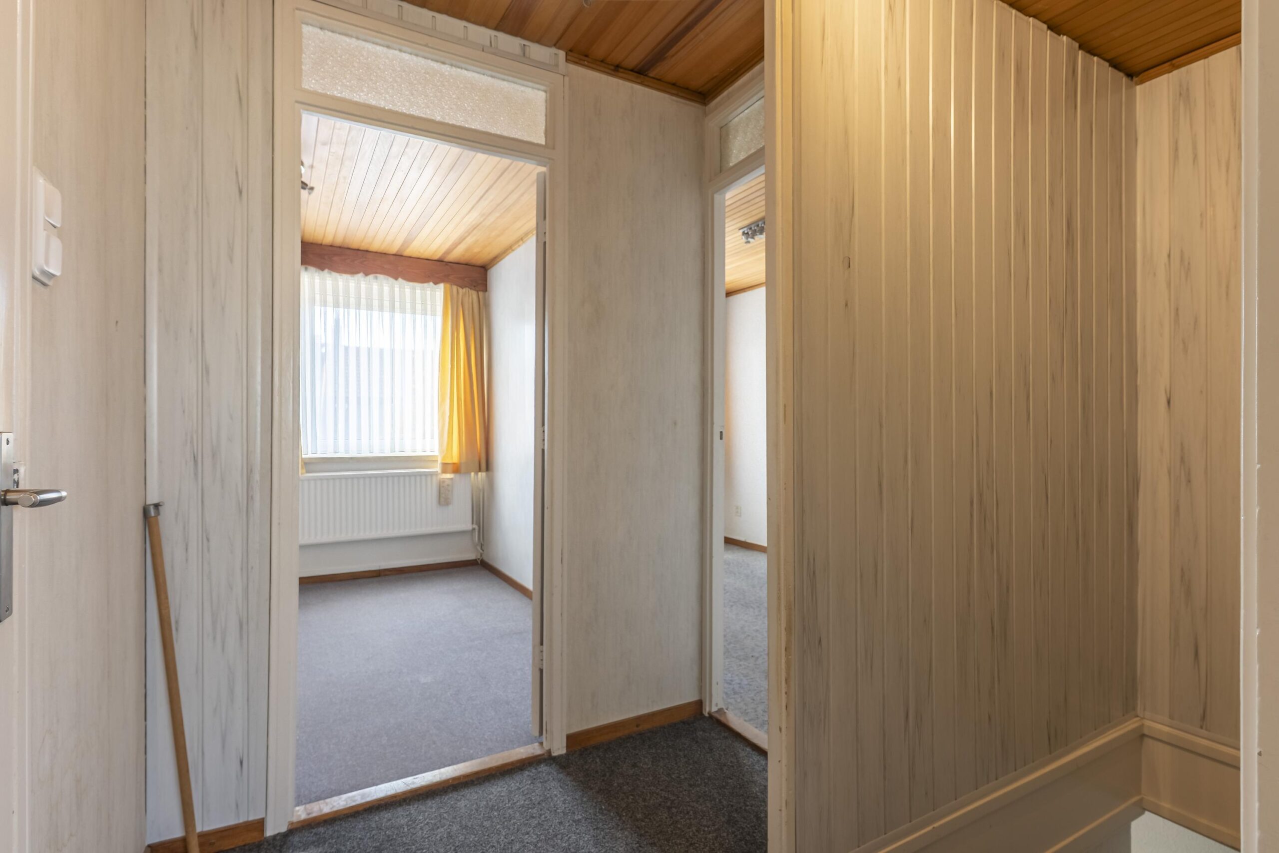 Begane grond: voortuin, entree, hal met meterkast. L-vormige woonkamer met laminaatvloer en open keuken met een eikenhouten-installatie in hoekopstelling voorzien van een 4-pits gaskookplaat, koelkast en afzuigkap. Tevens is hier het in 2021 vernieuwde toilet gelegen; geheel betegeld met fonteintje. Toegang tot de tuin met terras, gazon en borders. De tuin is diep en ook via een achterom gelegen pad te bereiken alsook de oprit. Een stenen buitenberging biedt plaats aan opslag en de stenen/ bettonnen garage is geschikt voor stalling van fiets, auto ed. en beschikt over een kantelpoort.