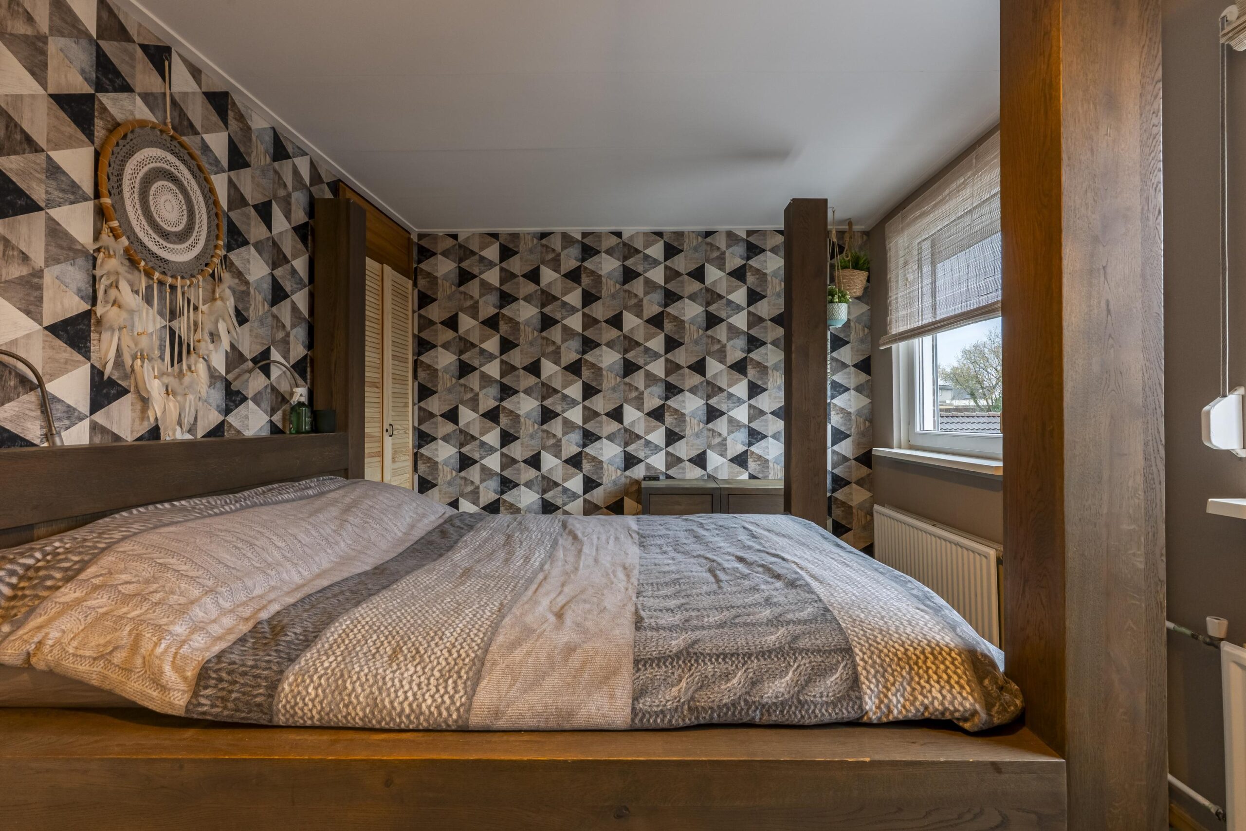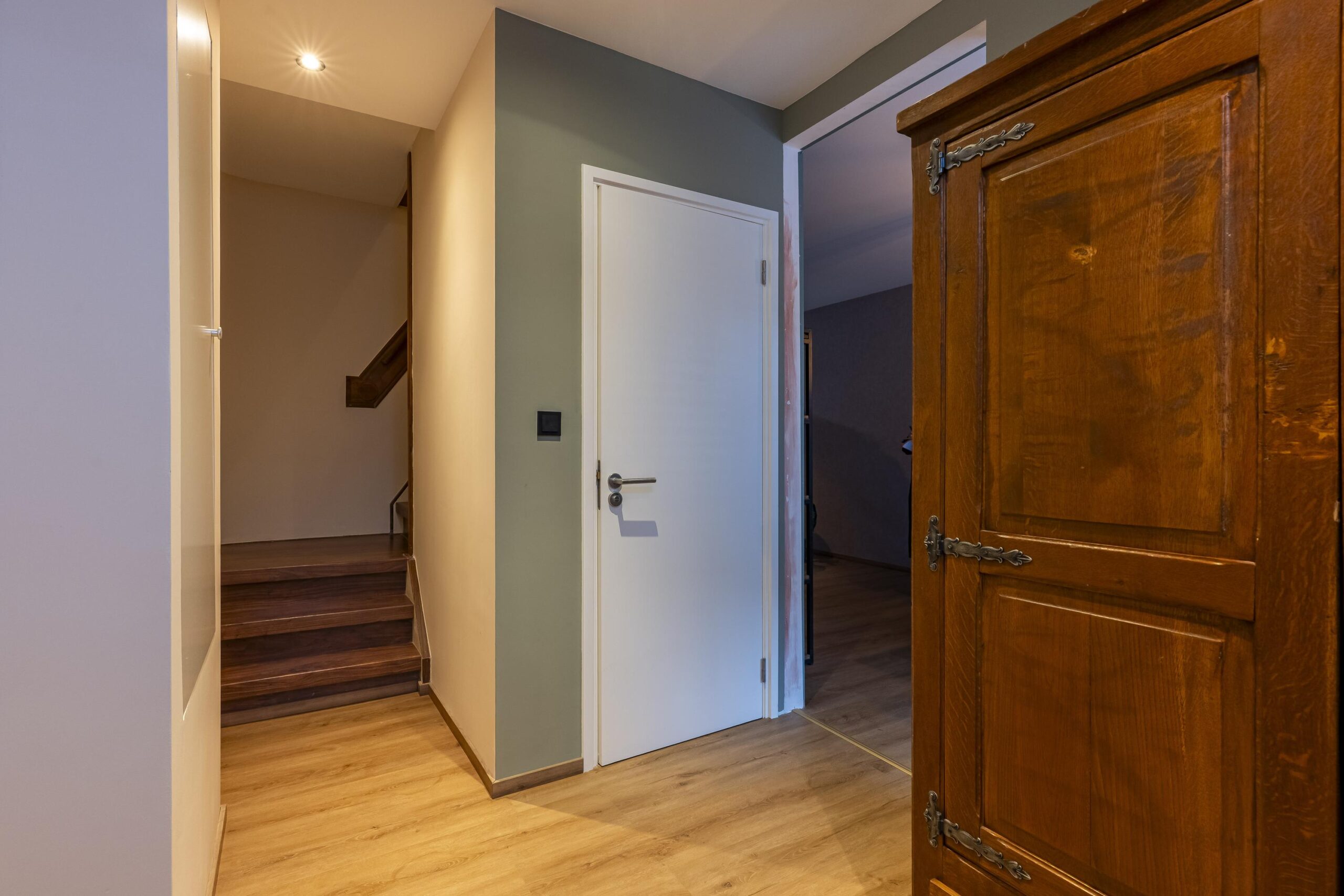 De trap naar de verdieping geeft toegang tot twee slaapkamers, de badkamer en drie inbouwkasten.