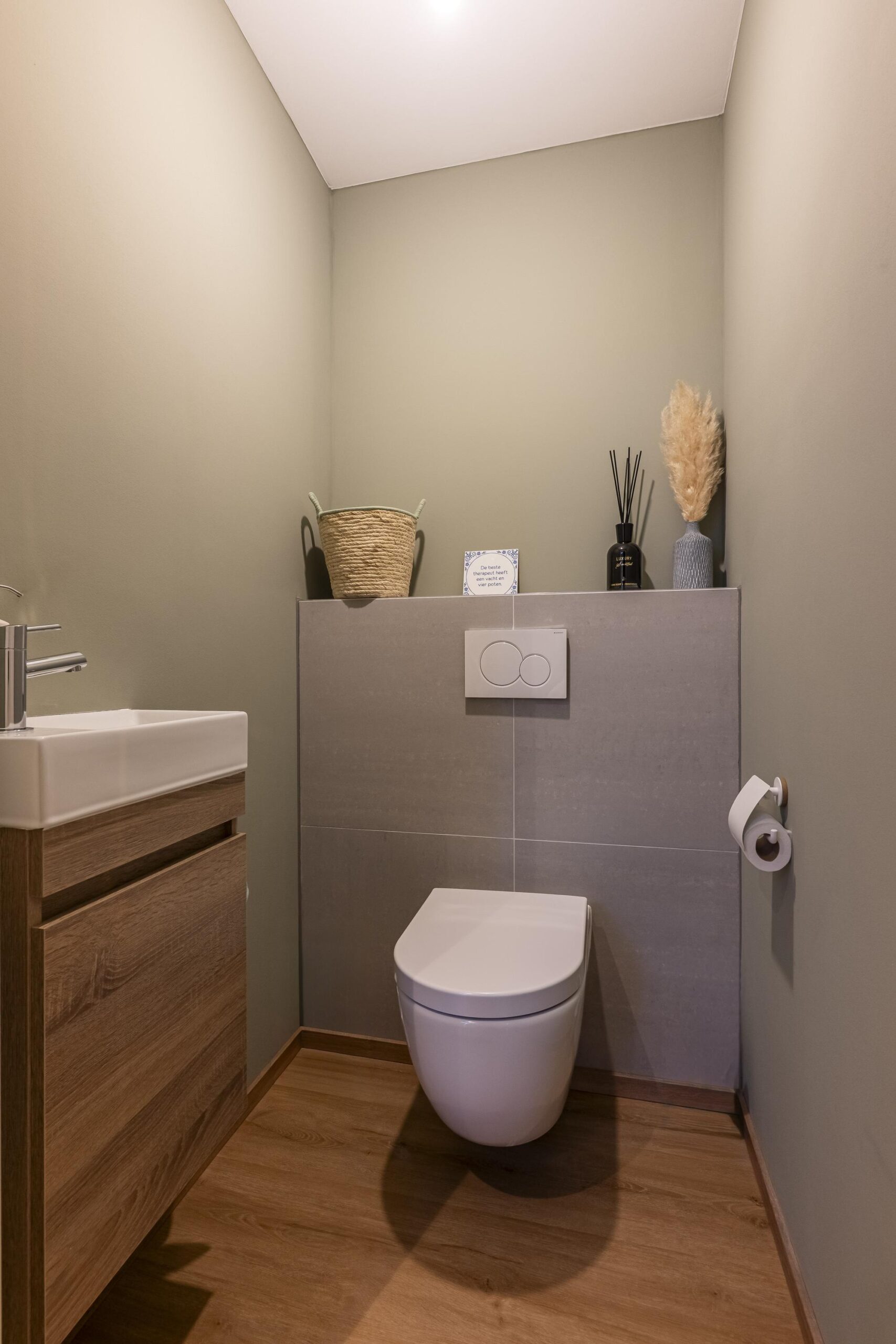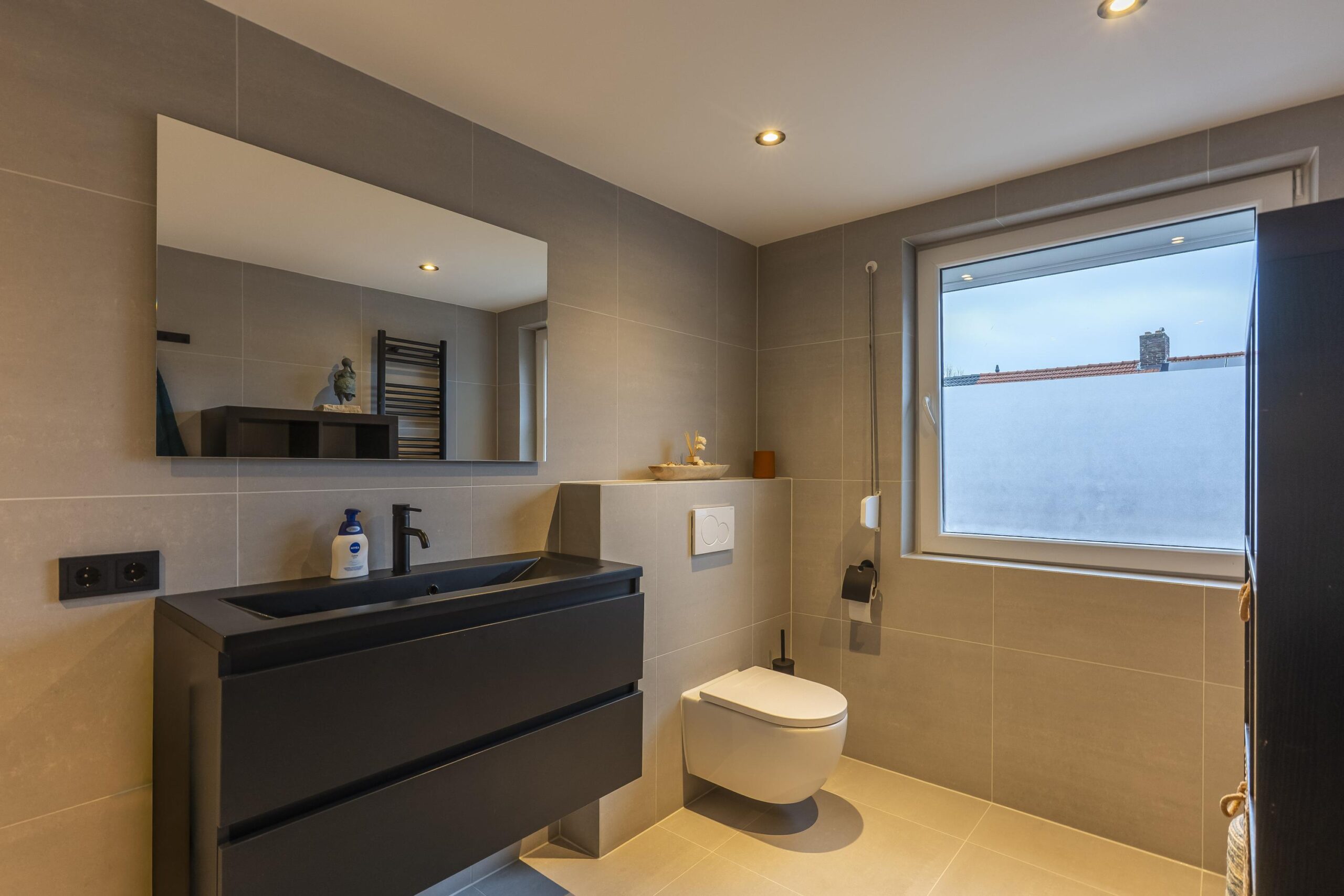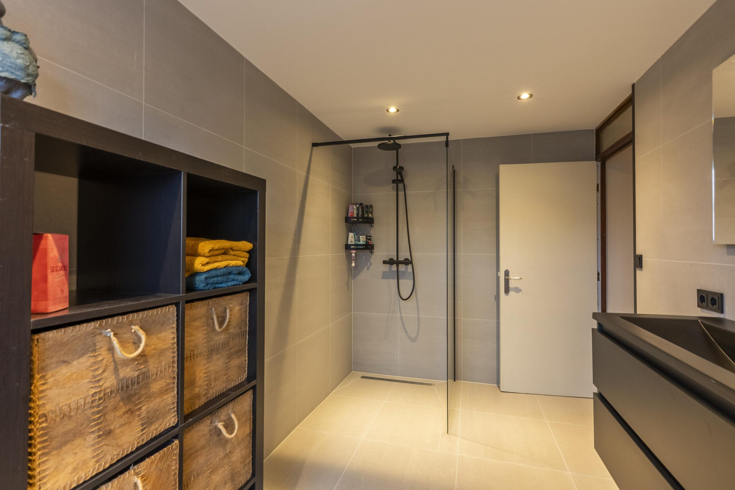 De moderne badkamer (2025) is volledig betegeld en uitgerust met een wastafel met ombouwmeubel, een inloopdouche met hardglazen wand en een tweede vrijhangend toilet.