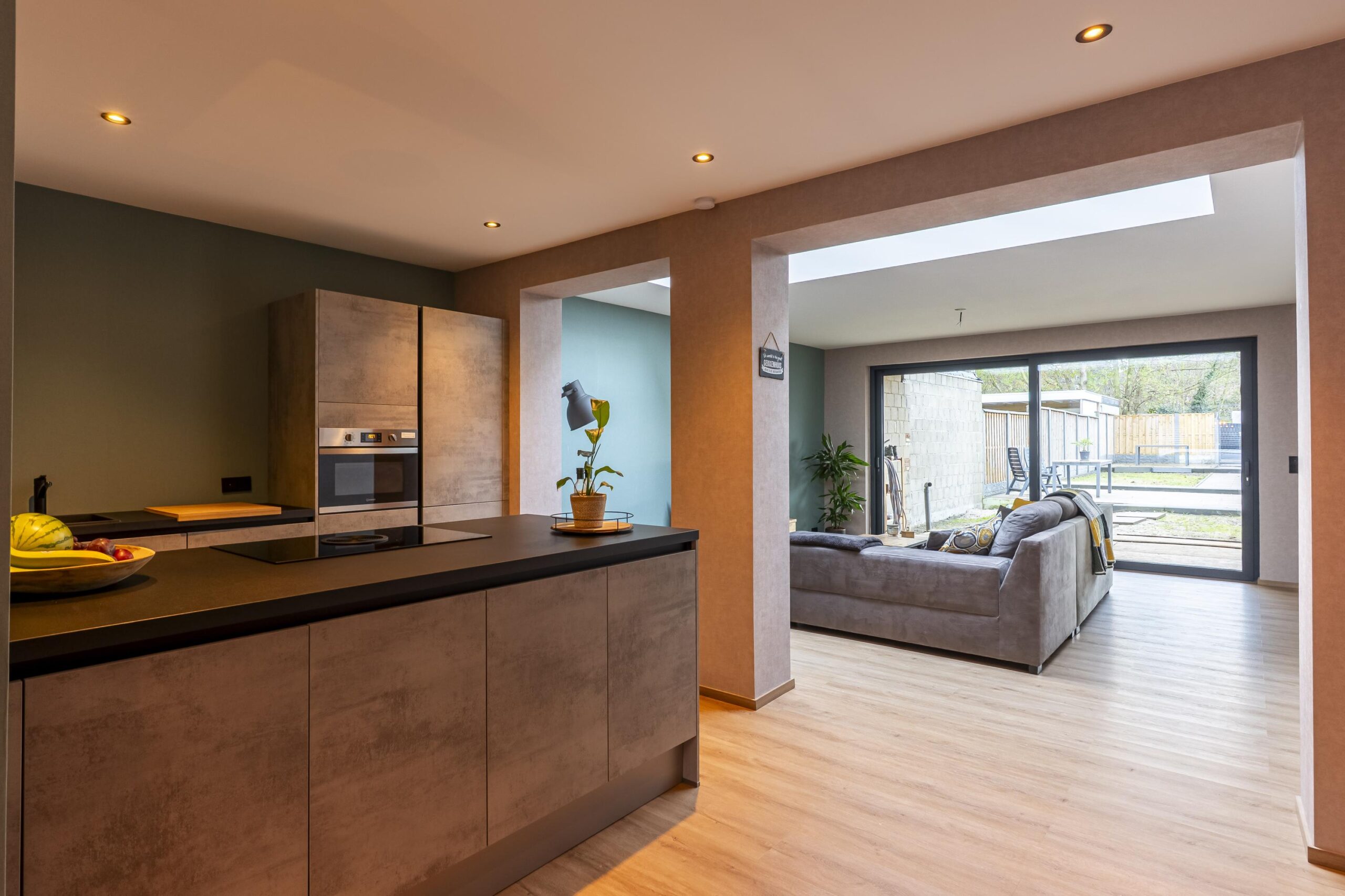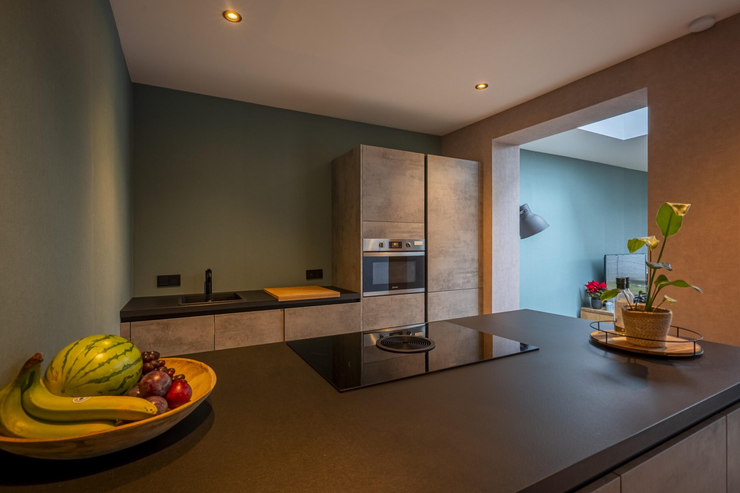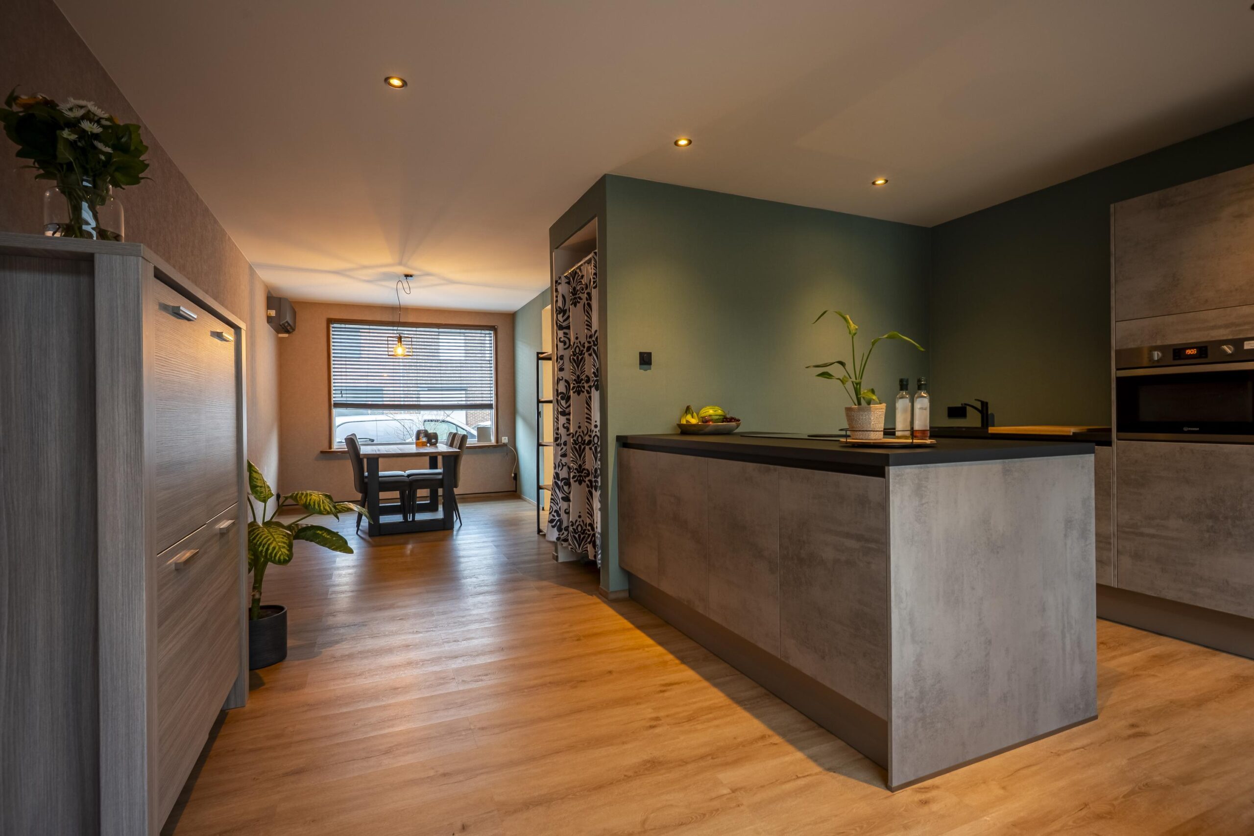 Aangrenzend bevindt zich de nieuwe, moderne keuken (geplaatst in 2025), uitgevoerd met een schiereiland, veel bergruimte en hoogwaardige apparatuur, waaronder een Bora-inductiekookplaat met geïntegreerde afzuiging, koel-/vriescombinatie, vaatwasser, oven en spoelbak. De keuken is geheel voorzien van inbouwverlichting en een plintboiler.