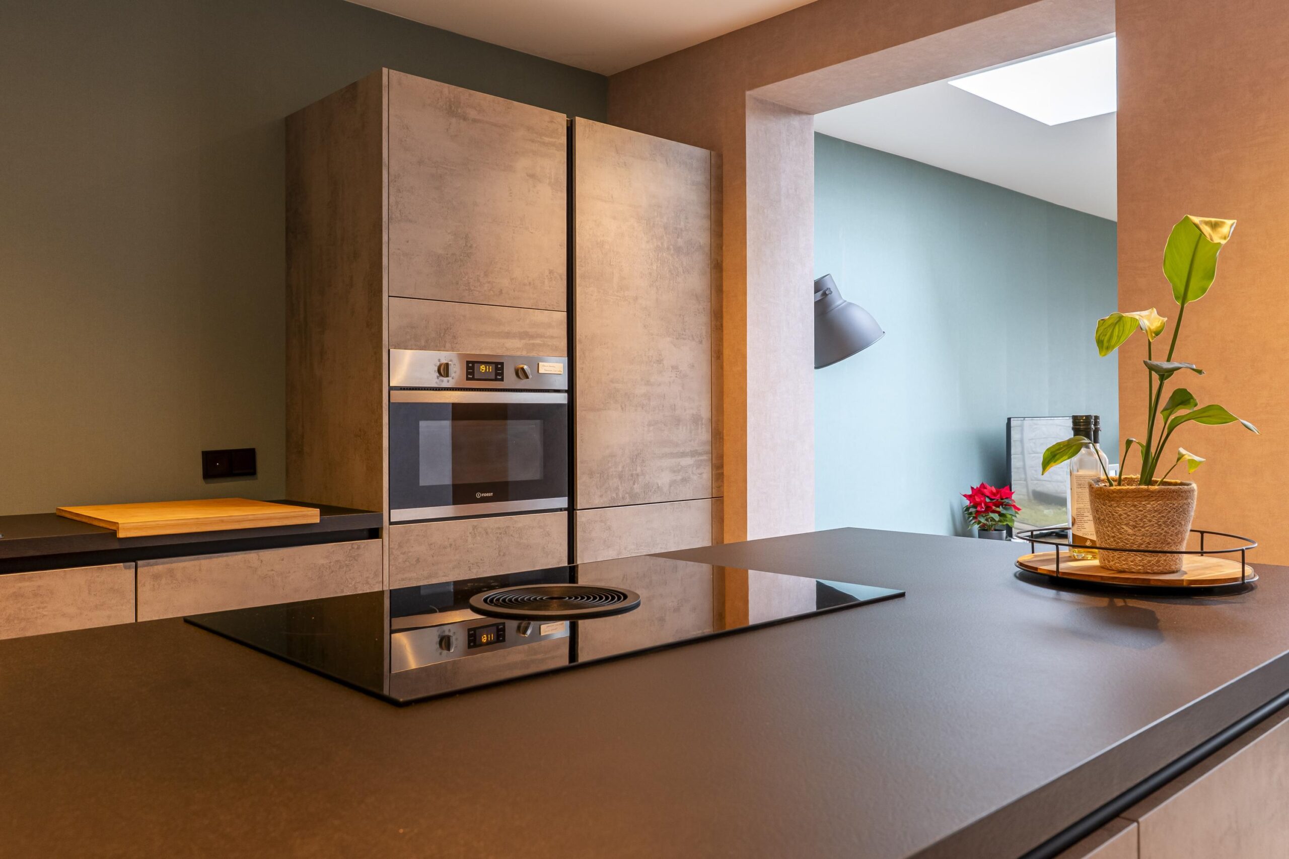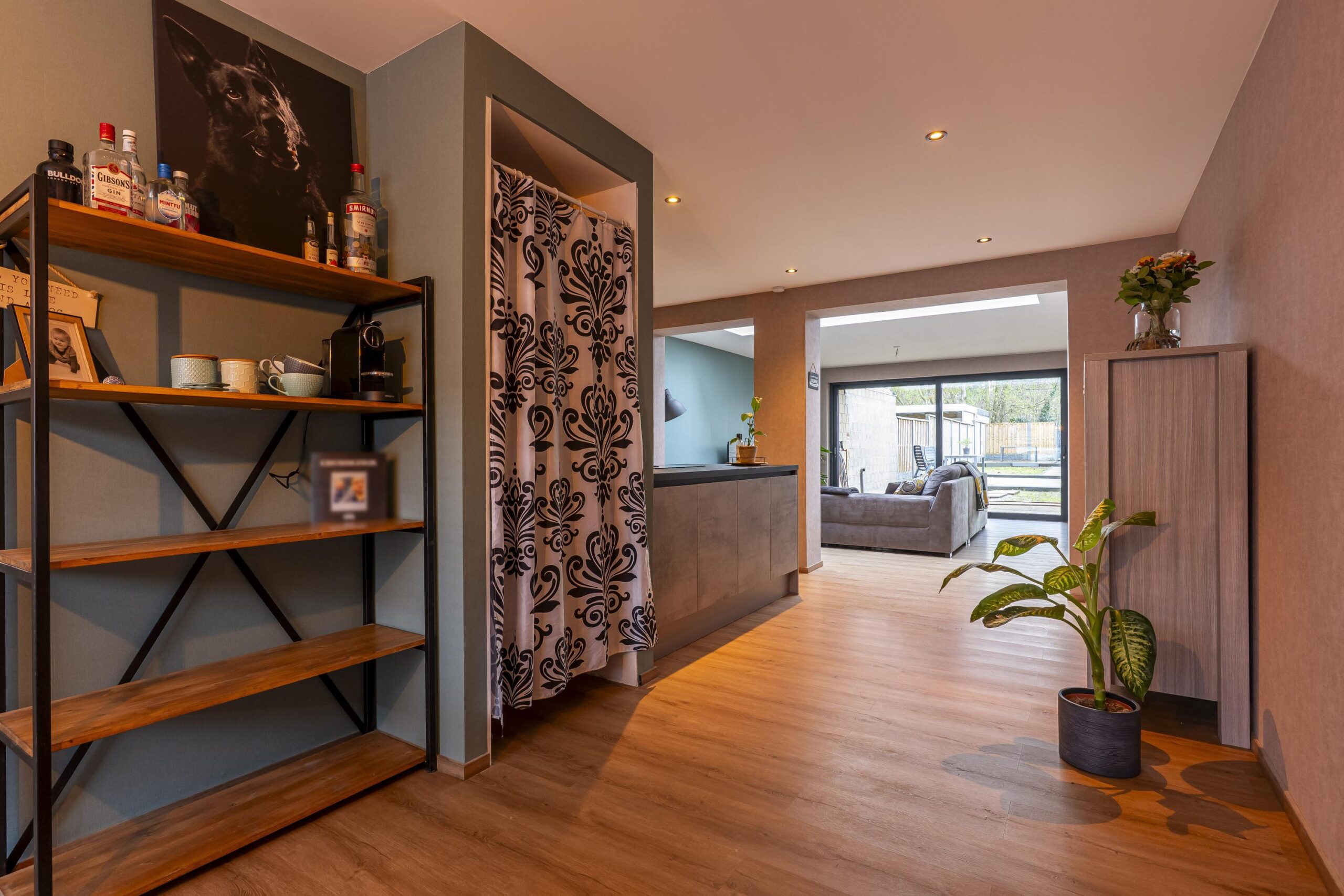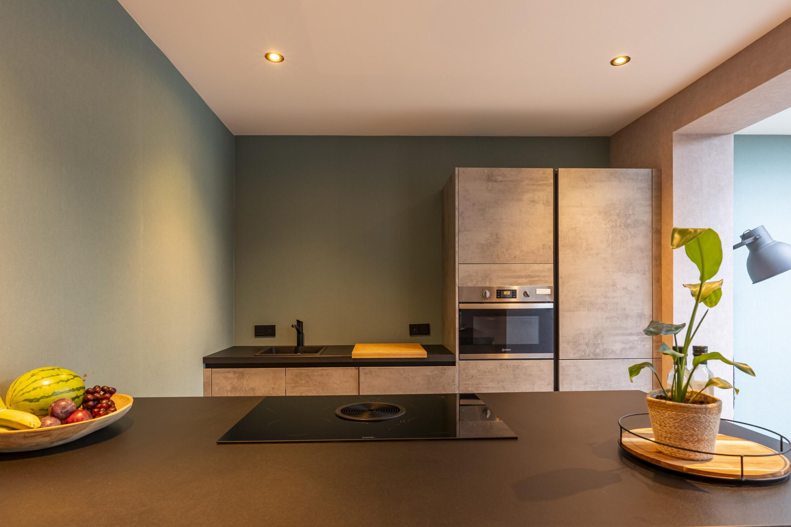 Aangrenzend bevindt zich de nieuwe, moderne keuken (geplaatst in 2025), uitgevoerd met een schiereiland, veel bergruimte en hoogwaardige apparatuur, waaronder een Bora-inductiekookplaat met geïntegreerde afzuiging, koel-/vriescombinatie, vaatwasser, oven en spoelbak. De keuken is geheel voorzien van inbouwverlichting en een plintboiler.