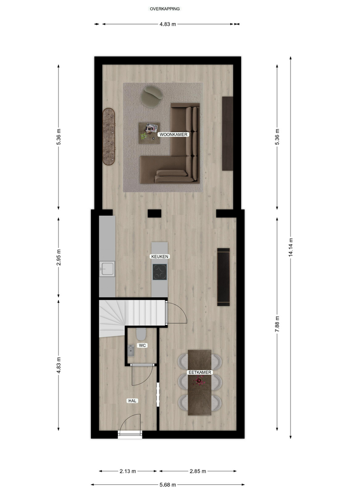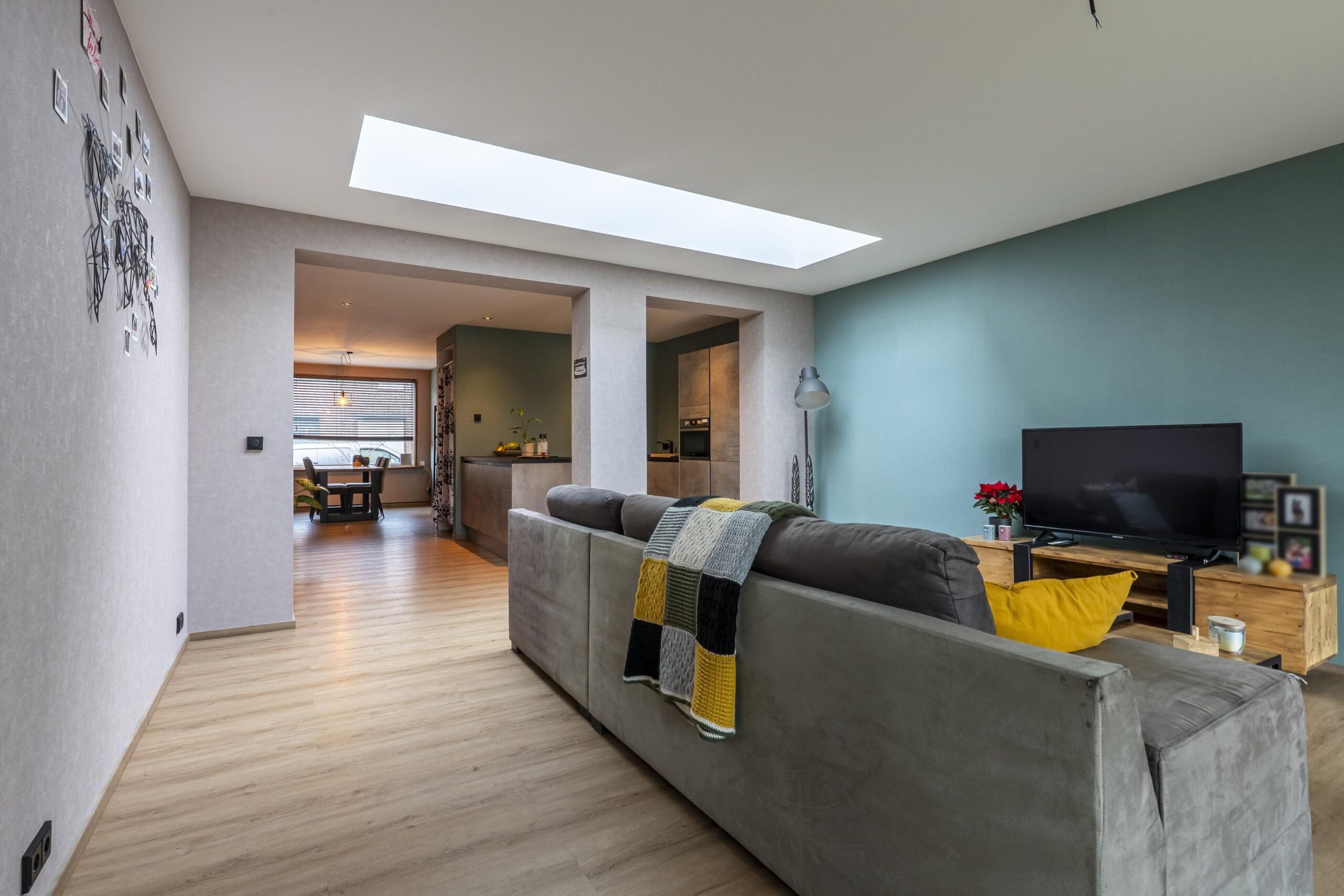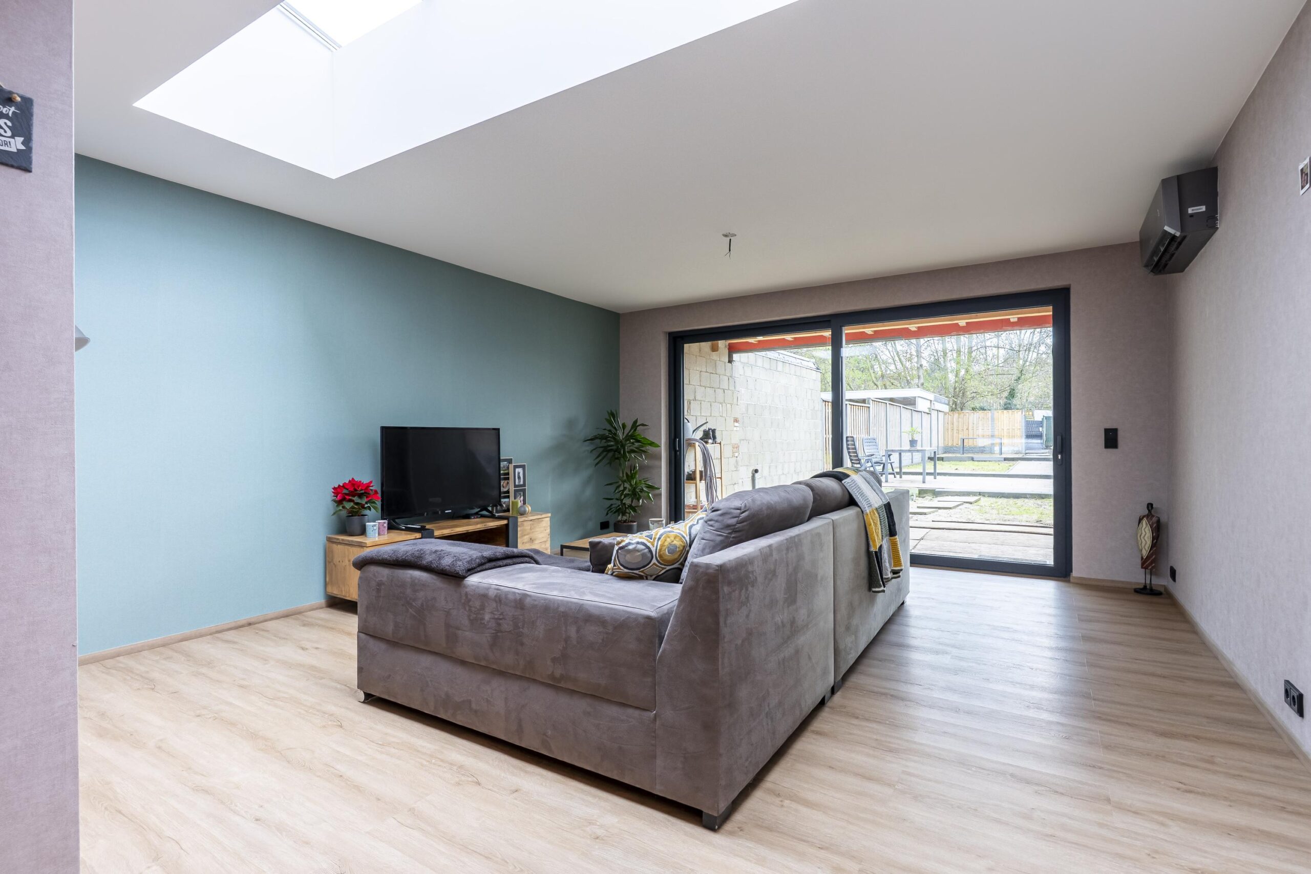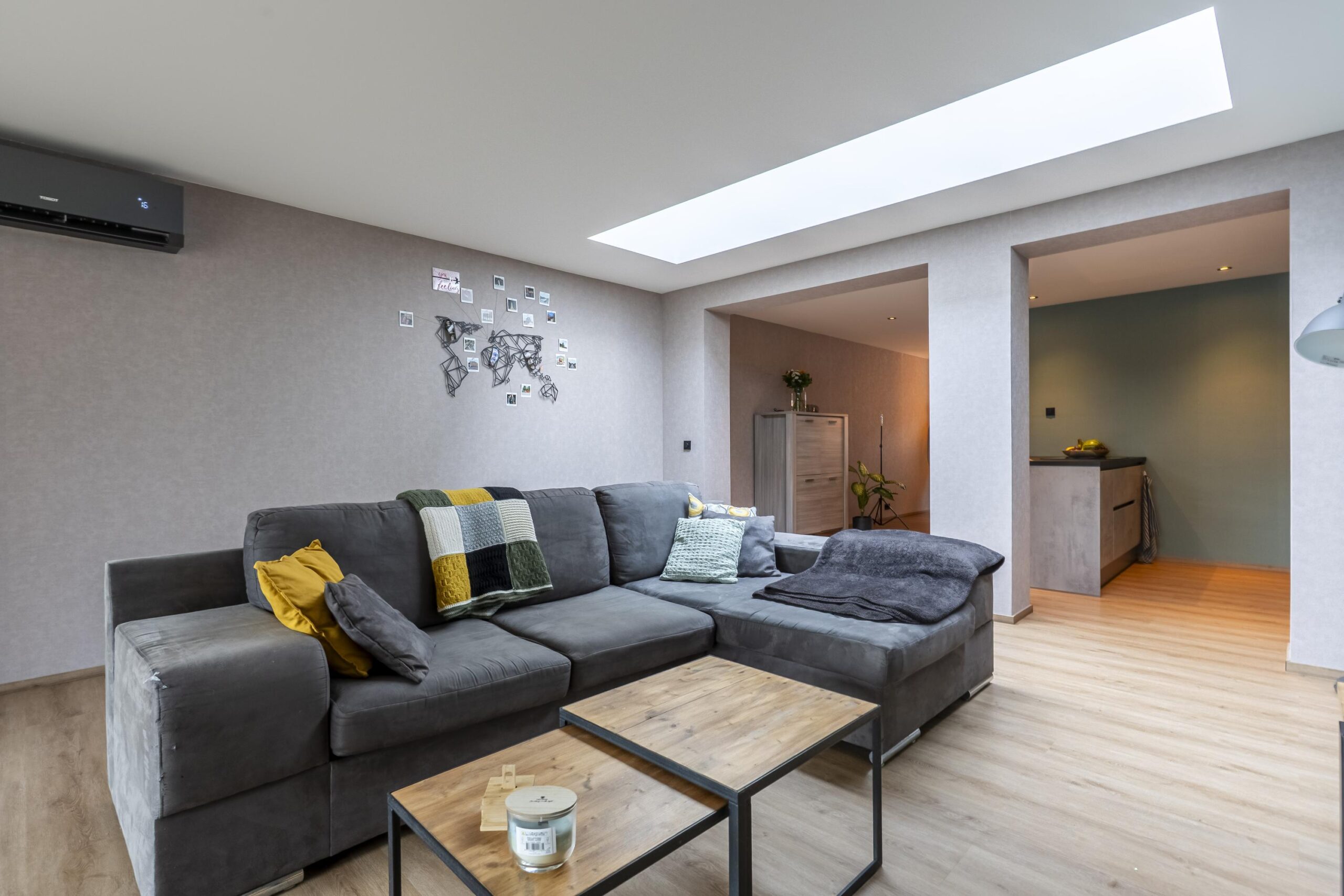 De ruime woonkamer beschikt over een grote aluminium pui en lichtstraat, waardoor er veel daglicht binnenvalt. Er is ruim voldoende plek voor een comfortabele zithoek. De volledige begane grond is afgewerkt met een pvc-vloer. Verwarming vindt plaats via airconditioning.