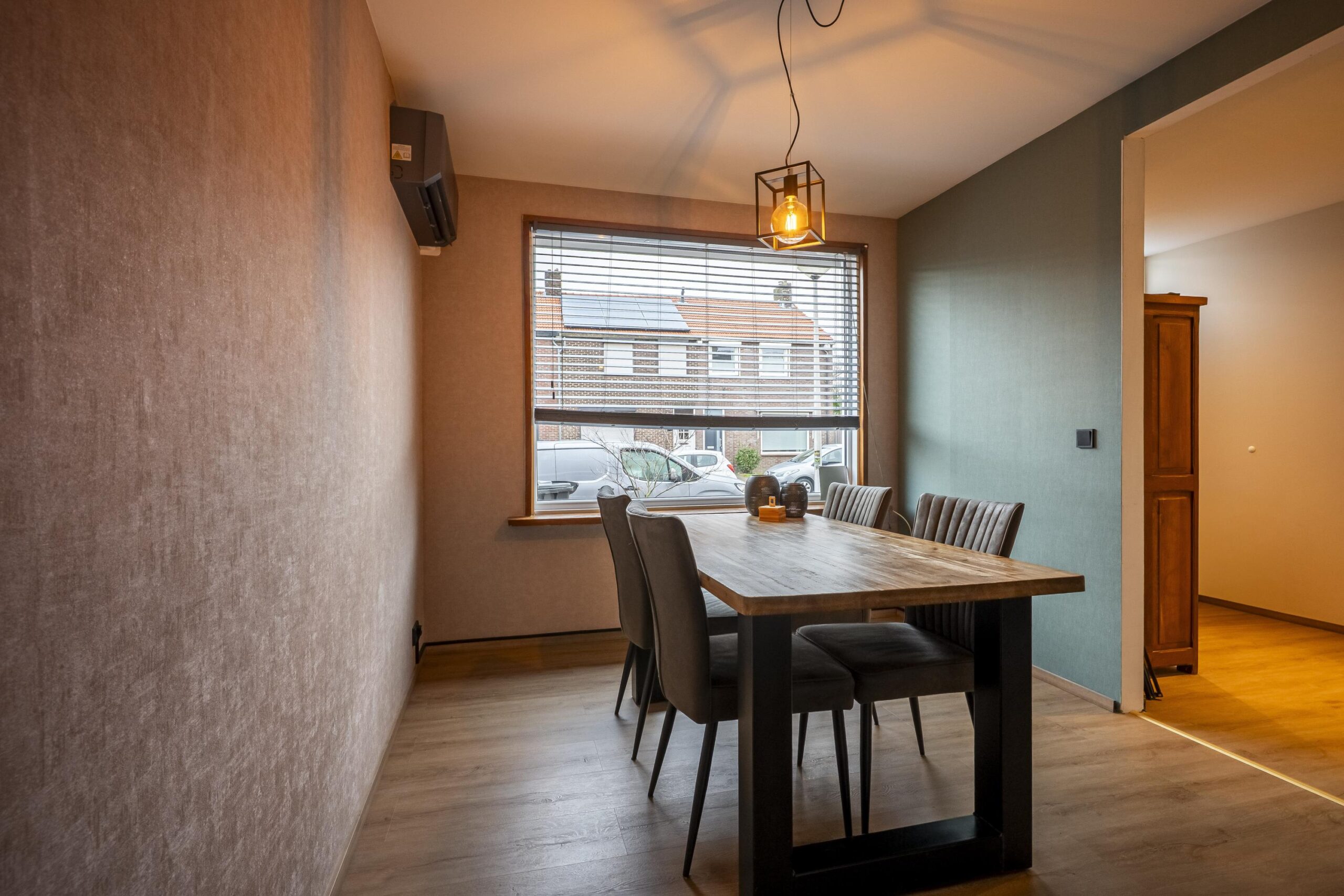 Onderhoudsvriendelijke voortuin met toegang tot de tussenwoning. Via de entree/hal met ingebouwde verlichting, trap naar de verdieping, meterkast en toilet (voorzien van een vrijhangend closet en fontein) bereikt u de eetkamer met uitzicht op de voorzijde van de woning. De ruimte biedt plaats aan een royale eettafel.