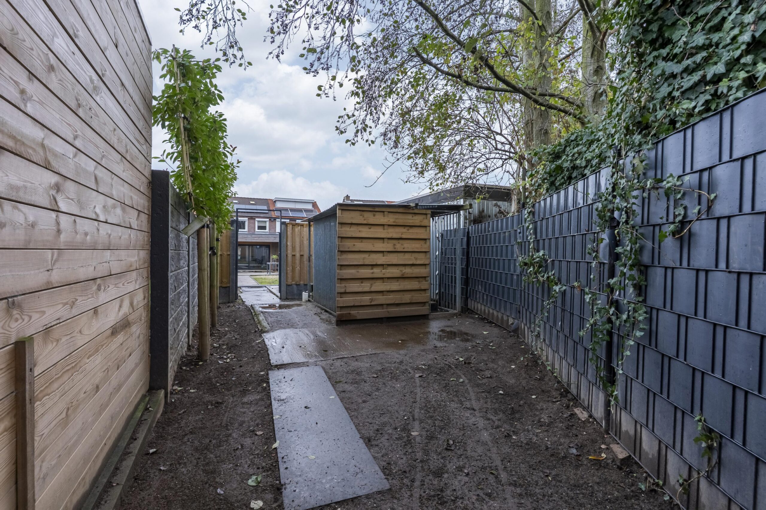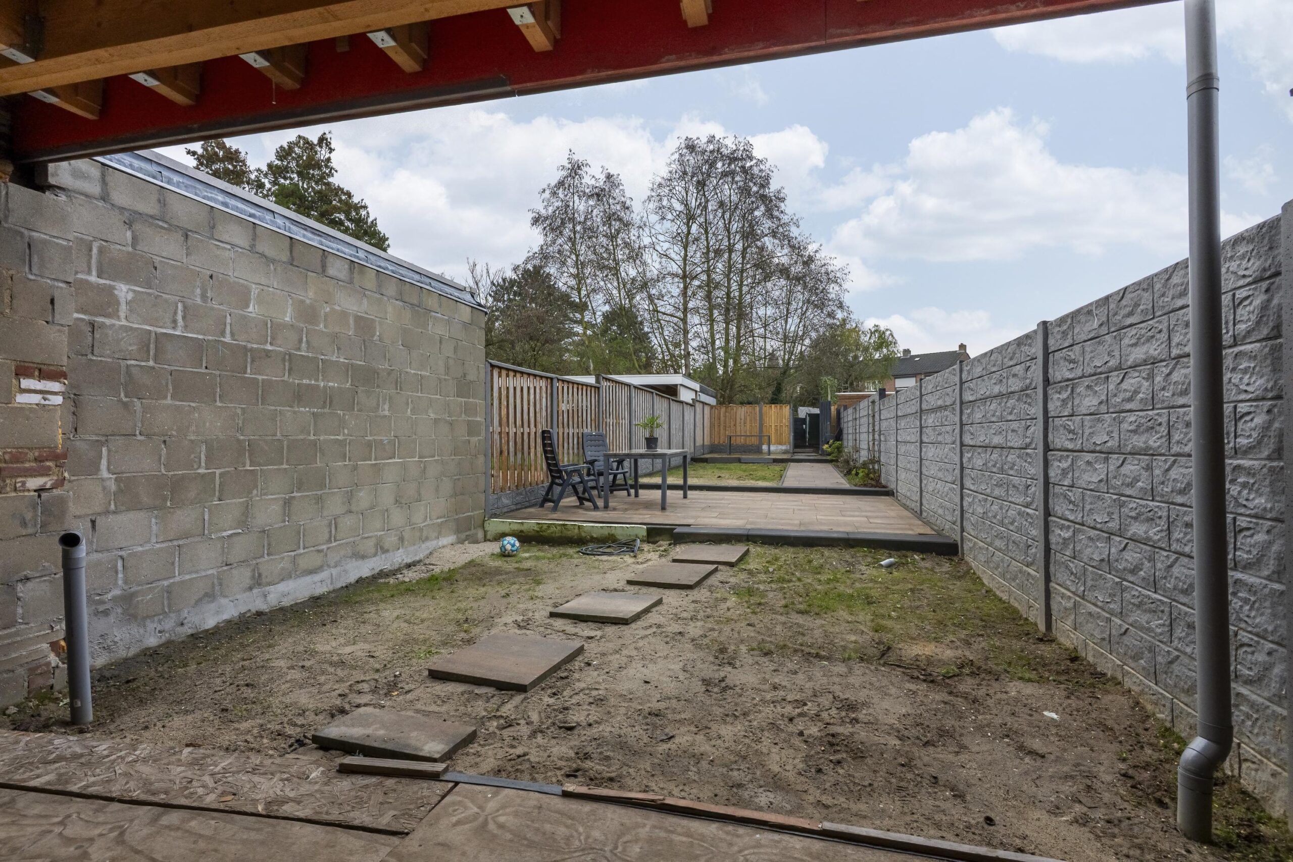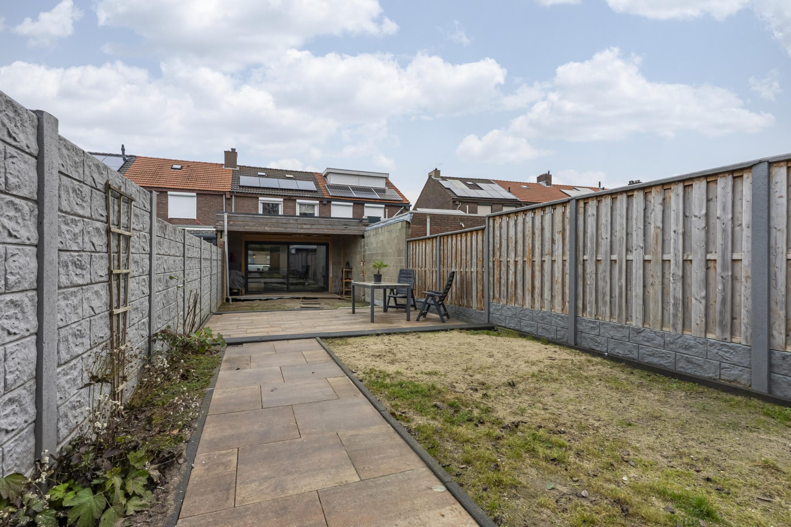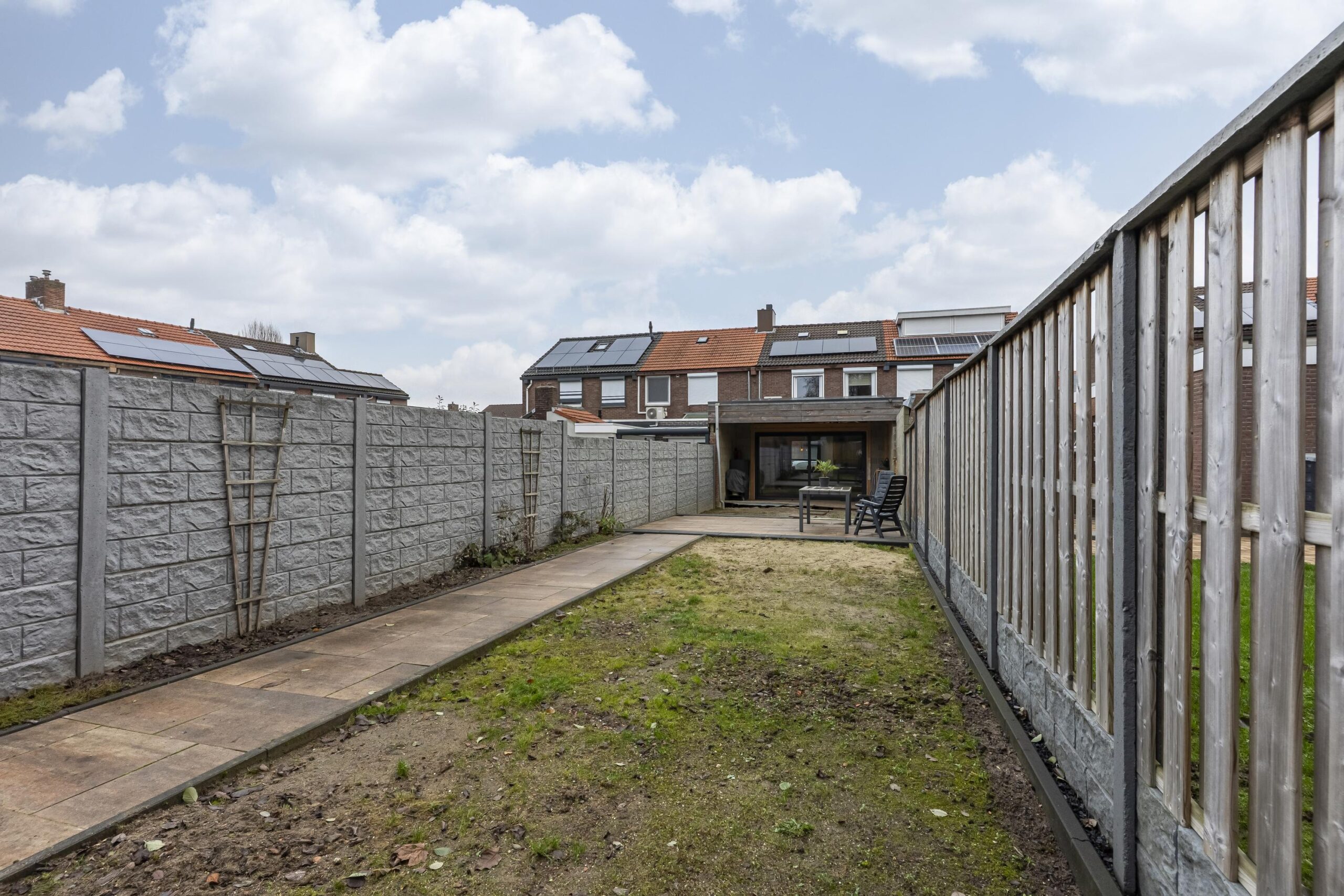 Aan de achterzijde bevindt zich een overkapping over de volledige breedte van de woning. De tuin is meer dan 30 meter diep en is ingericht met meerdere terrassen en beplantingsvakken. Daarnaast is de tuin voorzien van afwatering en diverse elektrapunten.