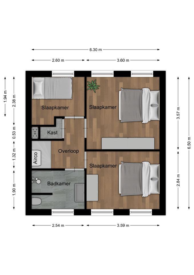 Overloop. Drie slaapkamers (resp. ca. 12.8 m², 10.2m² en 5.5m²), allen voorzien van laminaatvloeren. Moderne badkamer (ca. 4.9m²) met douche, toilet en badmeubel met wastafel. Op de overloop is een airco geplaatst.